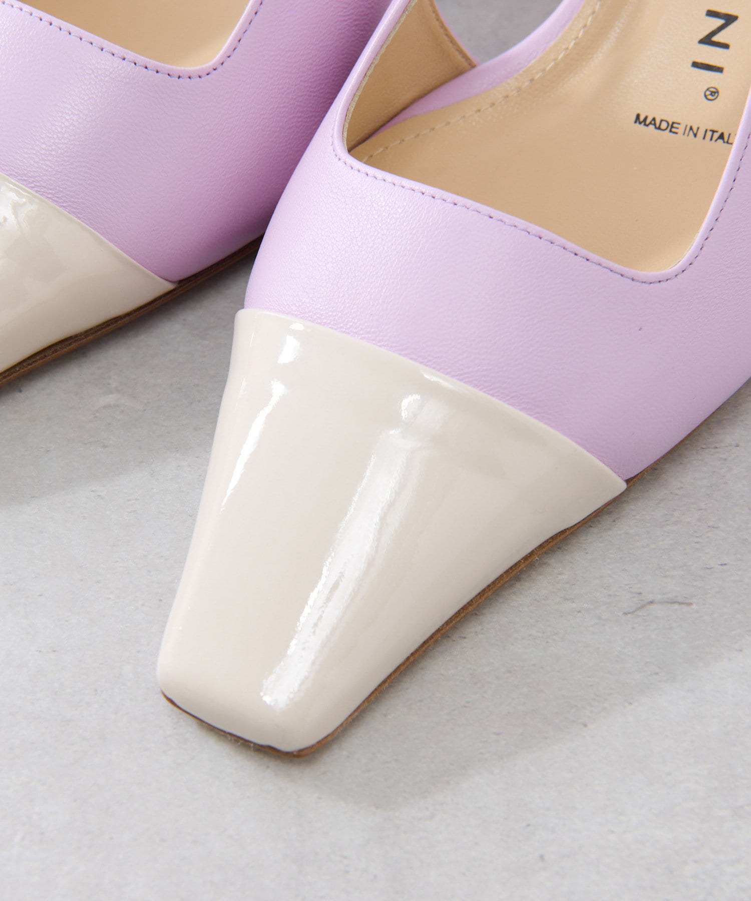 つま先のスクエア部分はバイカラーになっており、スタイリングにアクセントをプラスしてくれるアイテムです。