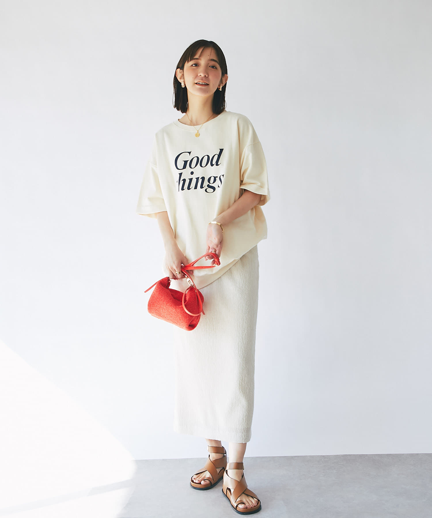 シンプルなトップスと合わせた、スカートが主役のコーディネートがおすすめ。