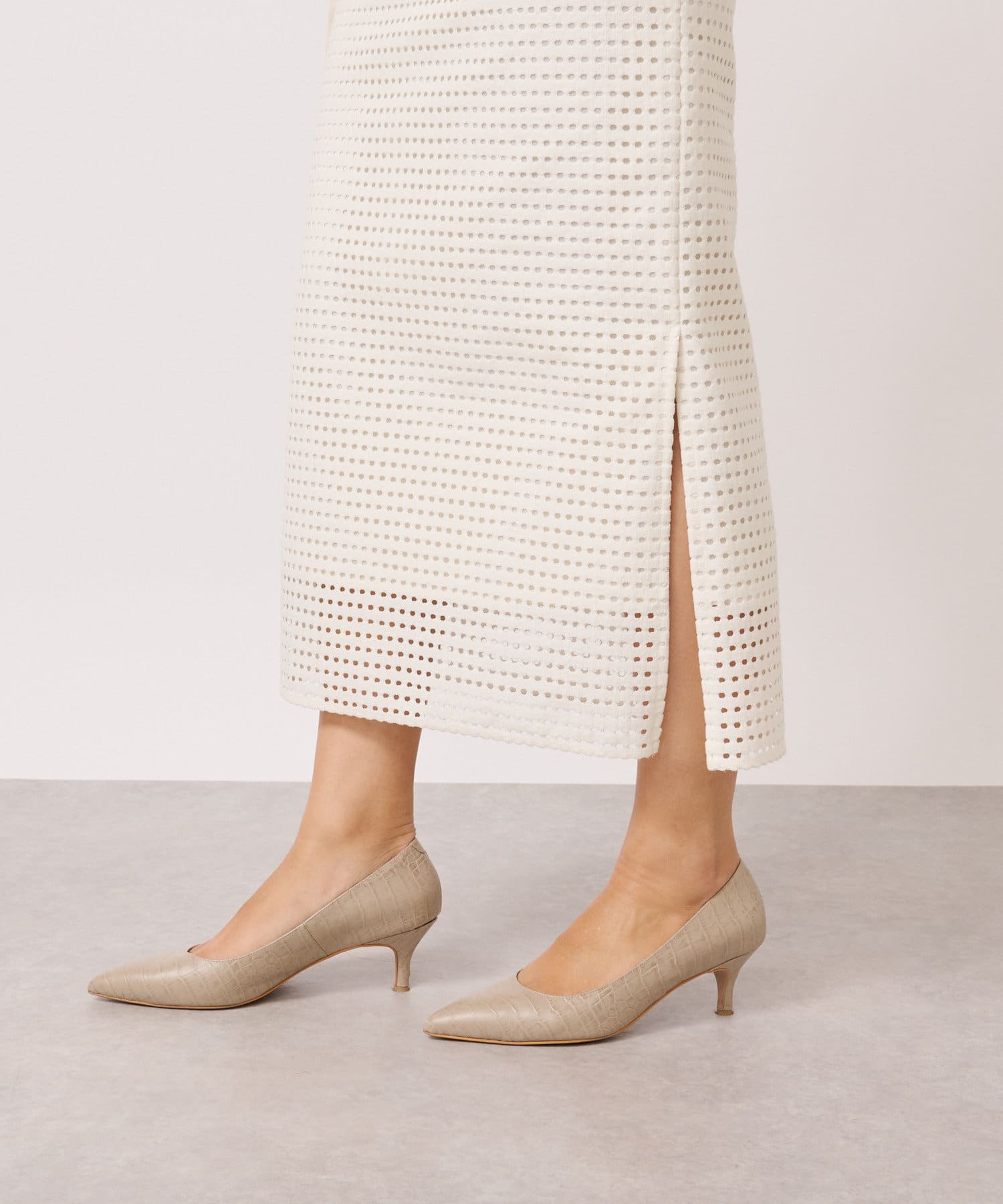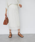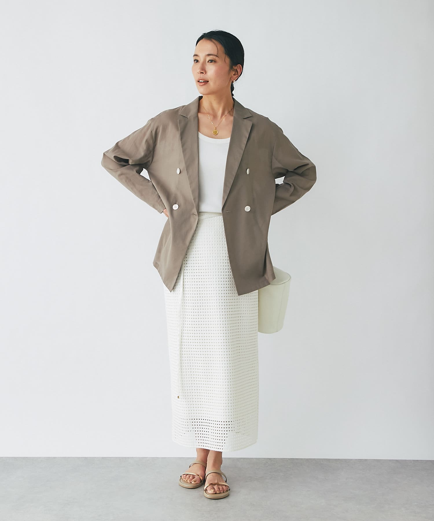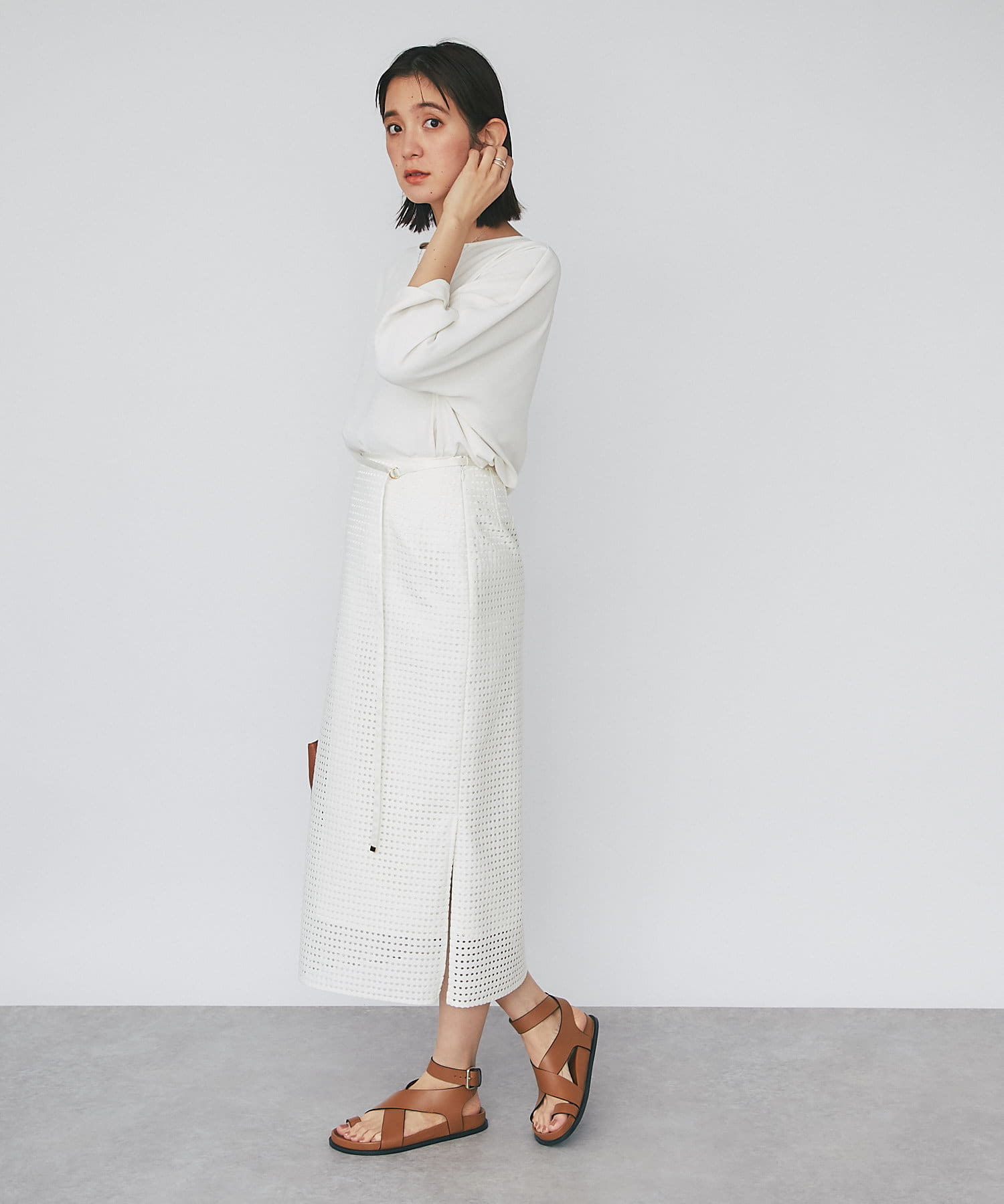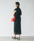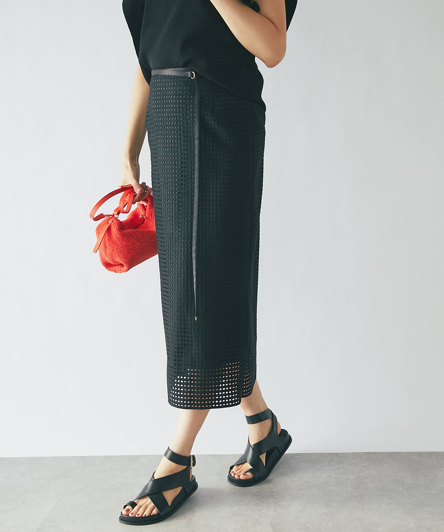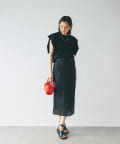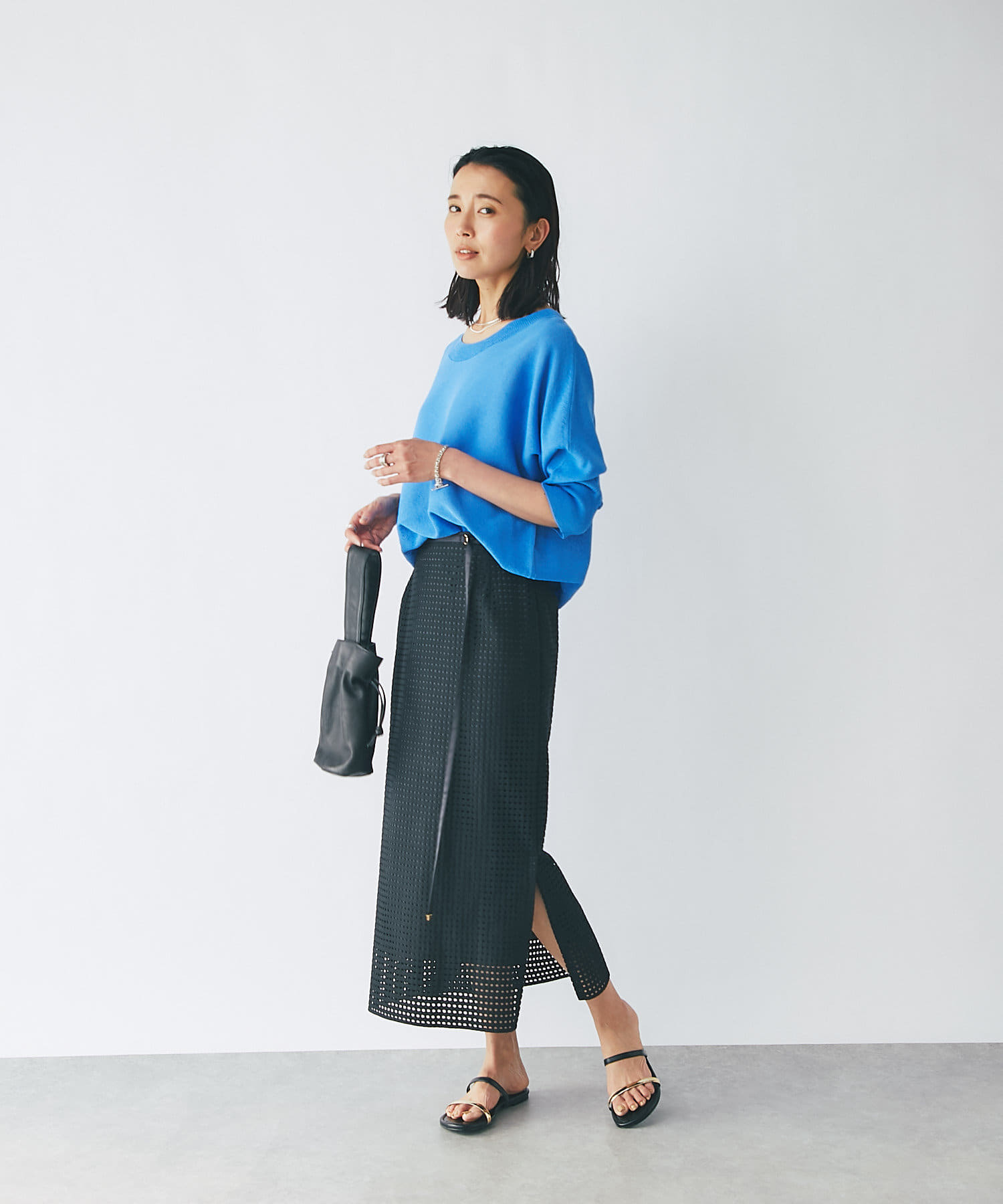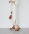 膝位置まで切れ込んだサイドスリット入りで、素足でヘルシーに着こなすのが今季風。