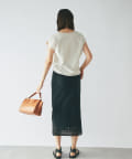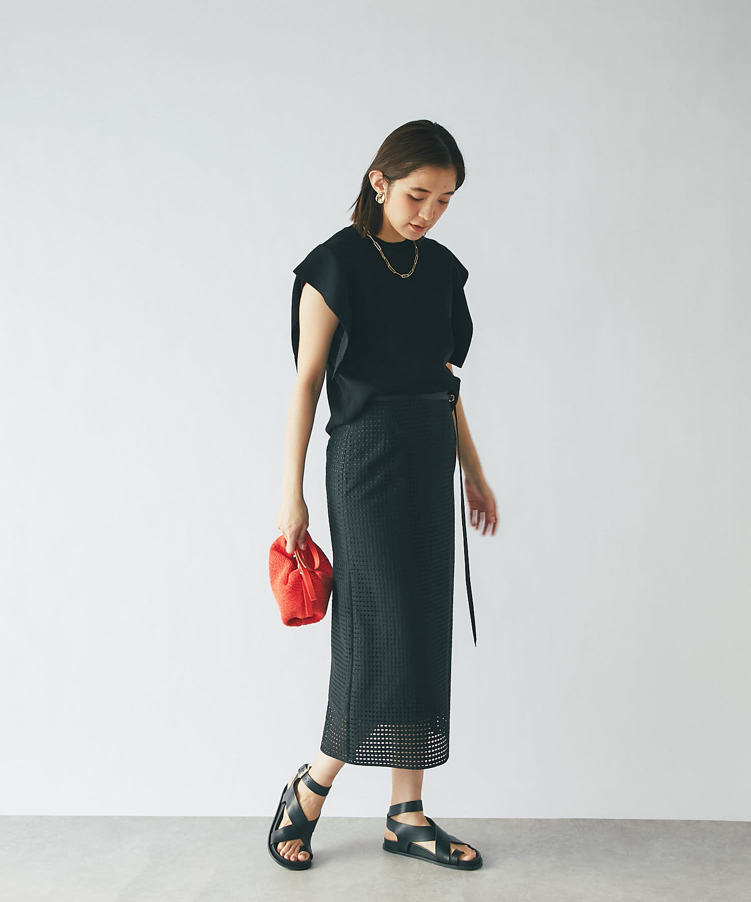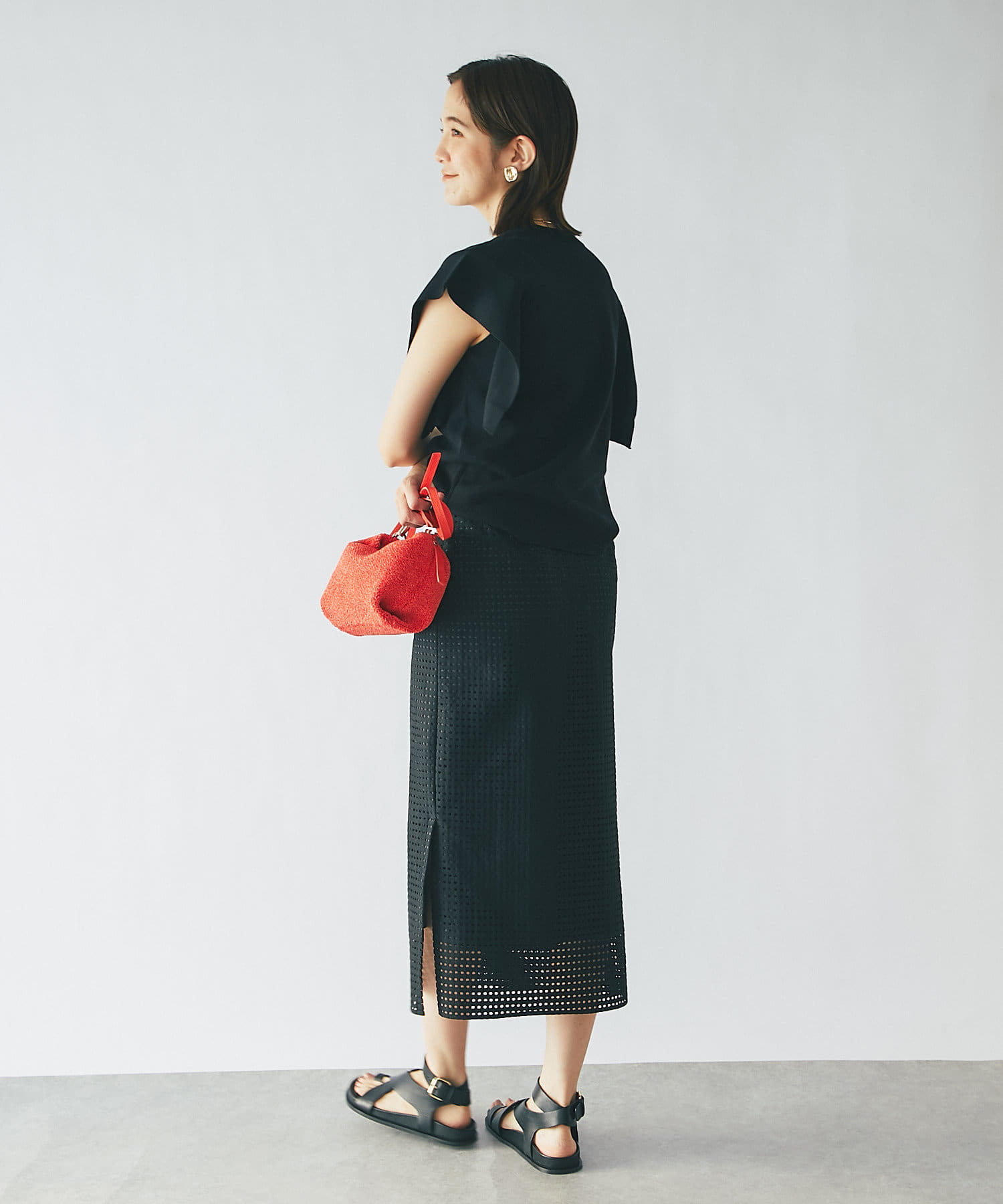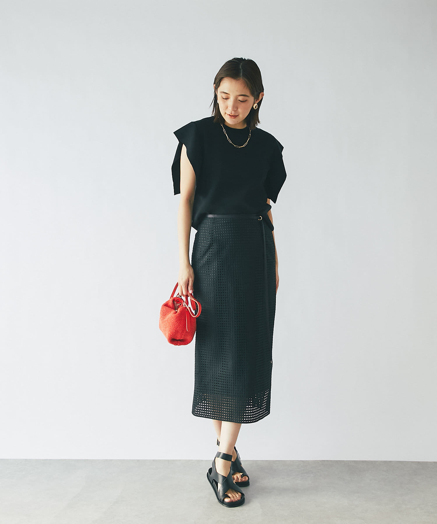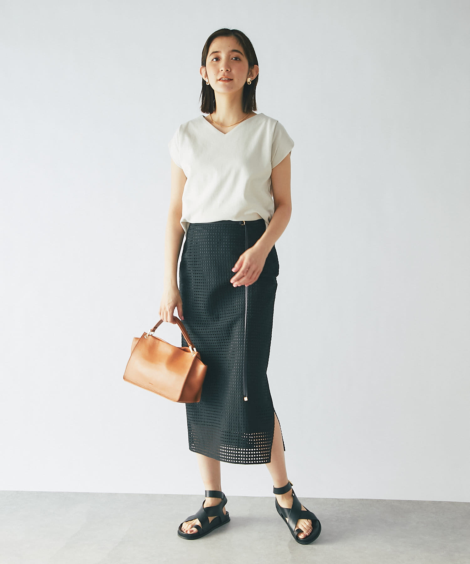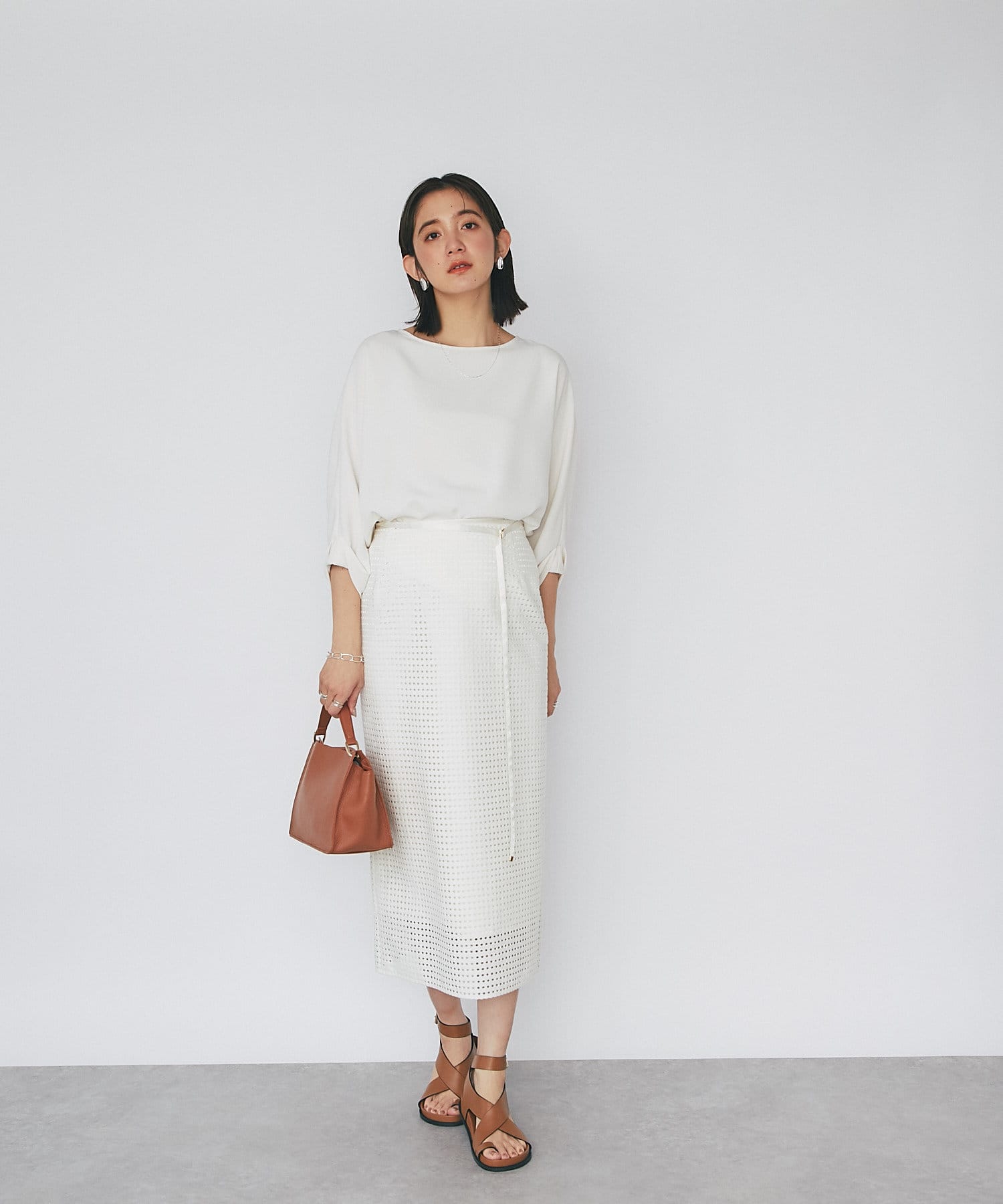 スッキリしたIラインスカートは、トップスもシンプルにまとめて全体をIラインシルエットにするのがアップデートポイント。