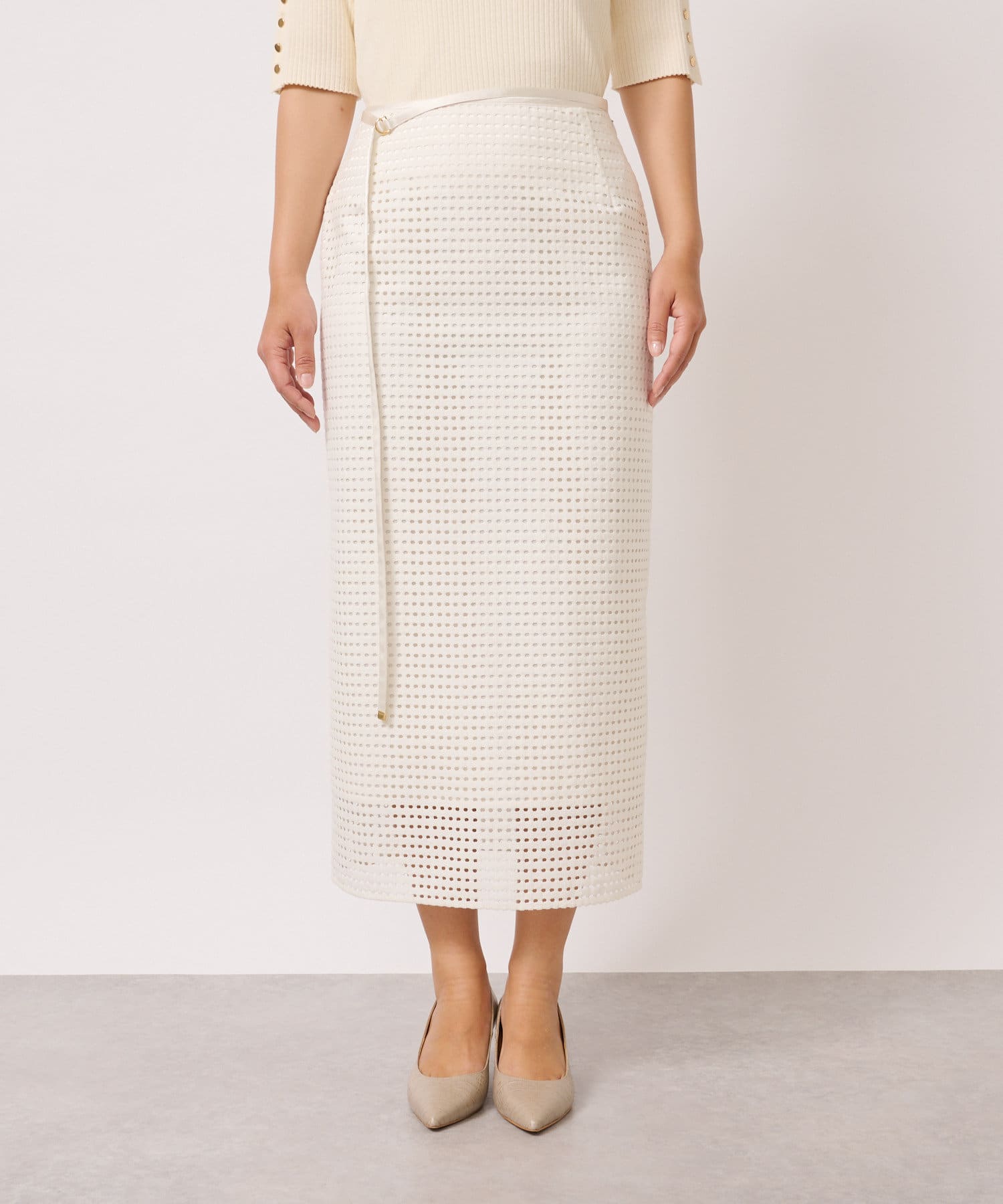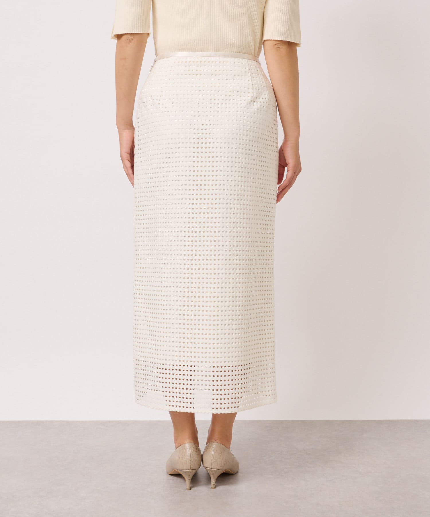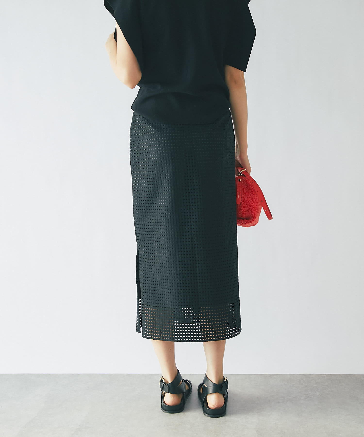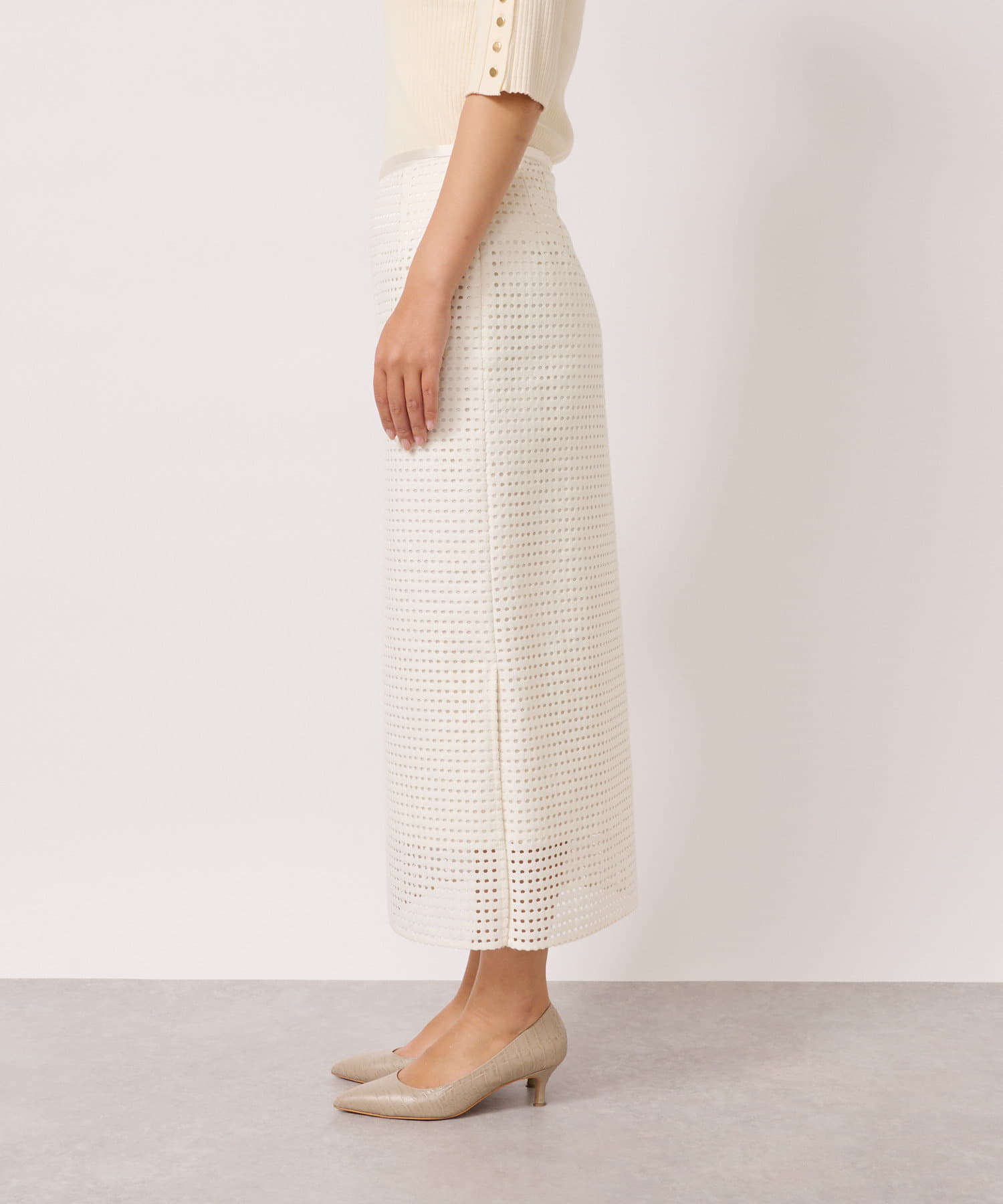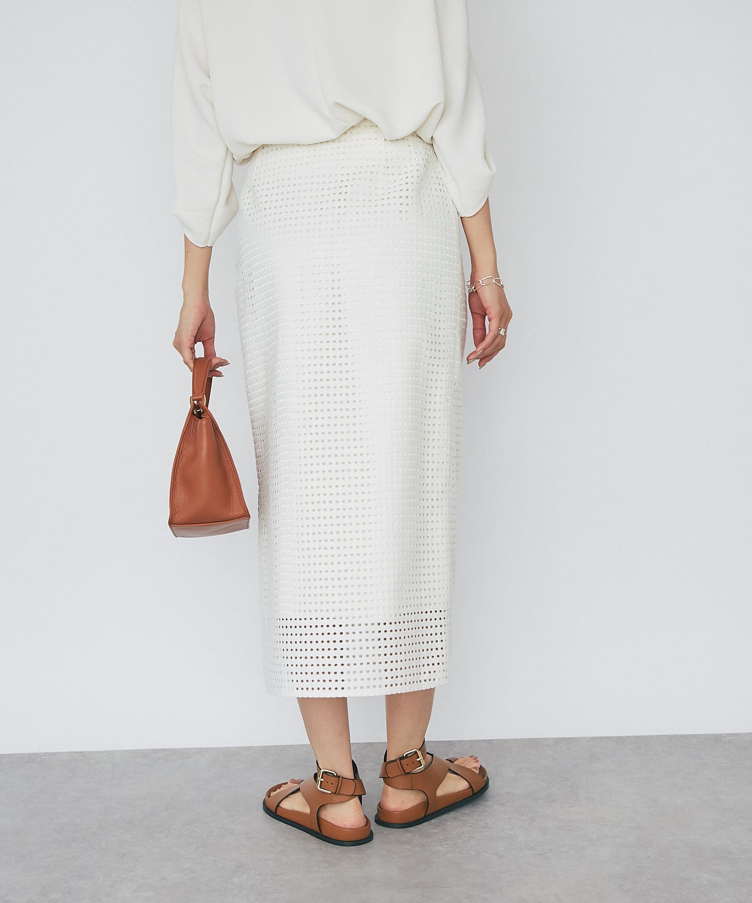 幾何学的に並んだドット柄が印象的なIラインのタイトスカート。
