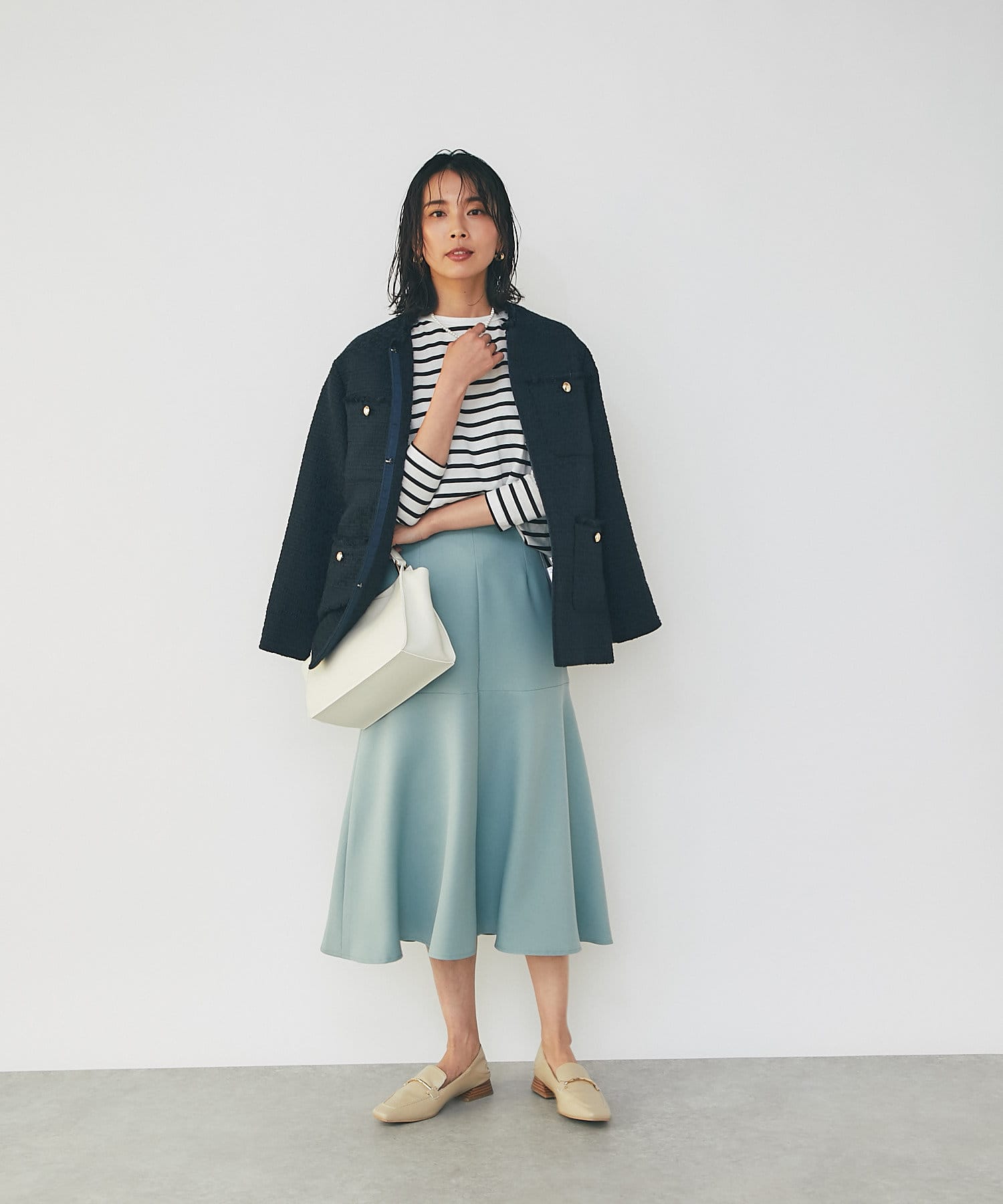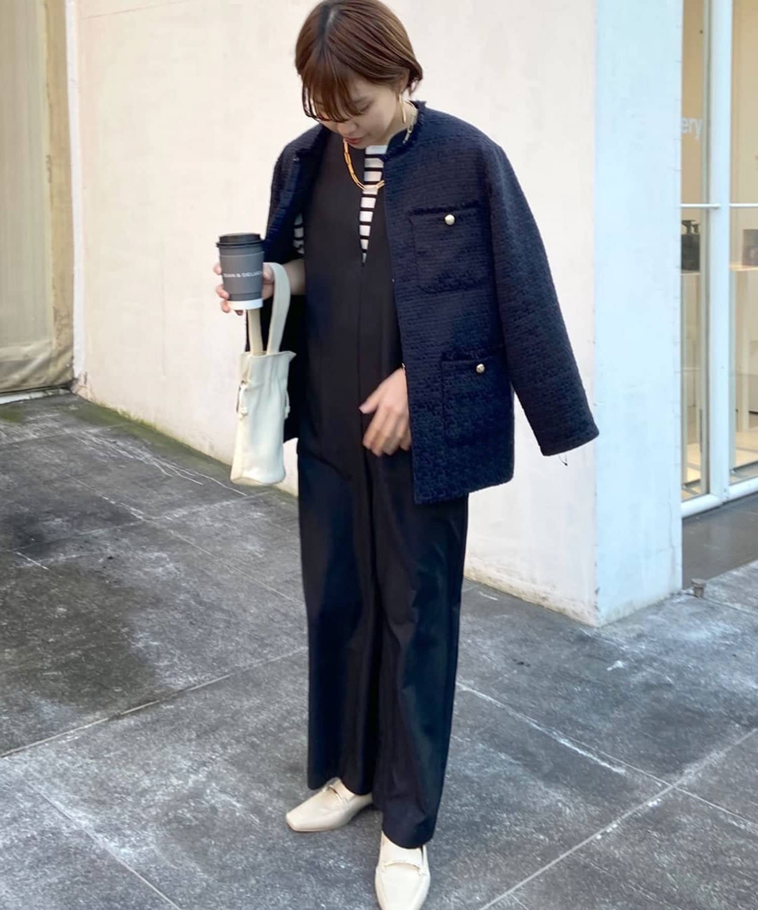 主役アイテムとしてパンツやスカートと組み合わせたシンプルなスタイルのほか、デニムジャケットやツイードジャケットと合わせるコーディネートがおすすめ。