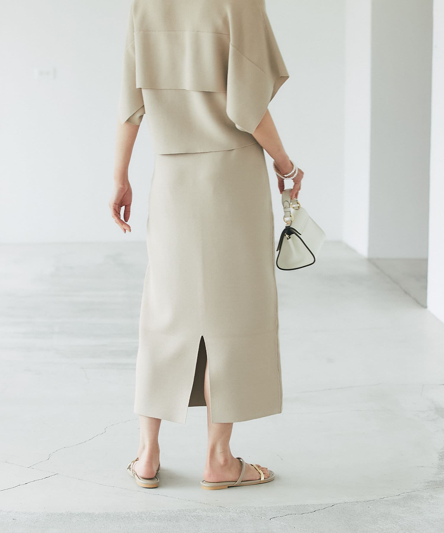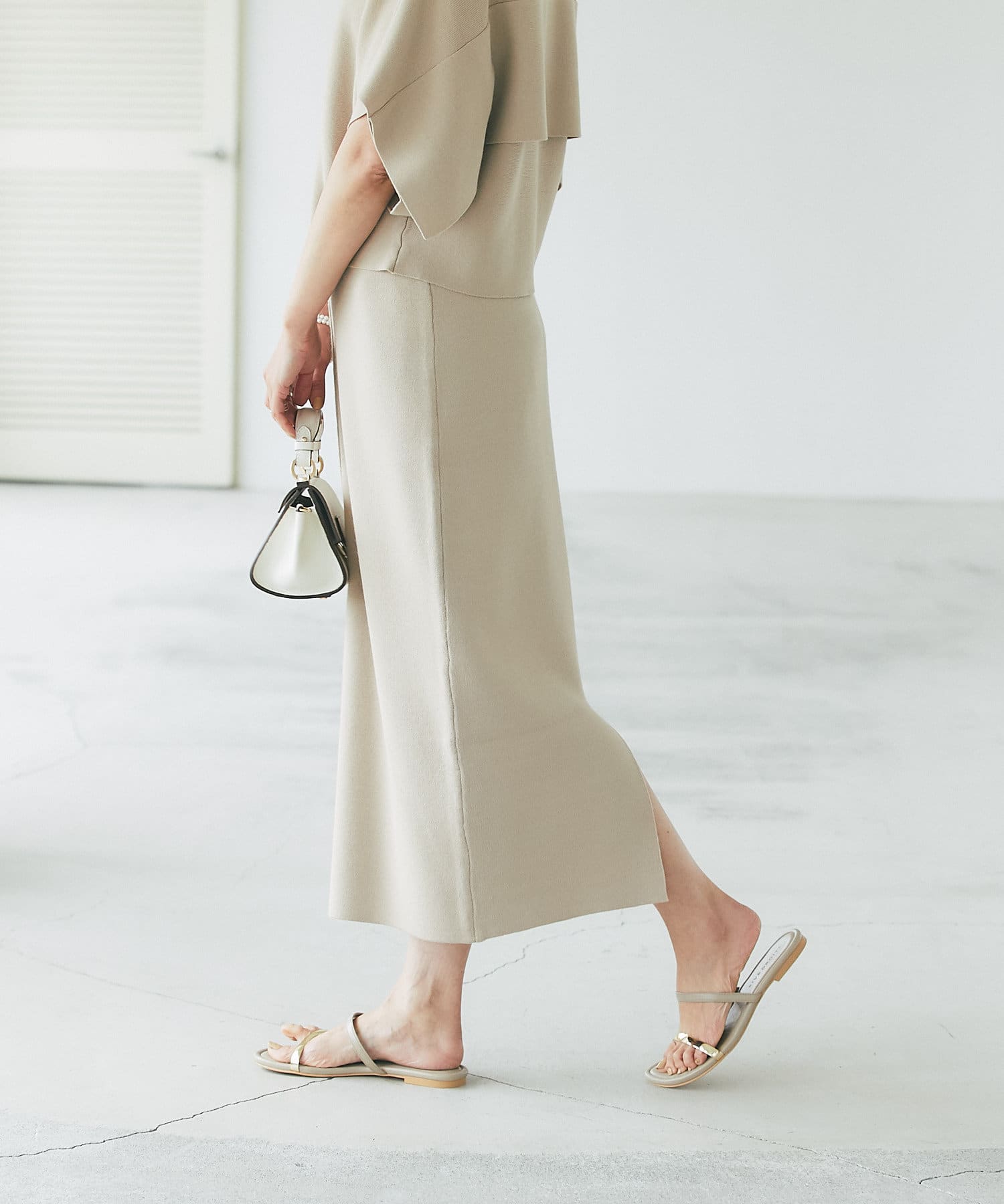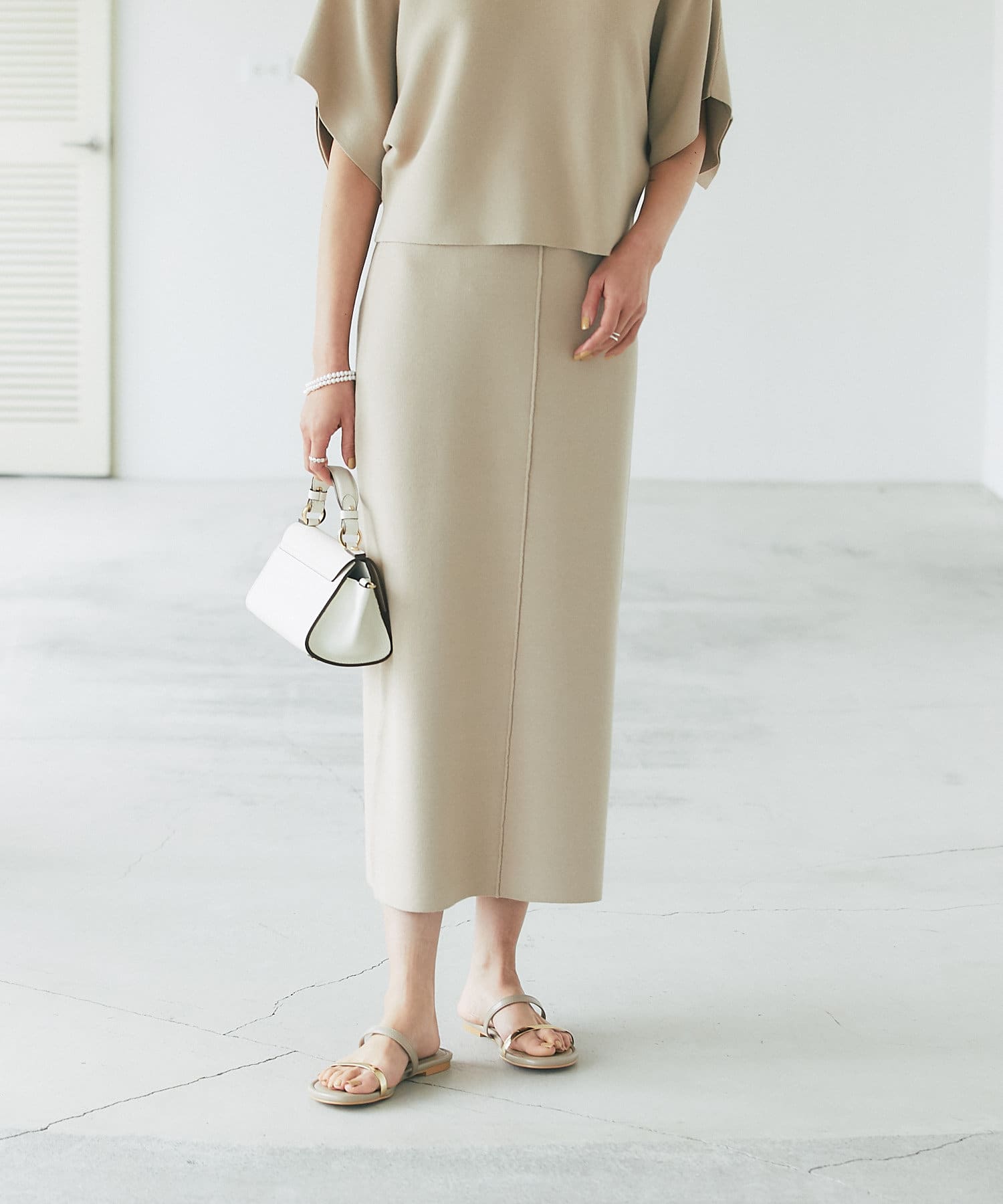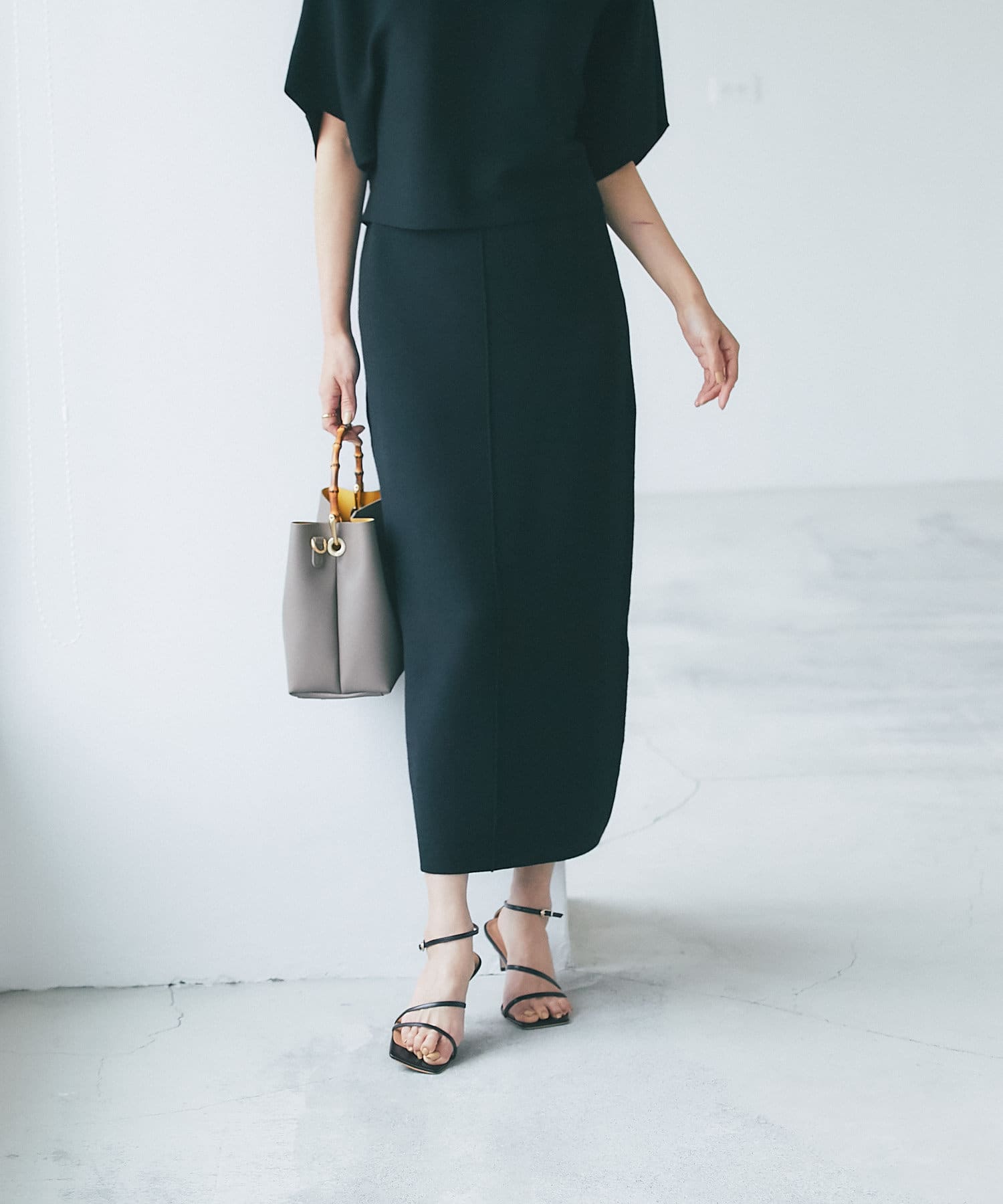 ボトムスのタイトスカートはシアー素材のニットやシャツと合わせると一気にトレンドライクな着こなしに。長めの丈感で肌の露出も控えめなので、気楽に履いていただける楽ちんさも魅力の一枚です。