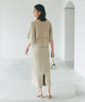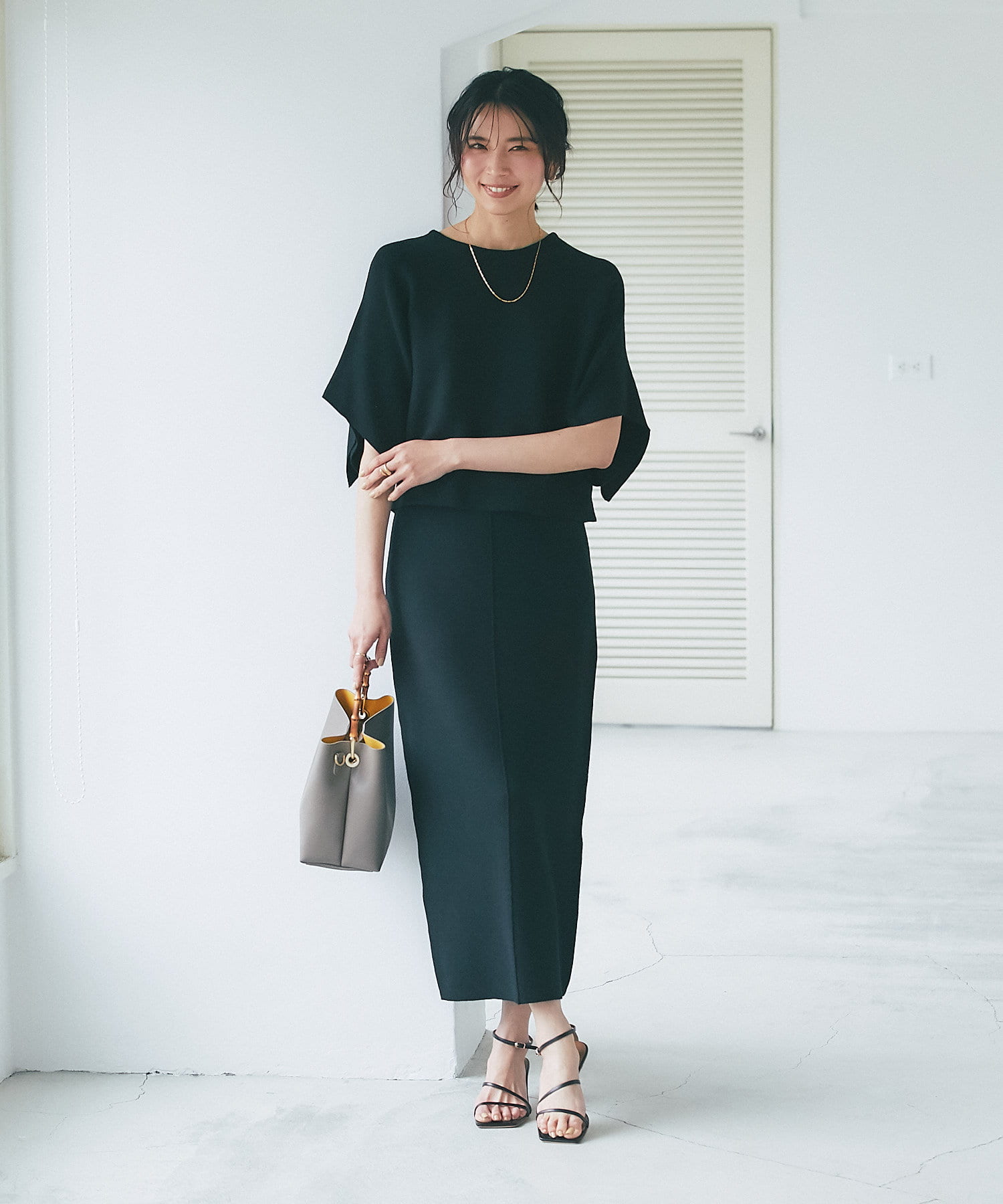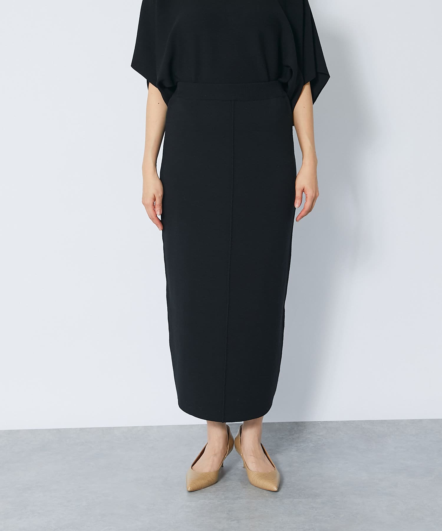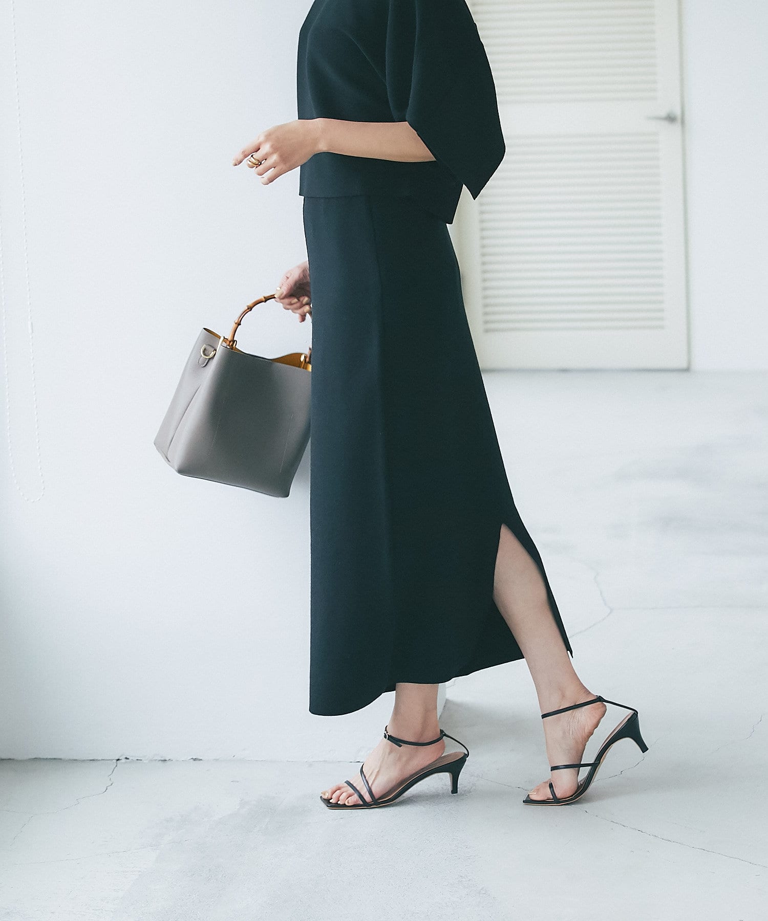 ボトムスのタイトスカートはシアー素材のニットやシャツと合わせると一気にトレンドライクな着こなしに。長めの丈感で肌の露出も控えめなので、気楽に履いていただける楽ちんさも魅力の一枚です。