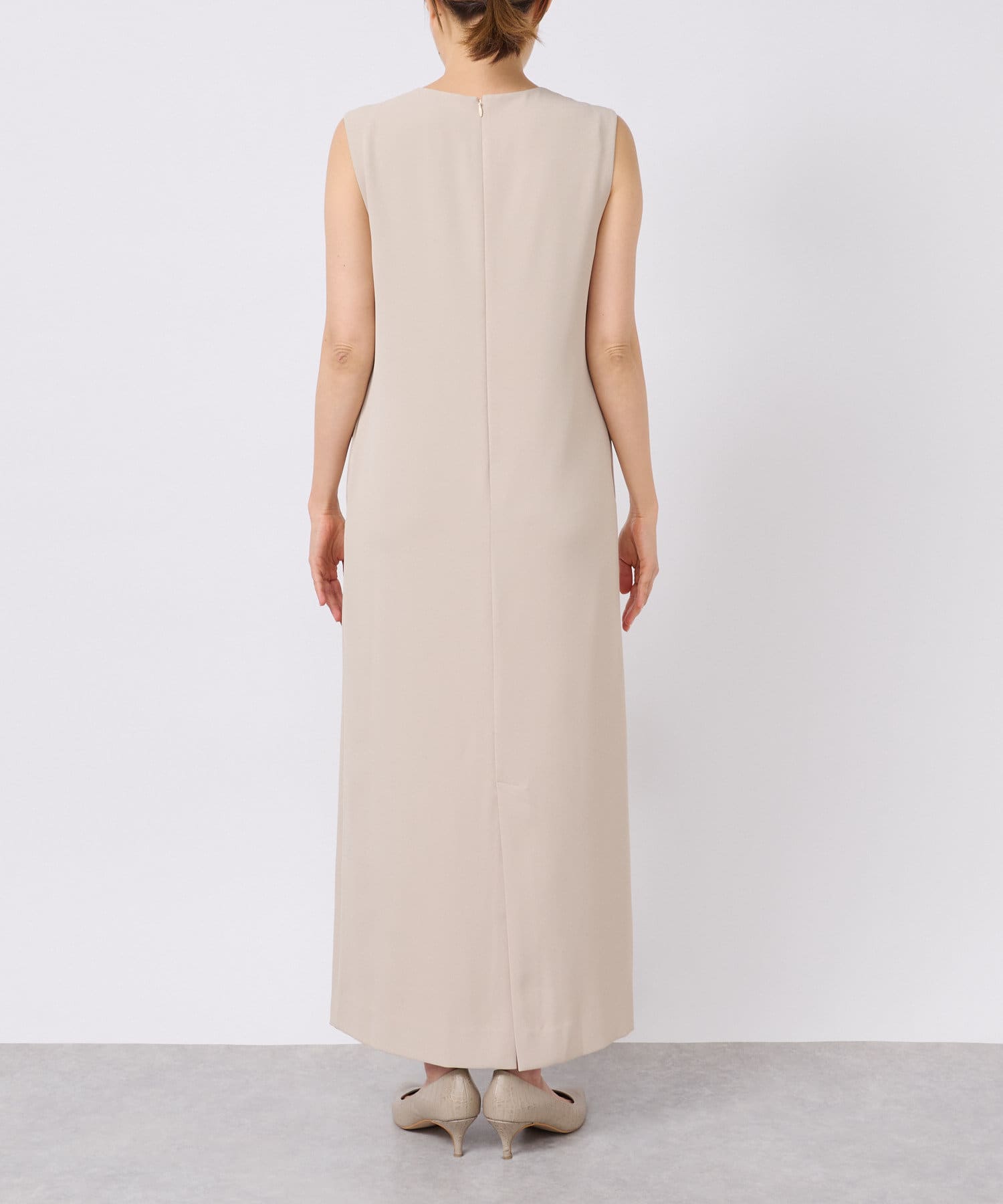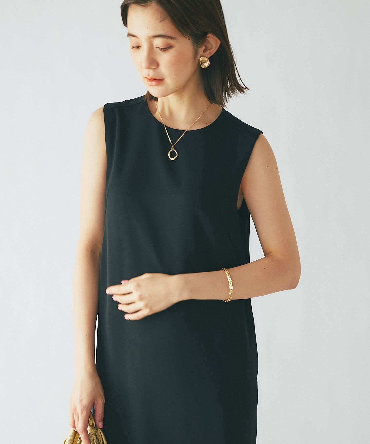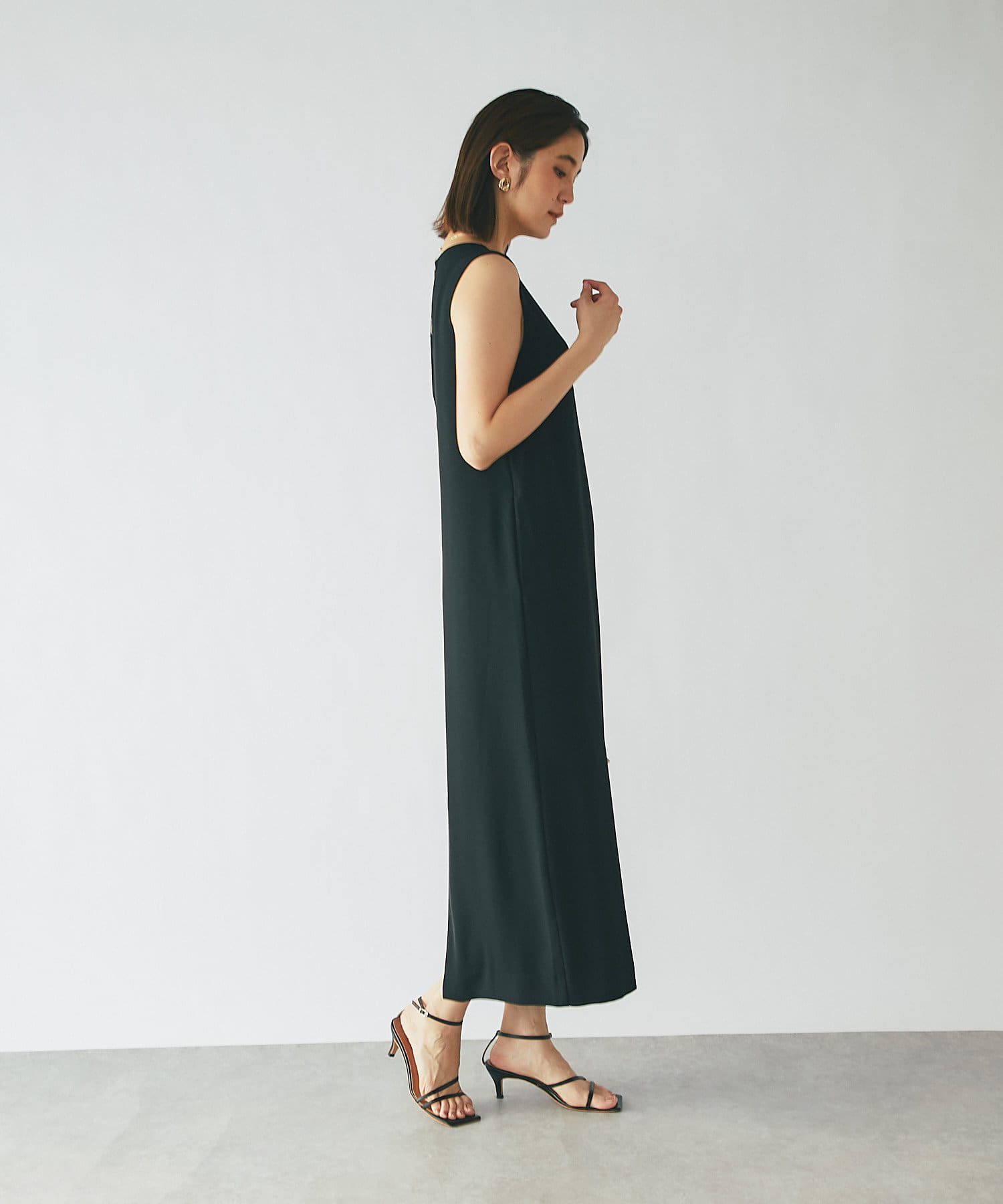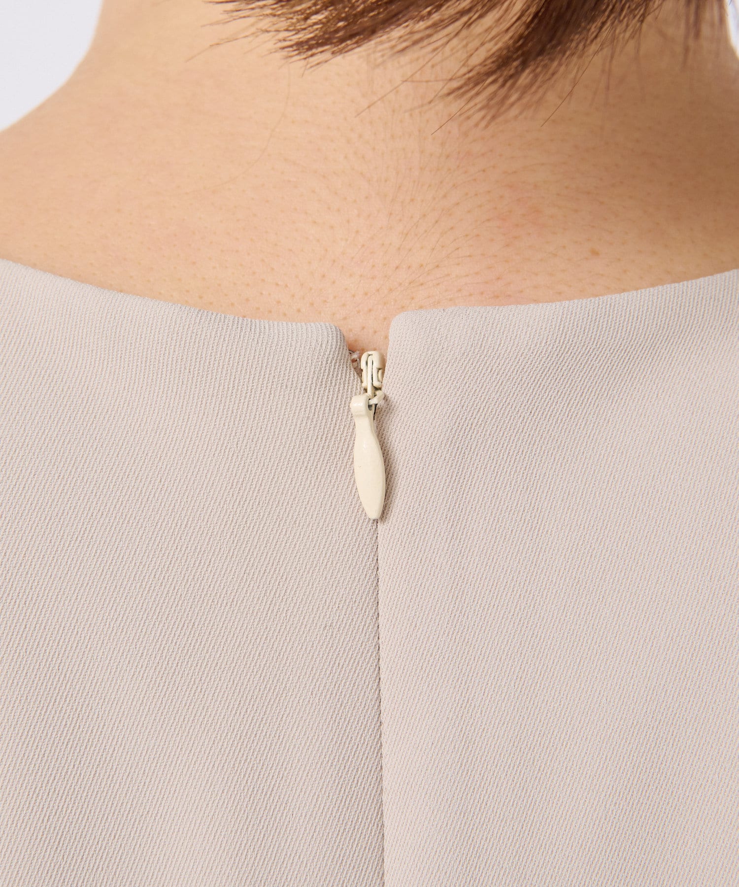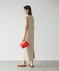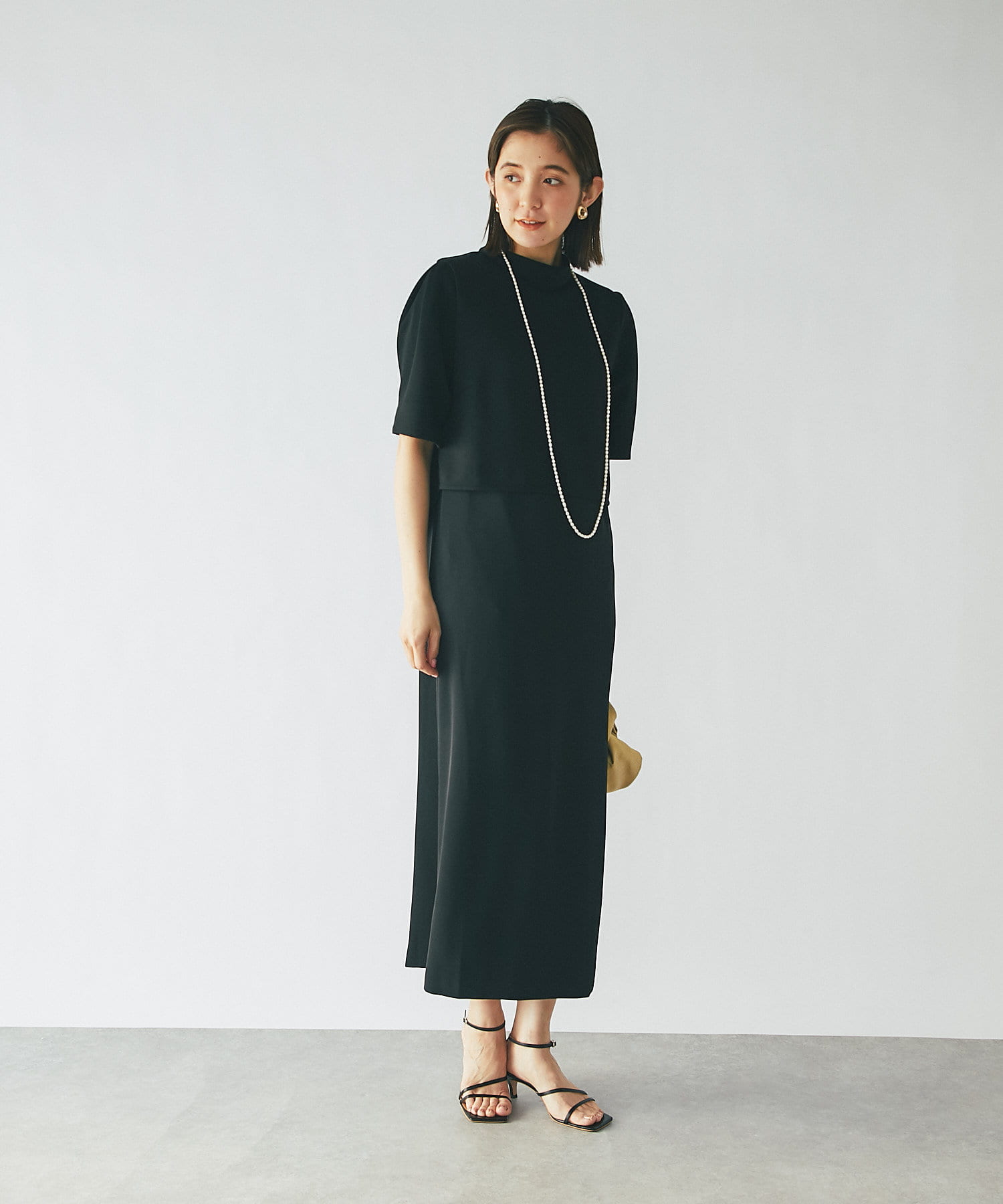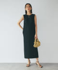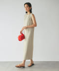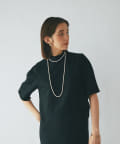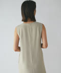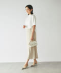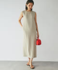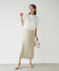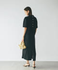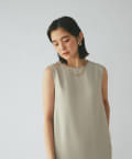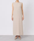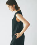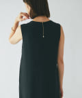 ワンピースの方はトップスのデザインを邪魔しないシンプルな作りになっており、クルーネックの衿元とストンとしたIラインシルエットがモードな印象です。