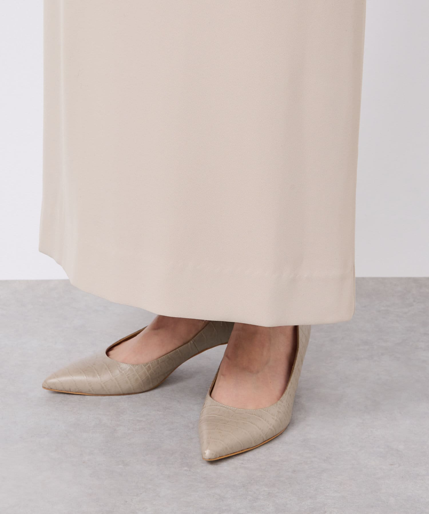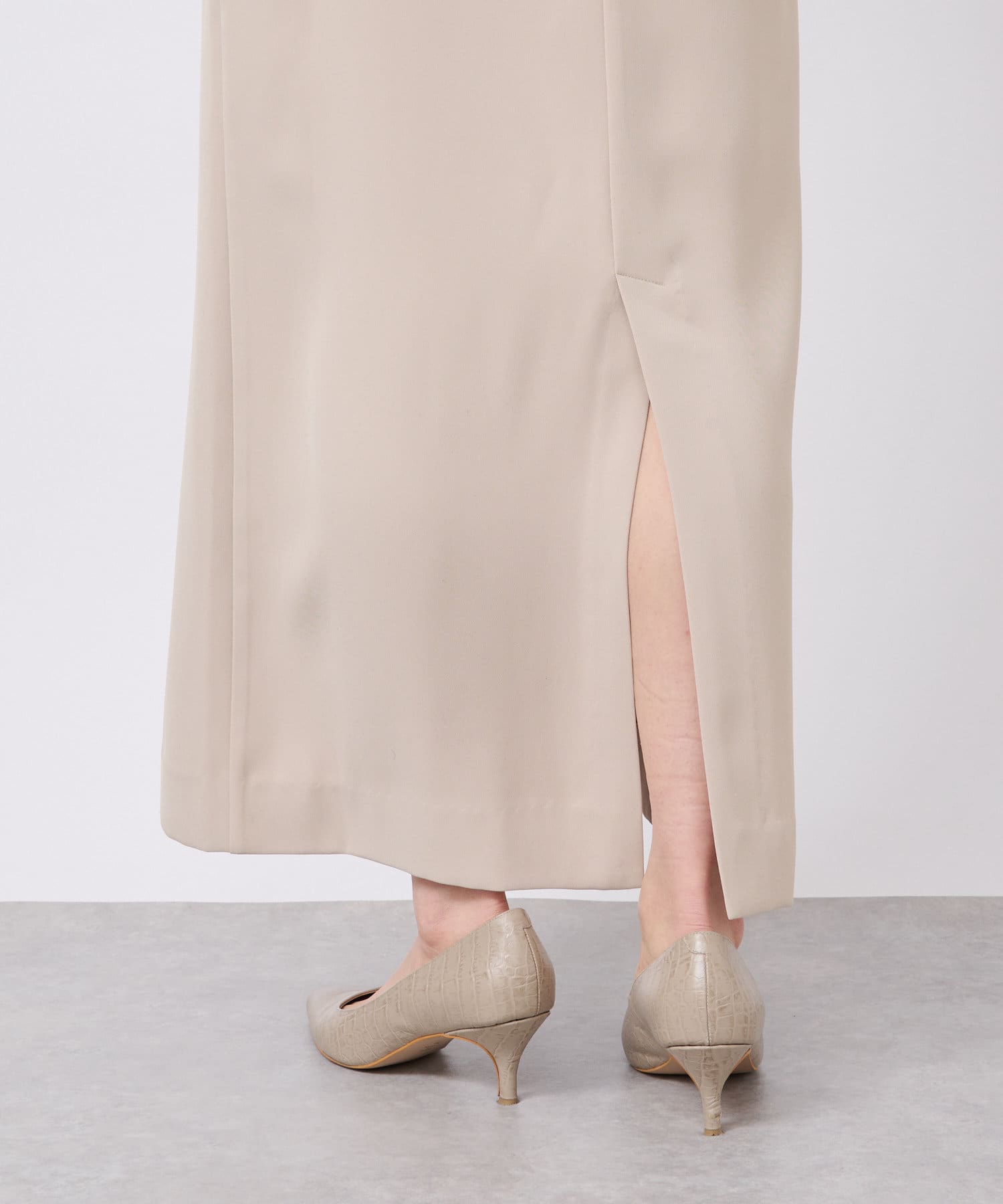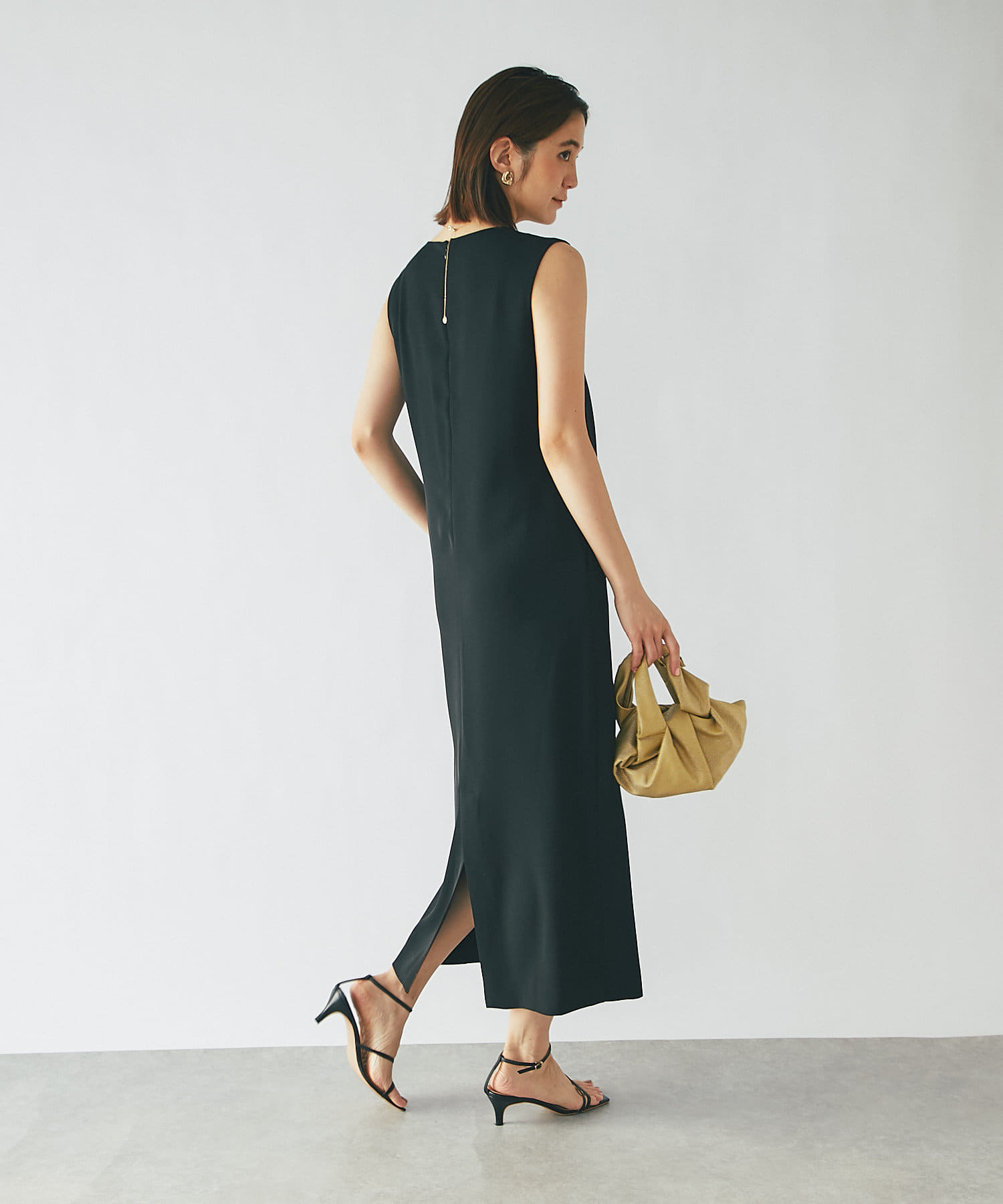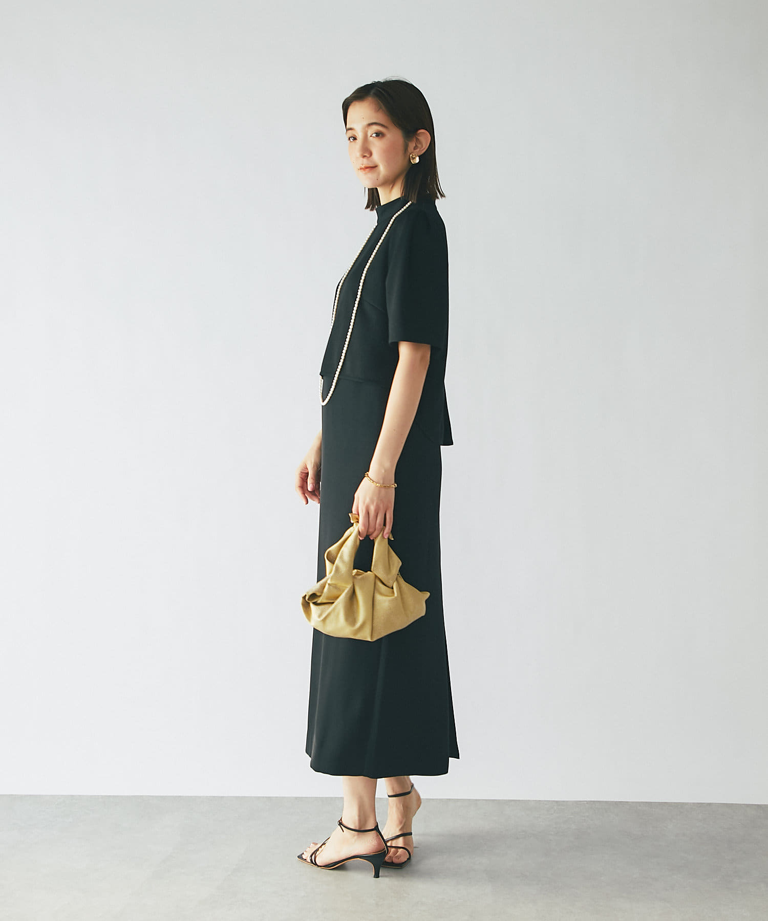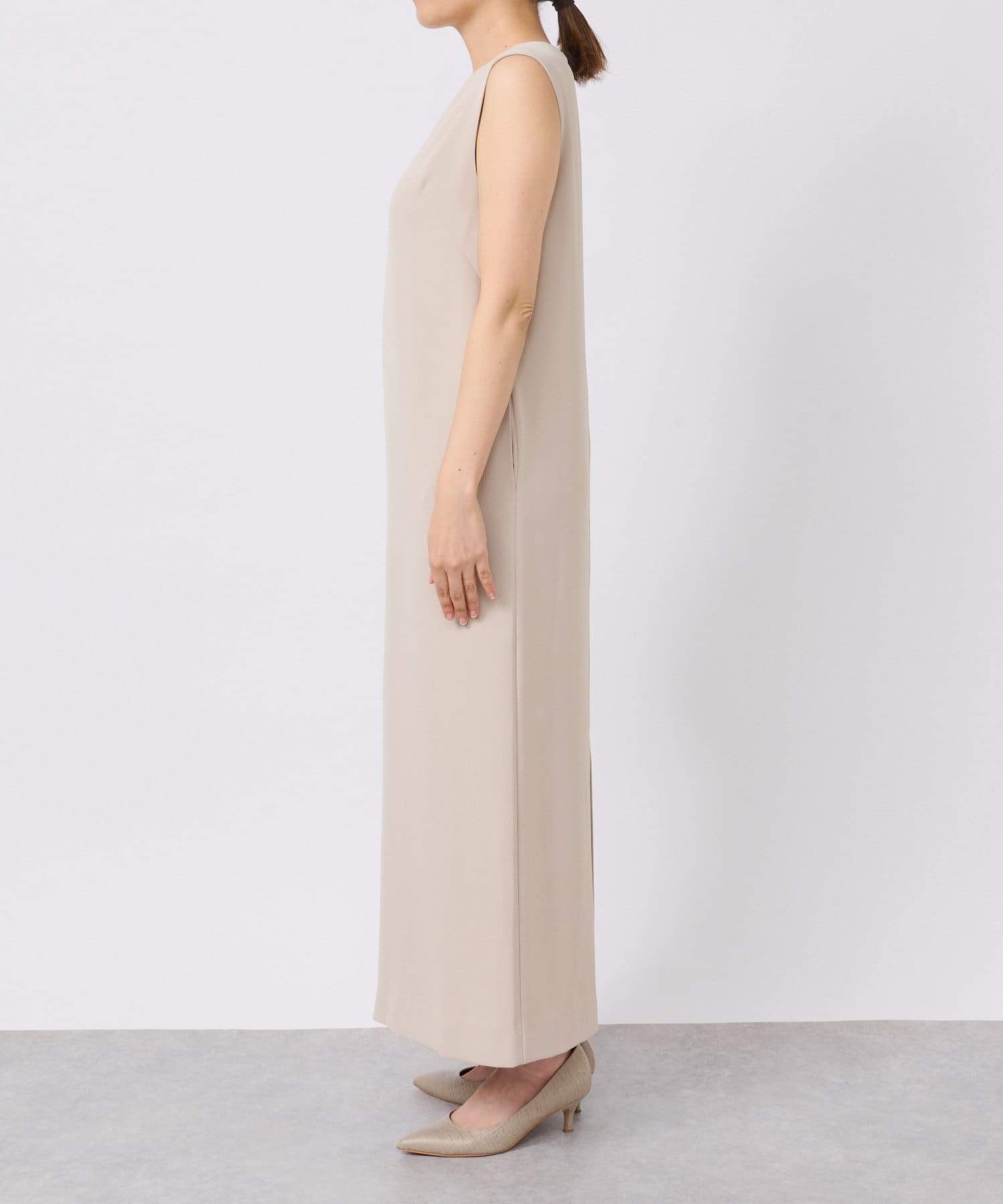 ワンピースの方はトップスのデザインを邪魔しないシンプルな作りになっており、クルーネックの衿元とストンとしたIラインシルエットがモードな印象です。
