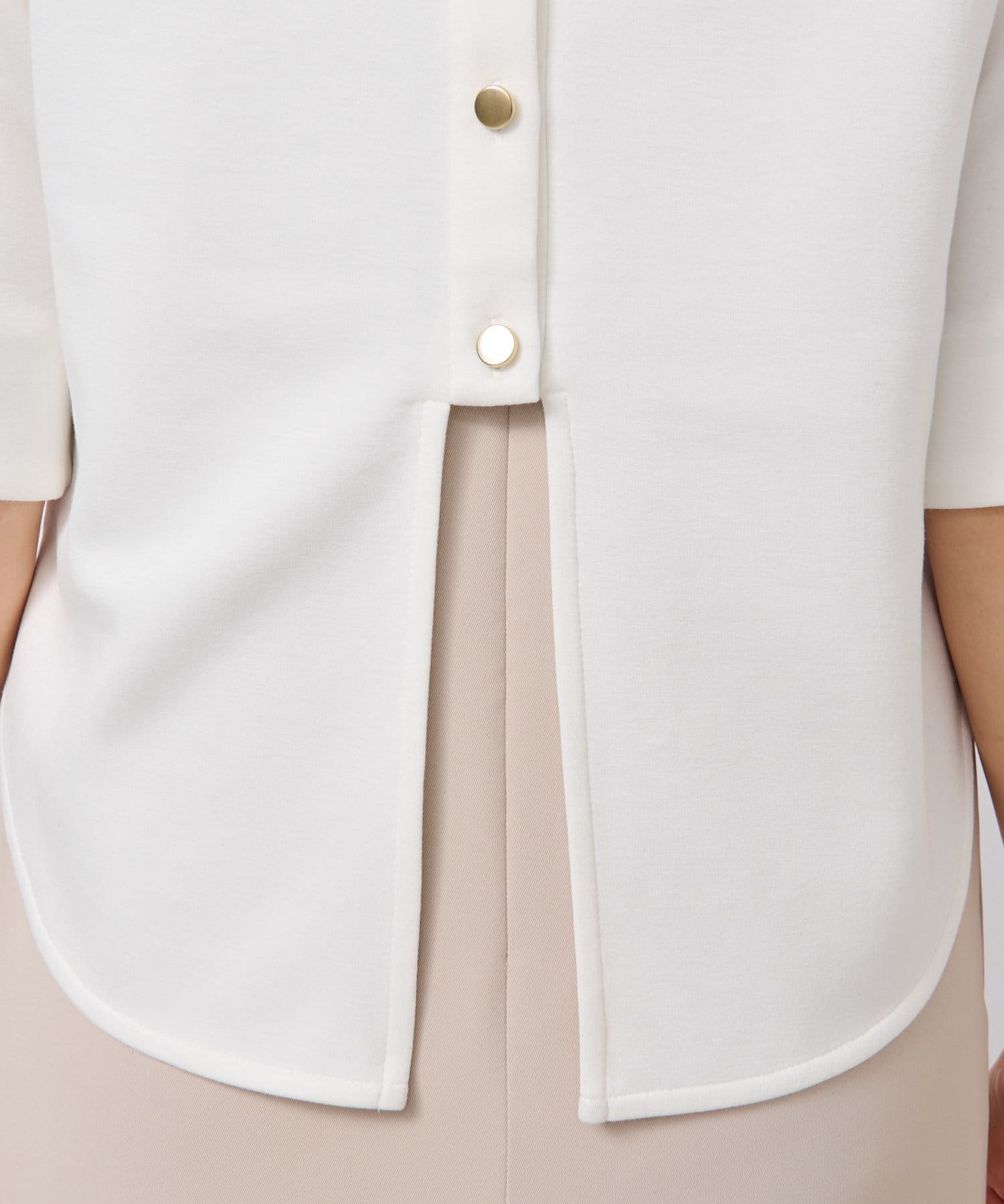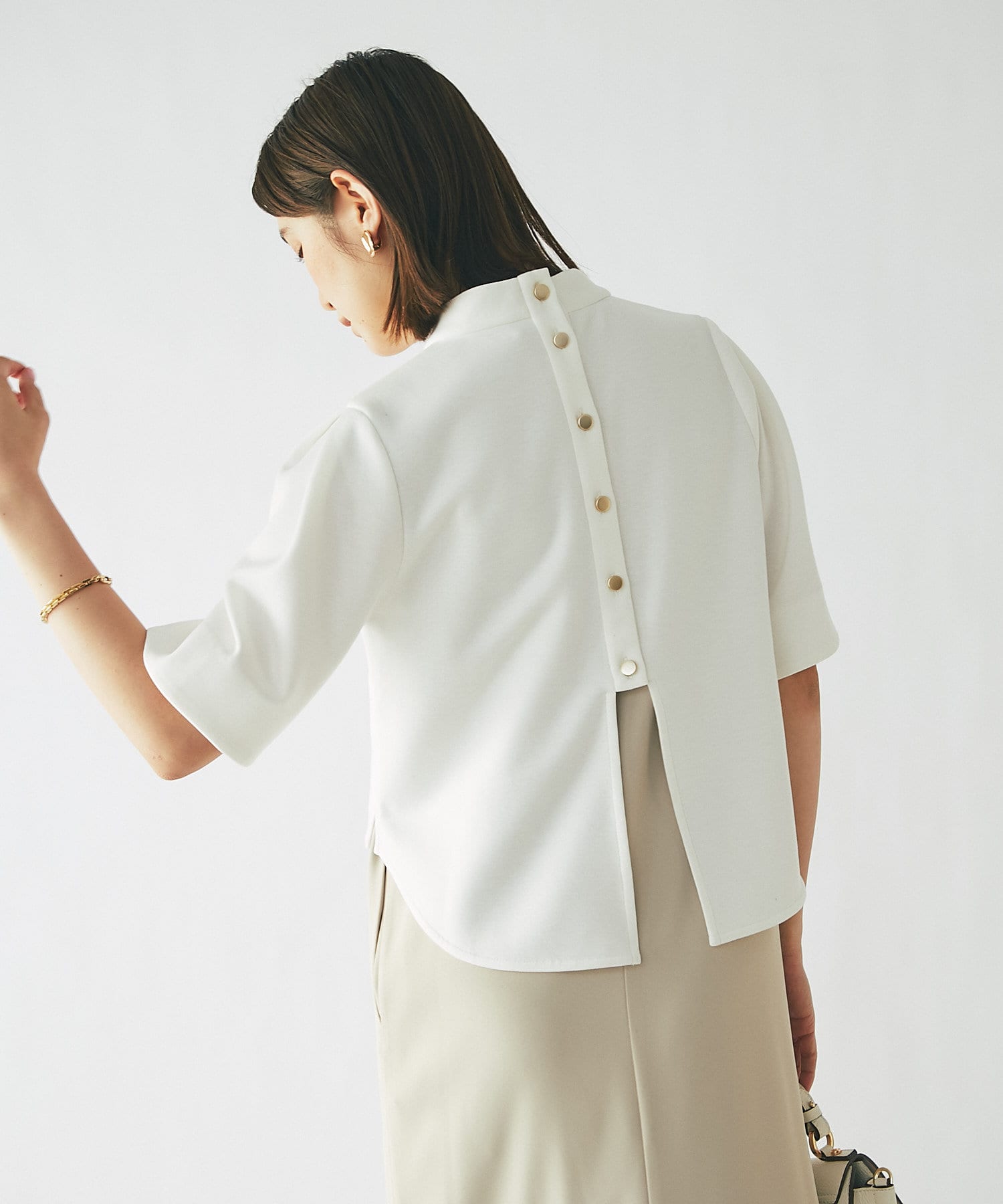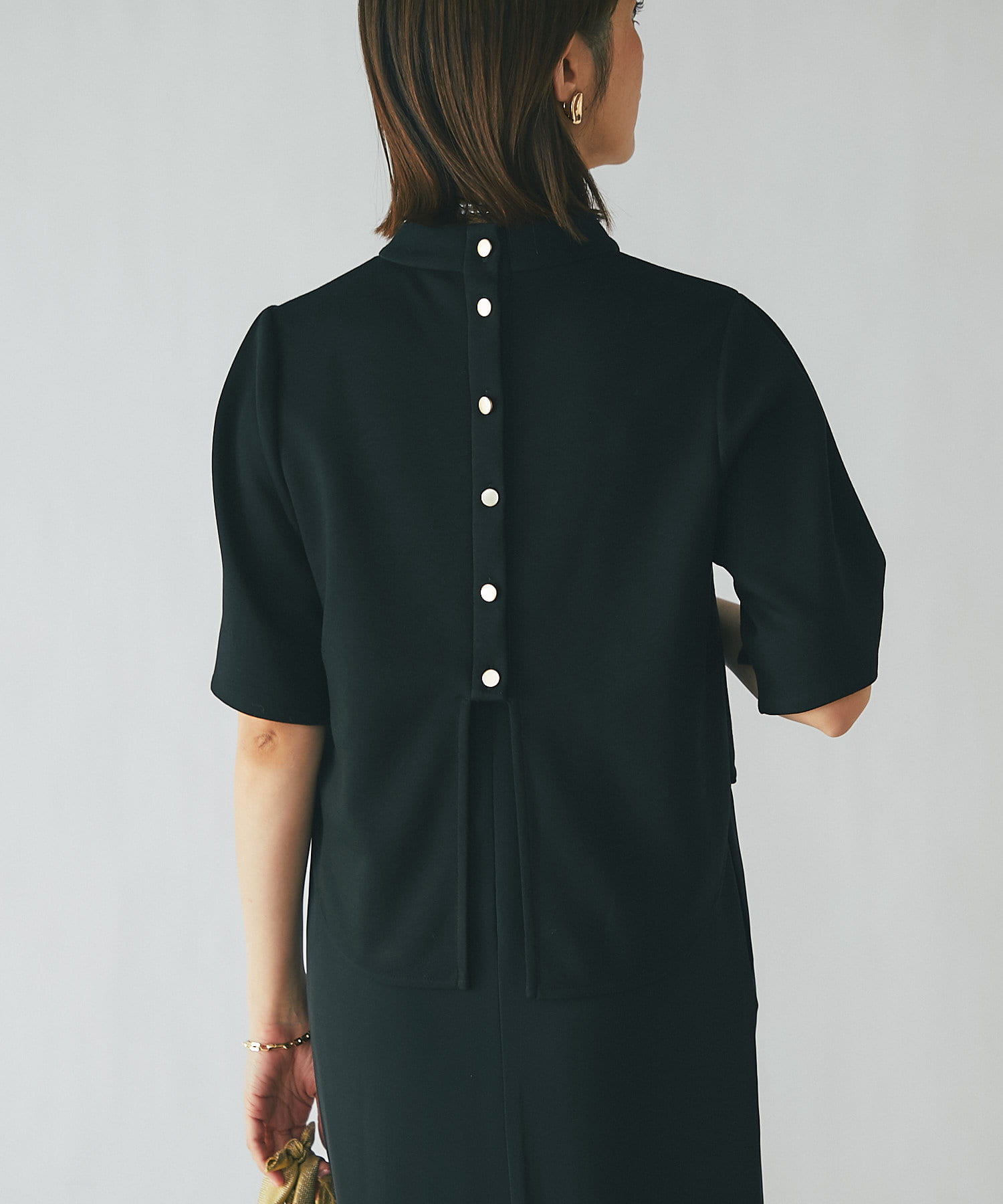 バックスタイルはボタンあきの仕様で抜け感のあるデザインに。