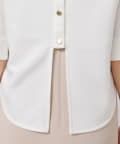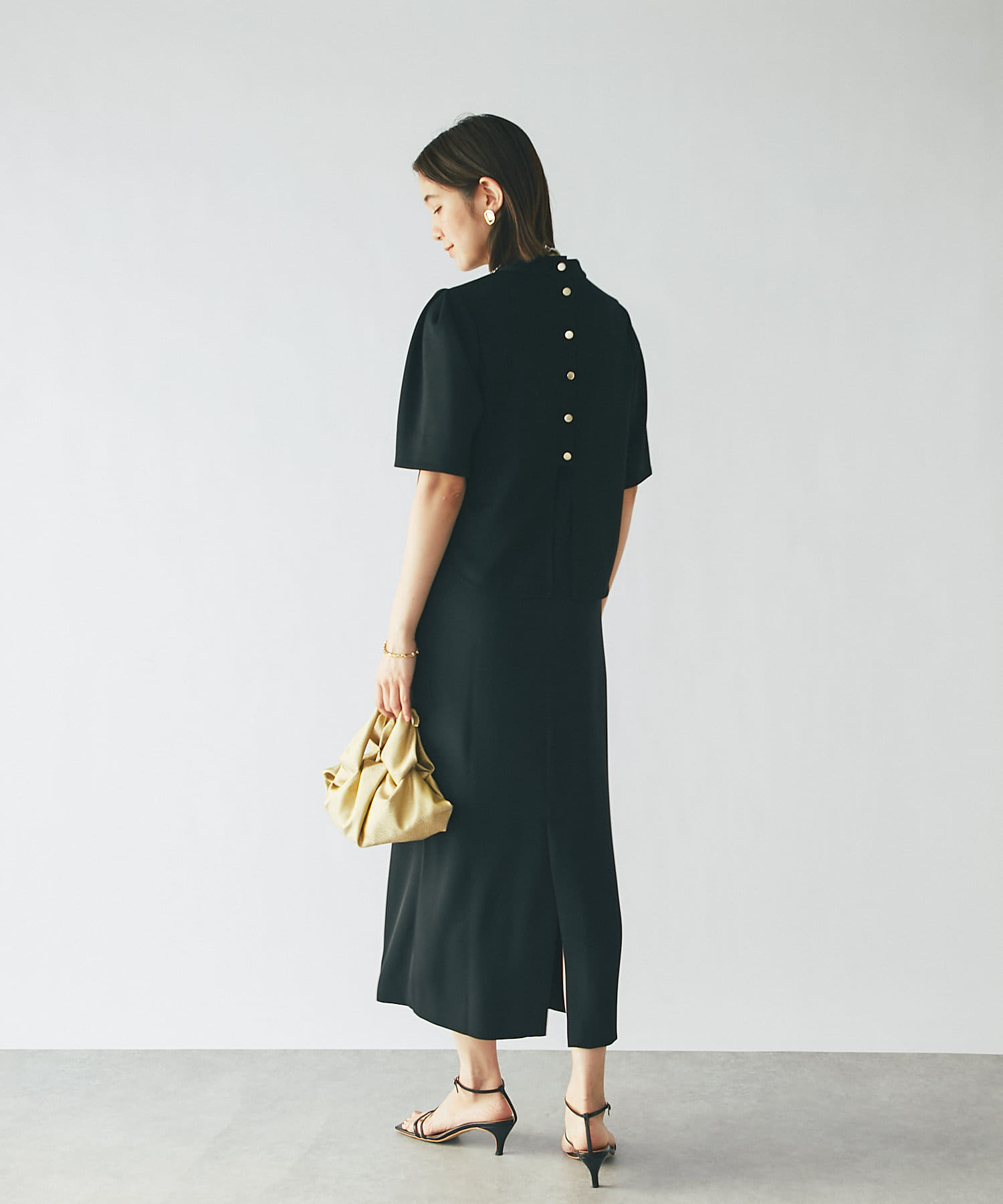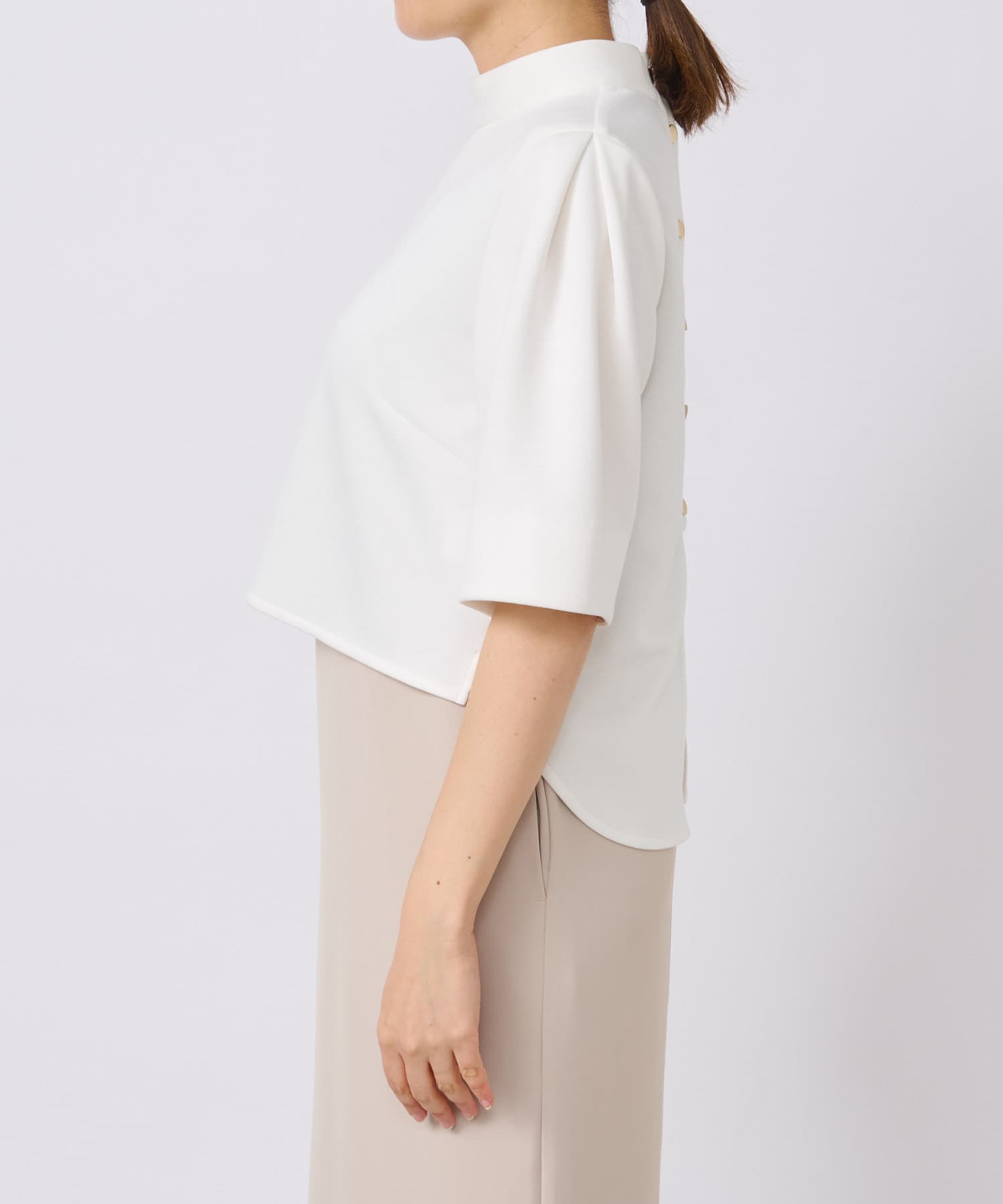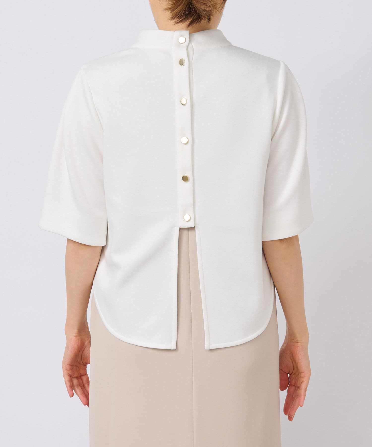 バックスタイルはボタンあきの仕様で抜け感のあるデザインに。