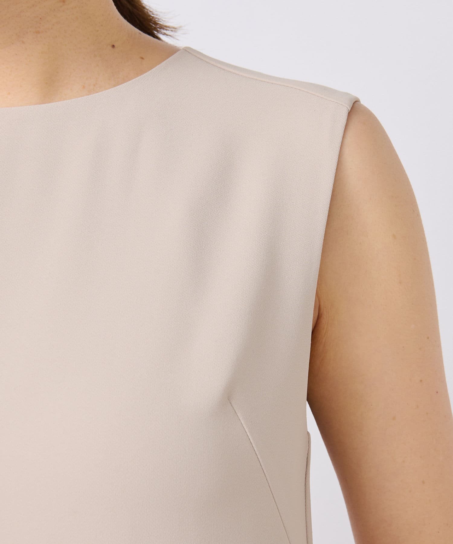 ノースリーブで袖周りがごわつかないので、トップスにトレーナーやパーカーを重ねてもスッキリと着ていただけます。