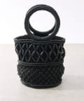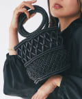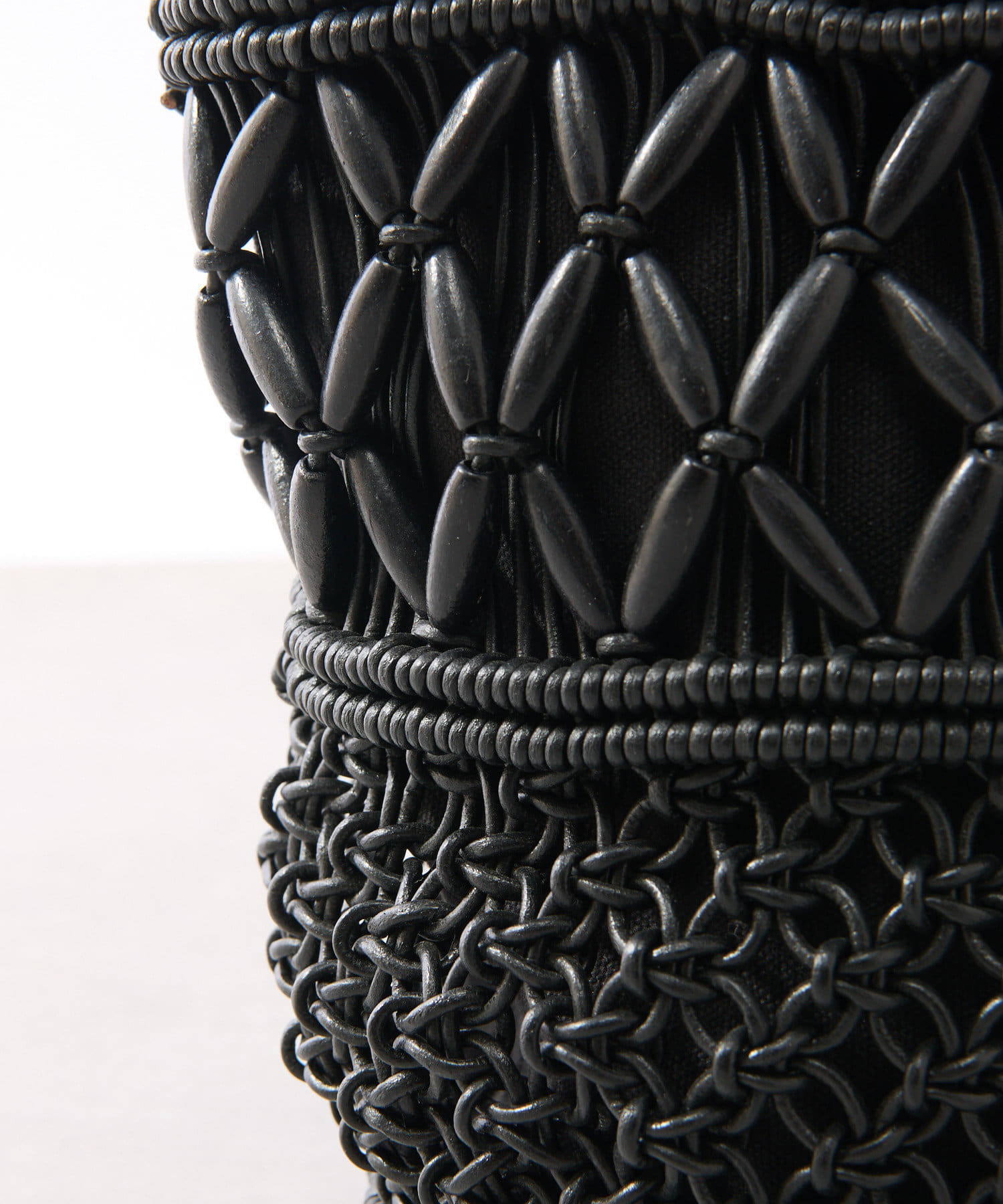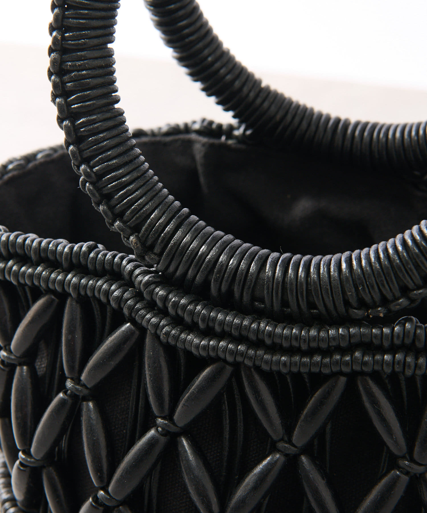 ウッドビーズや革ひもを使用し緻密に編みこまれた、職人の手仕事が光るハンドバッグ。