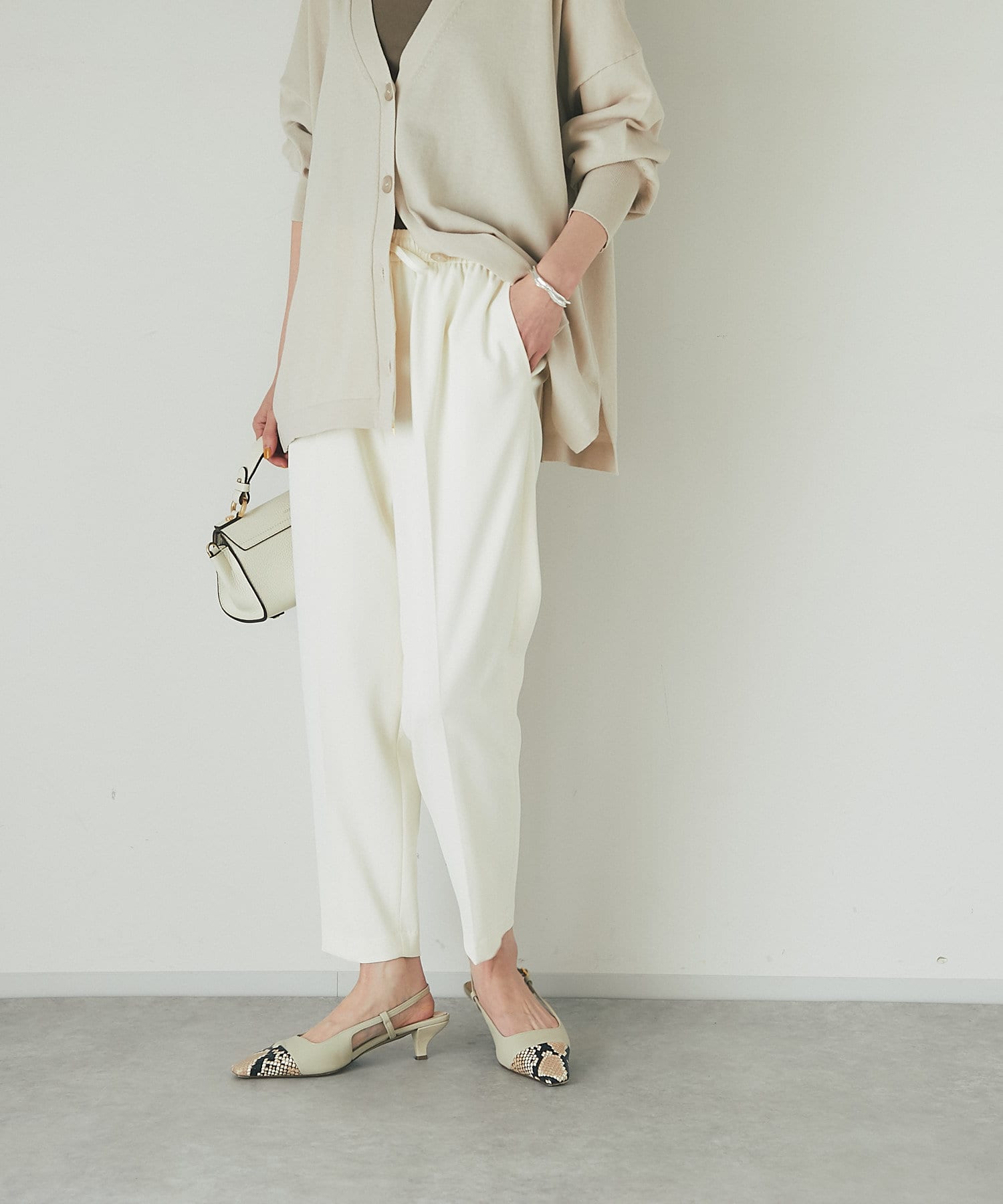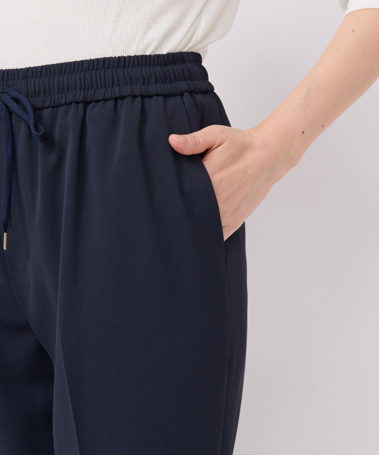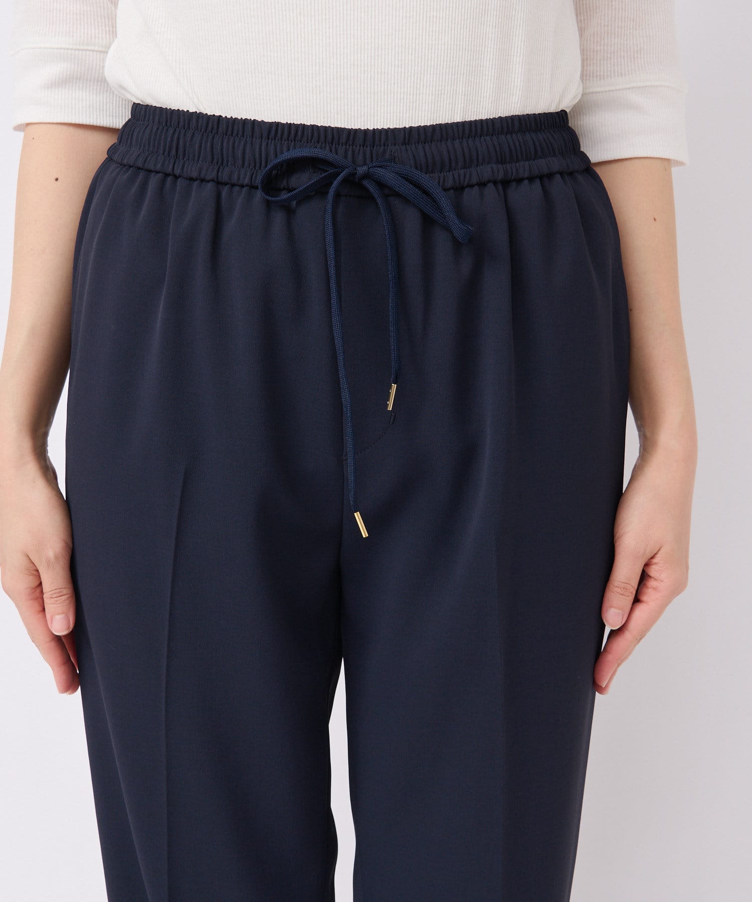 • オンオフ兼用できるキレイ見えイージーパンツ。