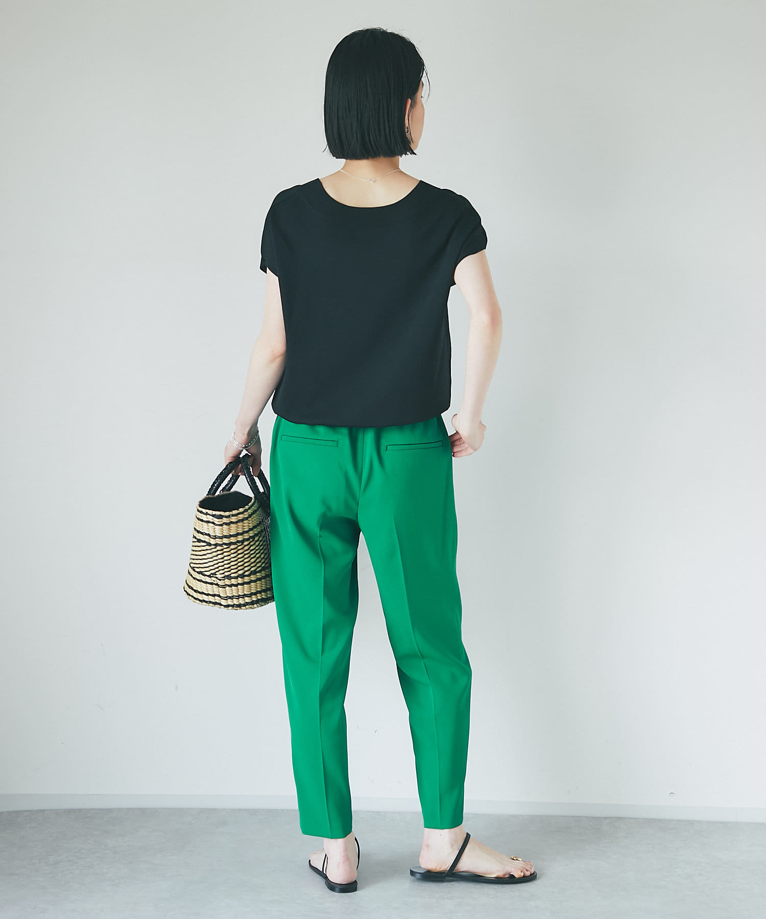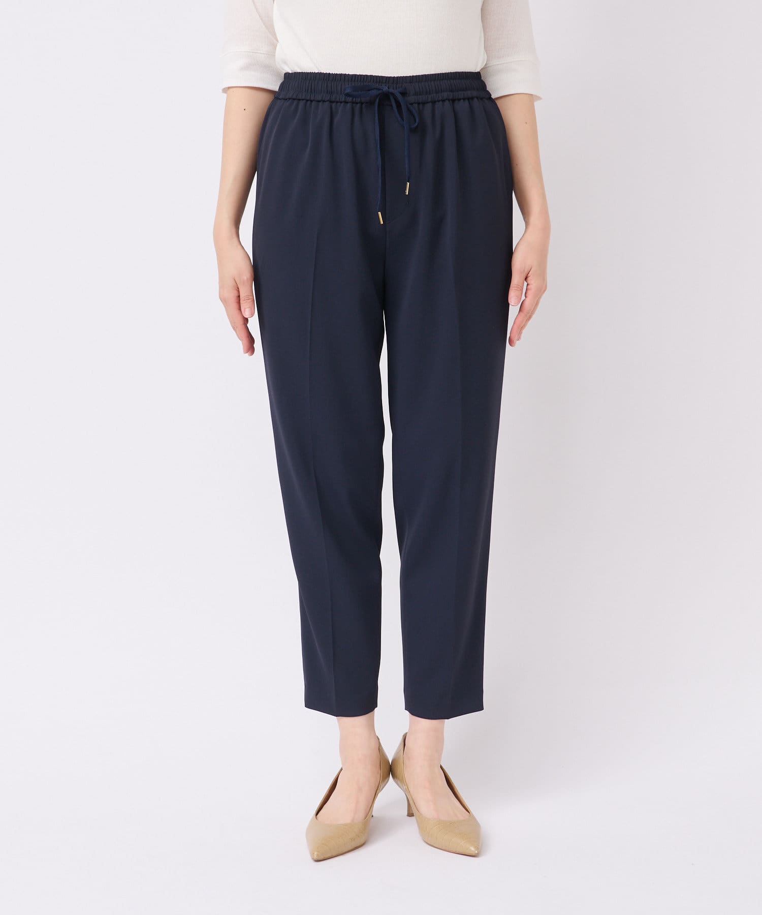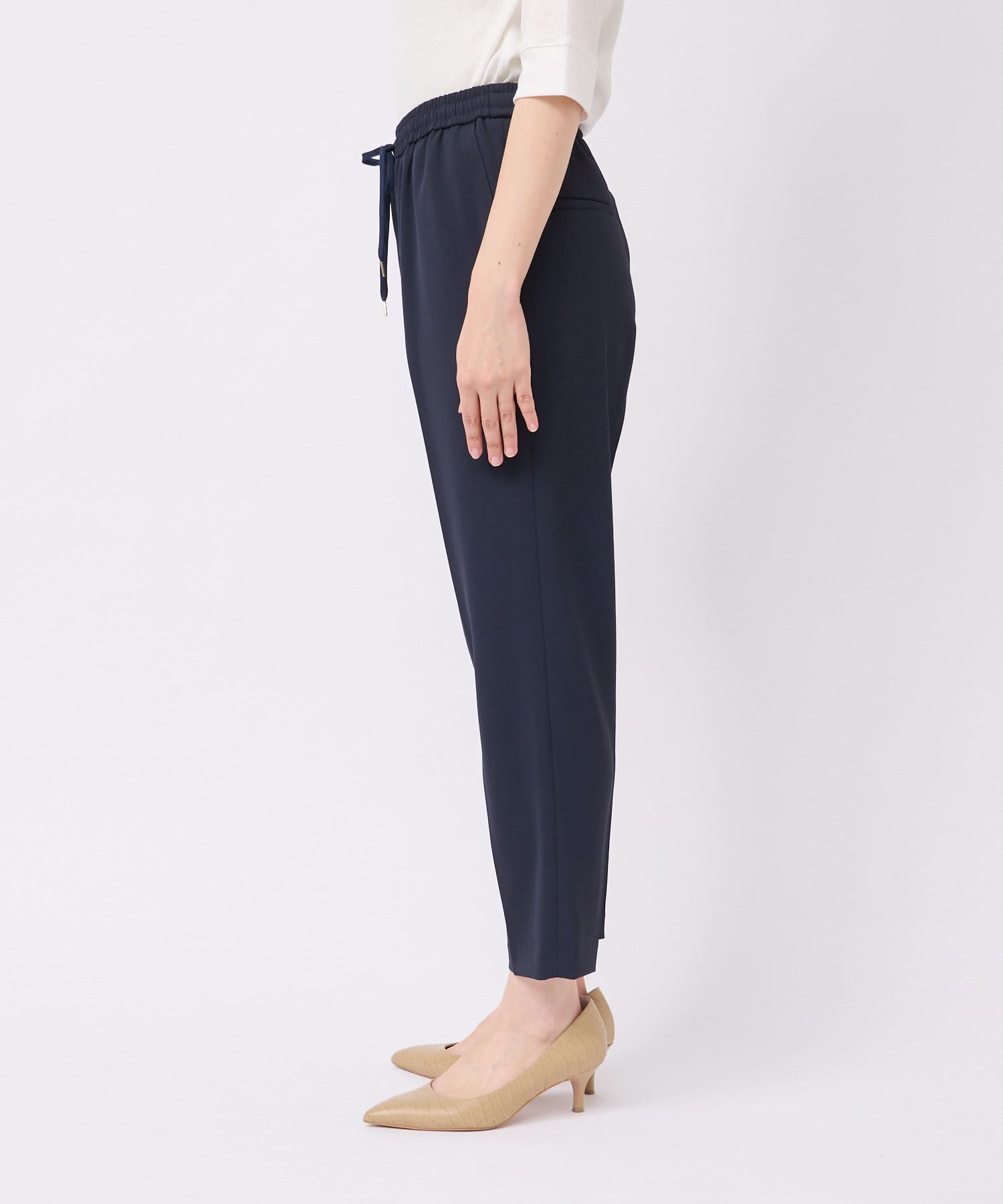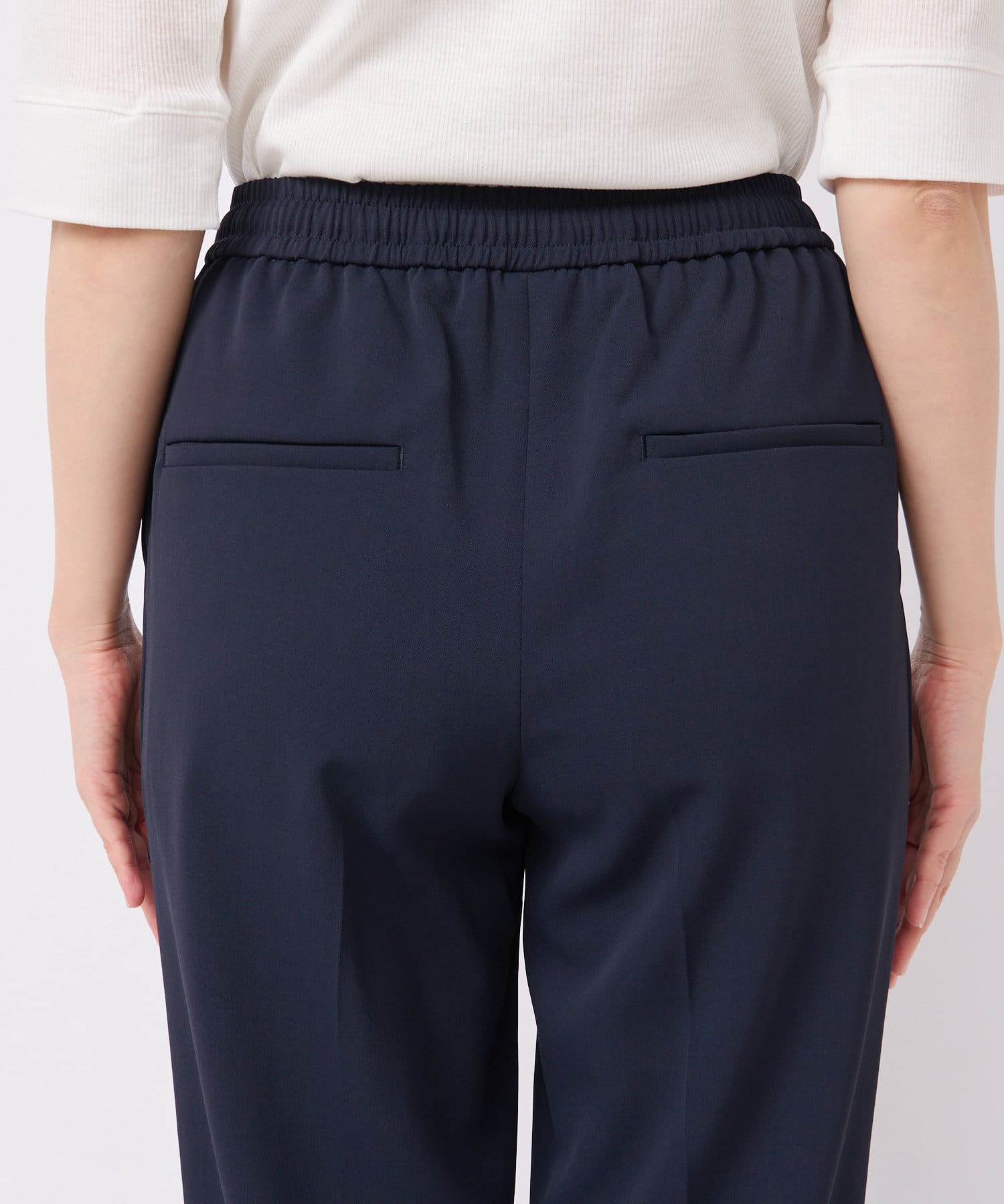 オンオフ兼用できるキレイ見えイージーパンツ。
