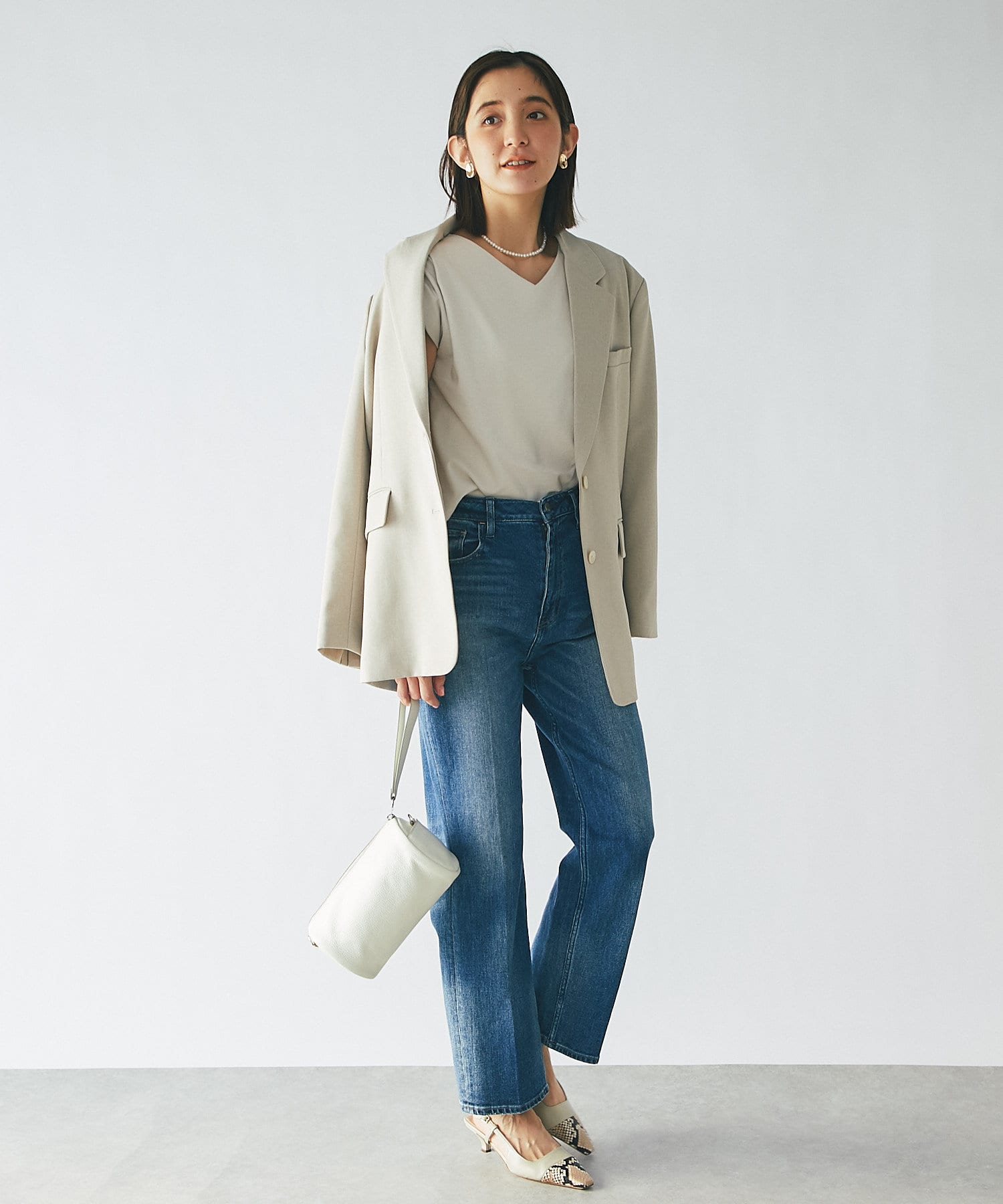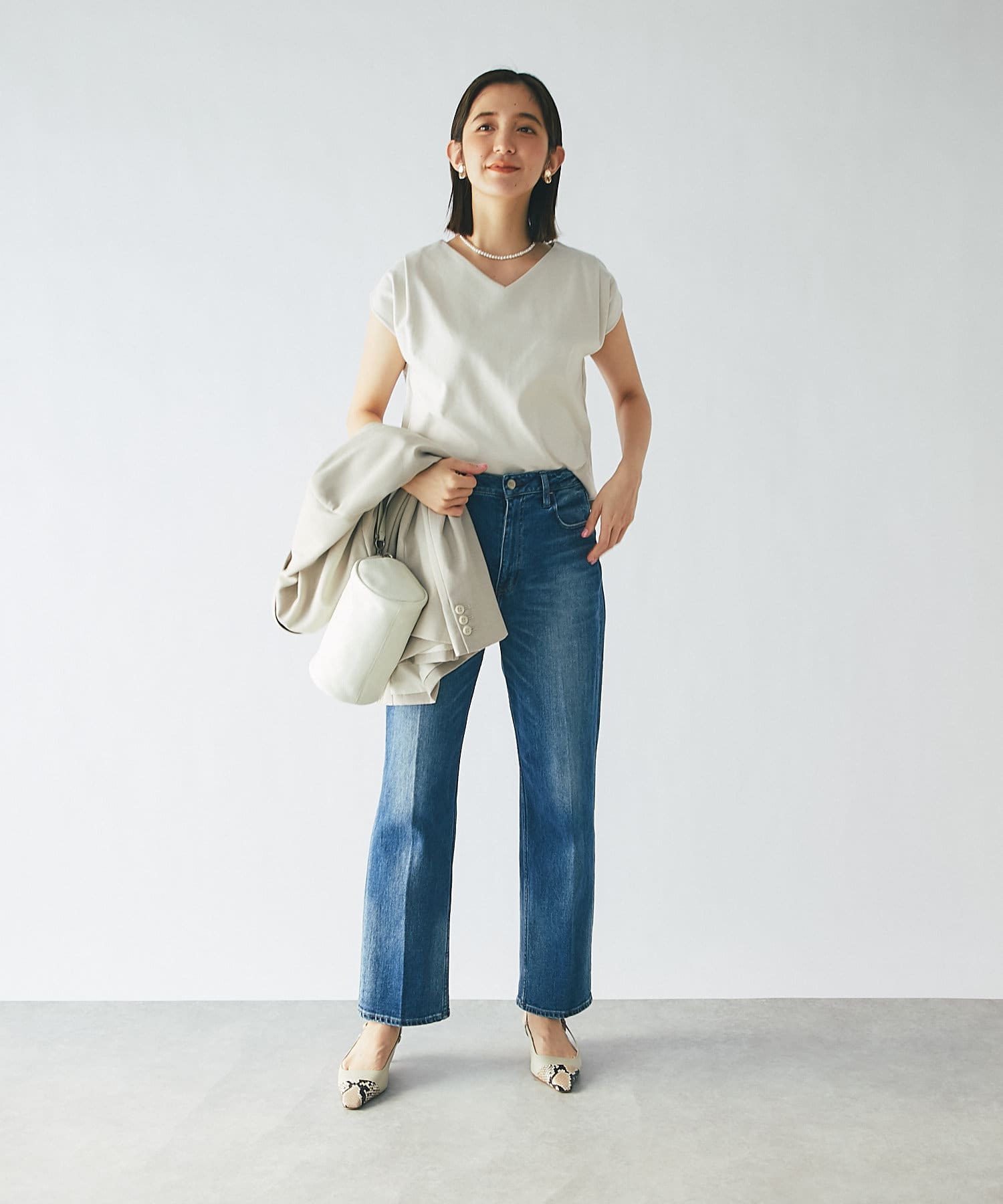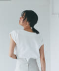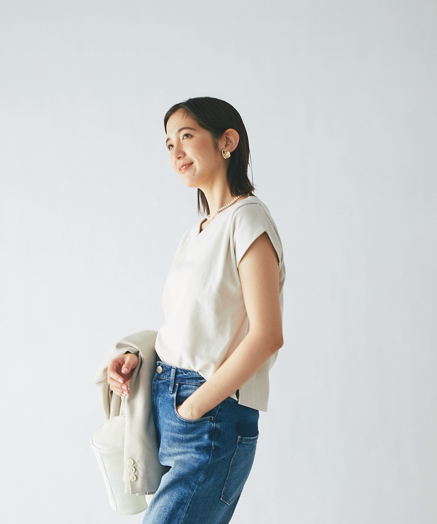 また、袖のもたつきもないので、ジャケット等の羽織りを着用しても、肩周りのデザインがアウターに響きづらくスッキリと組み合わせていただけます。