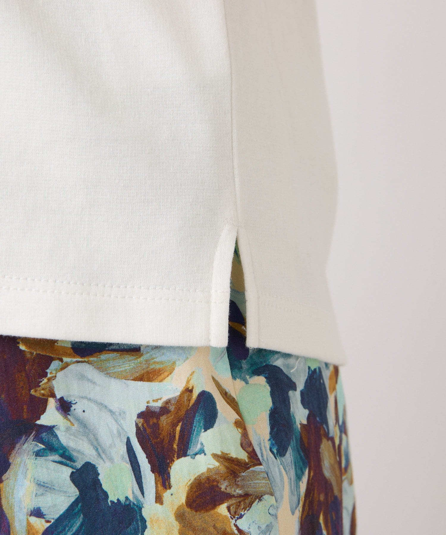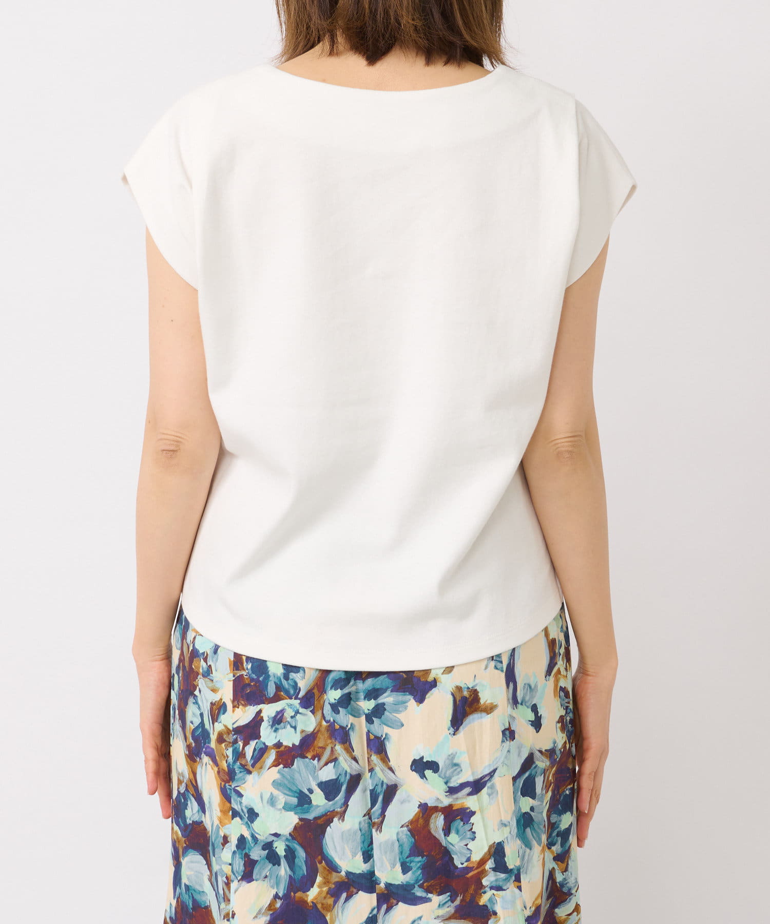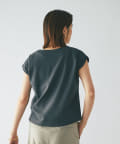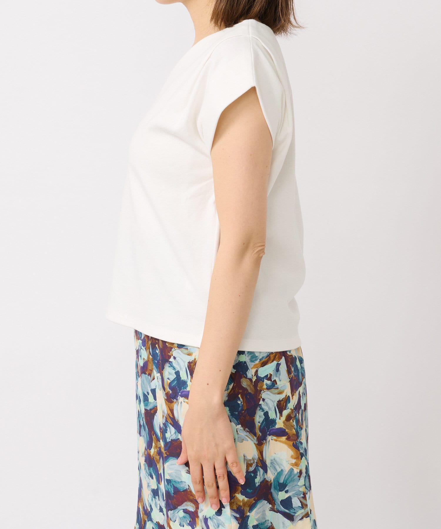 また、袖のもたつきもないので、ジャケット等の羽織りを着用しても、肩周りのデザインがアウターに響きづらくスッキリと組み合わせていただけます。