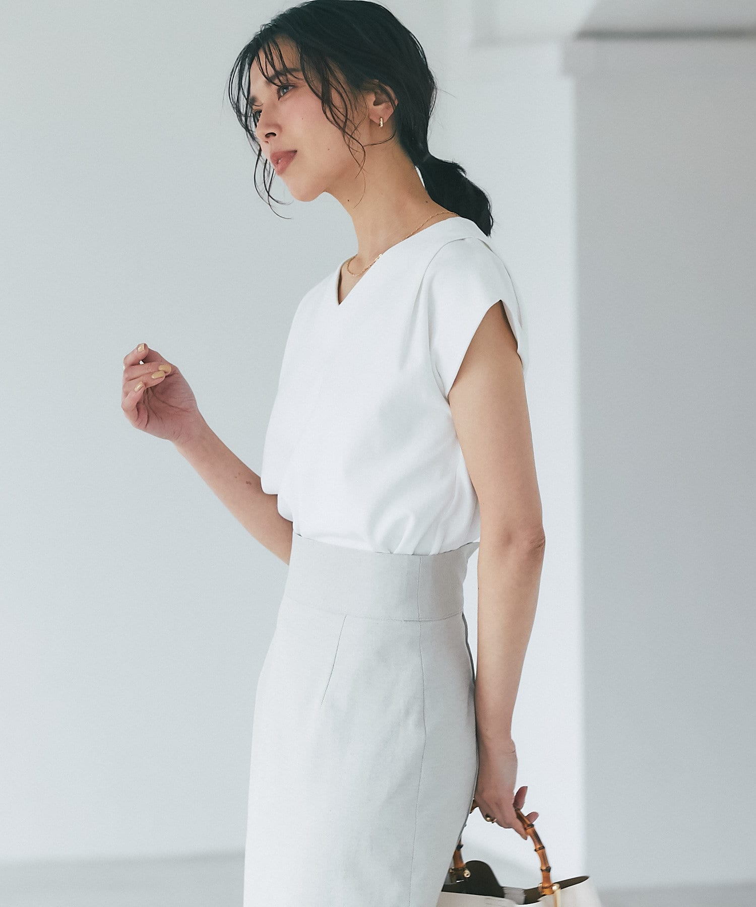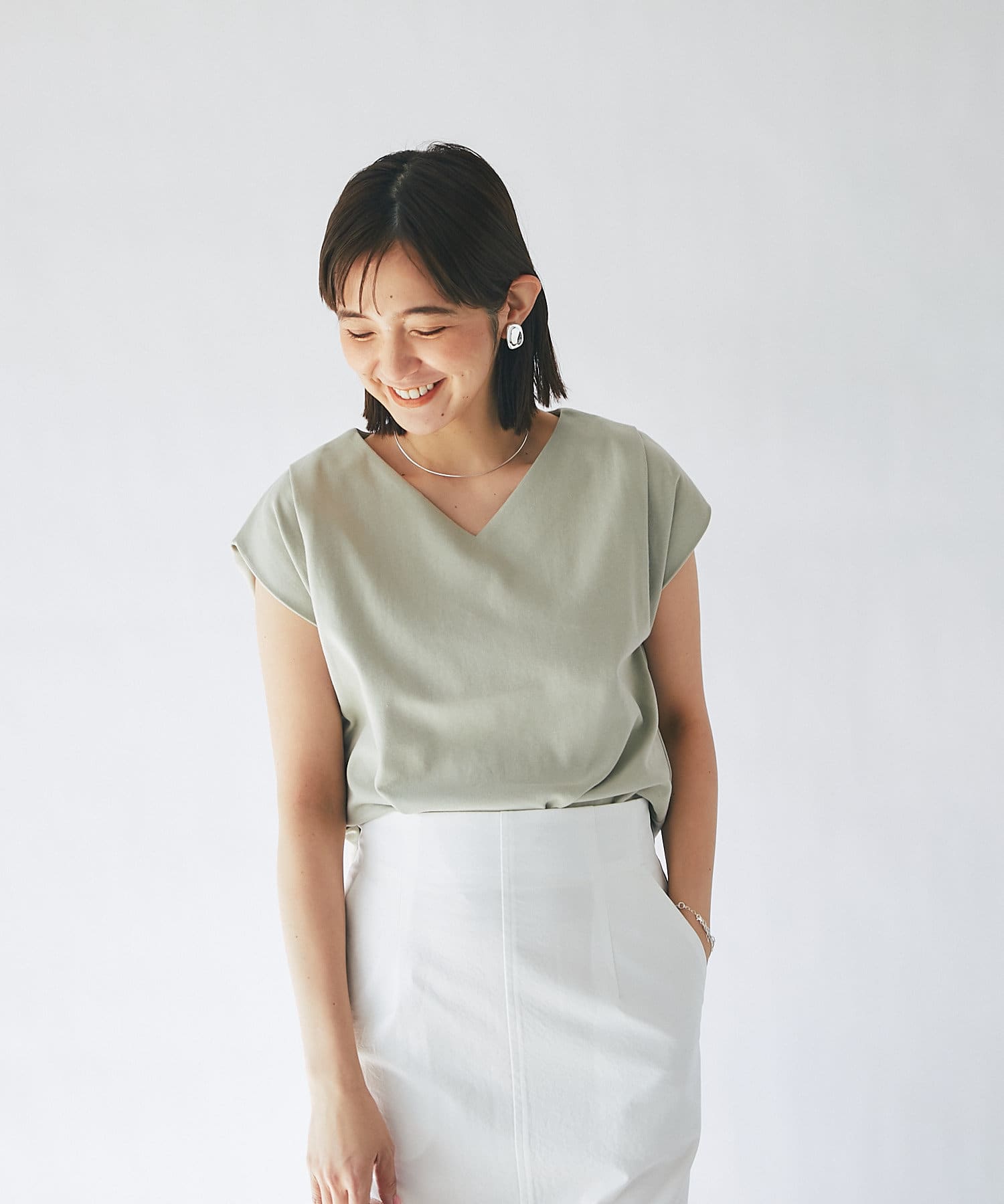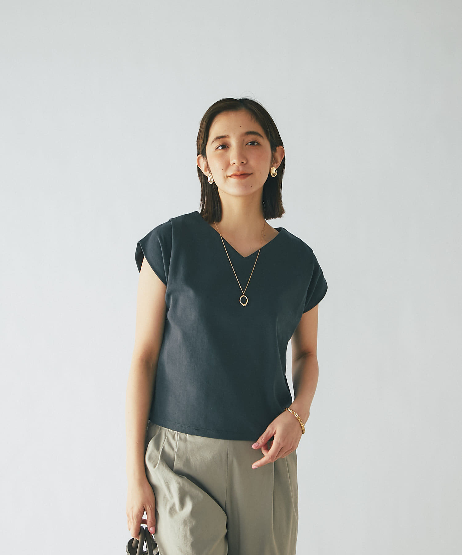 ちょうど良い開き具合のVネックラインで、デコルテを綺麗に見せ、女性らしく着こなせます。
