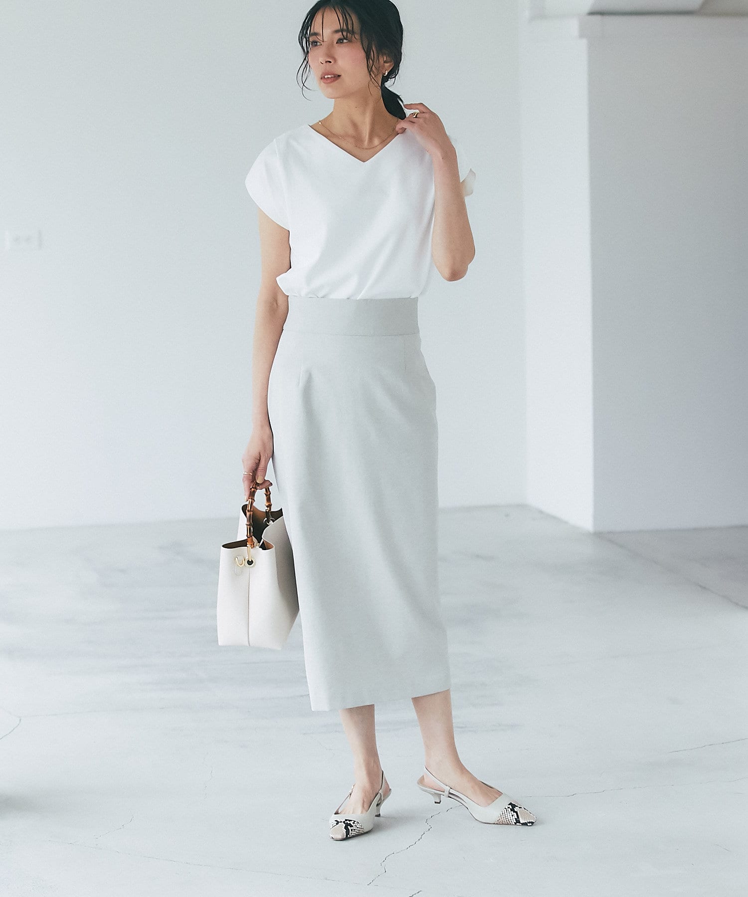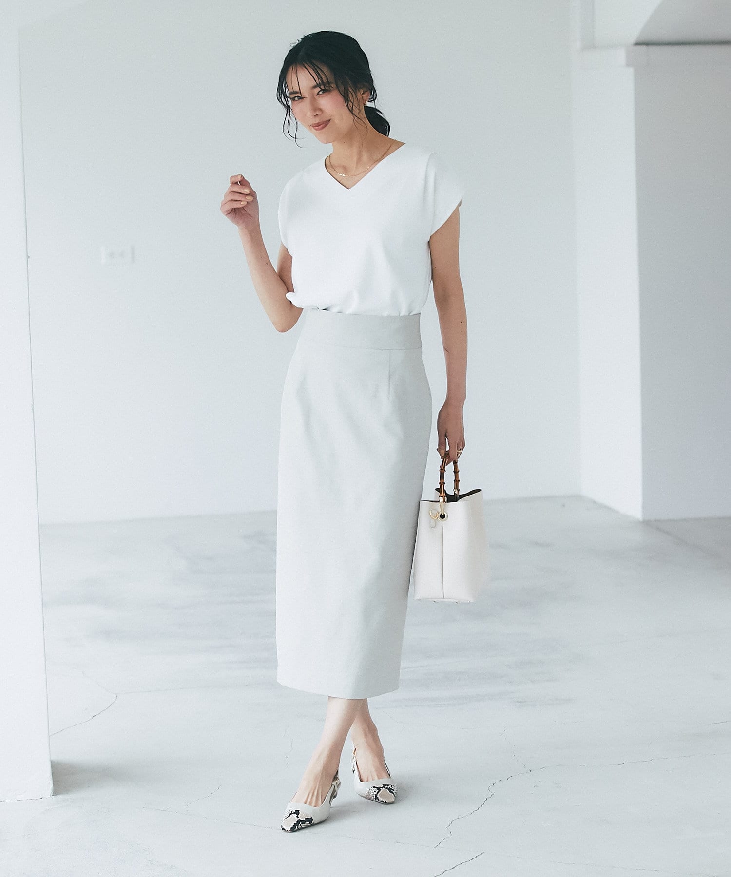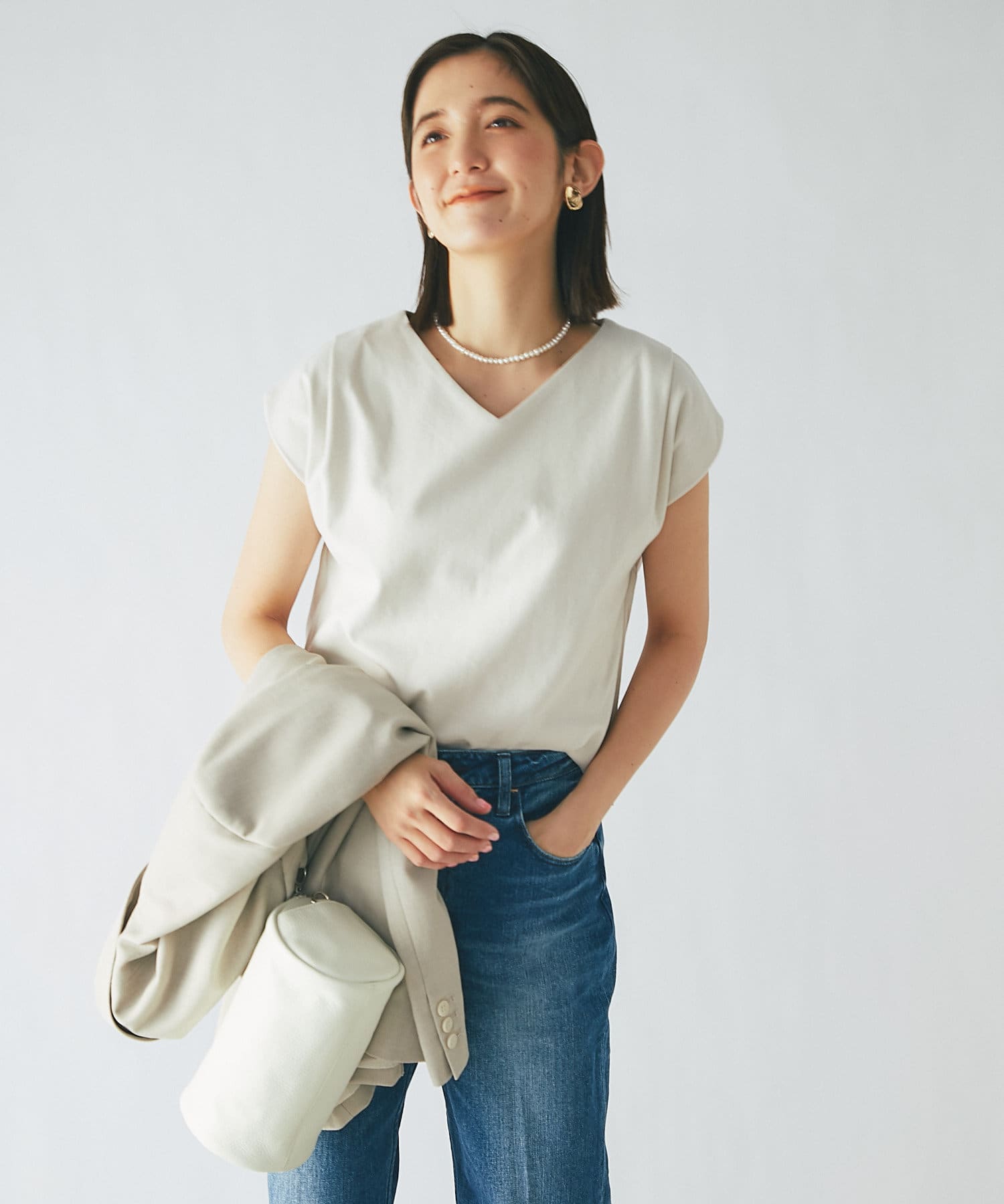 ちょうど良い開き具合のVネックラインで、デコルテを綺麗に見せ、女性らしく着こなせます。