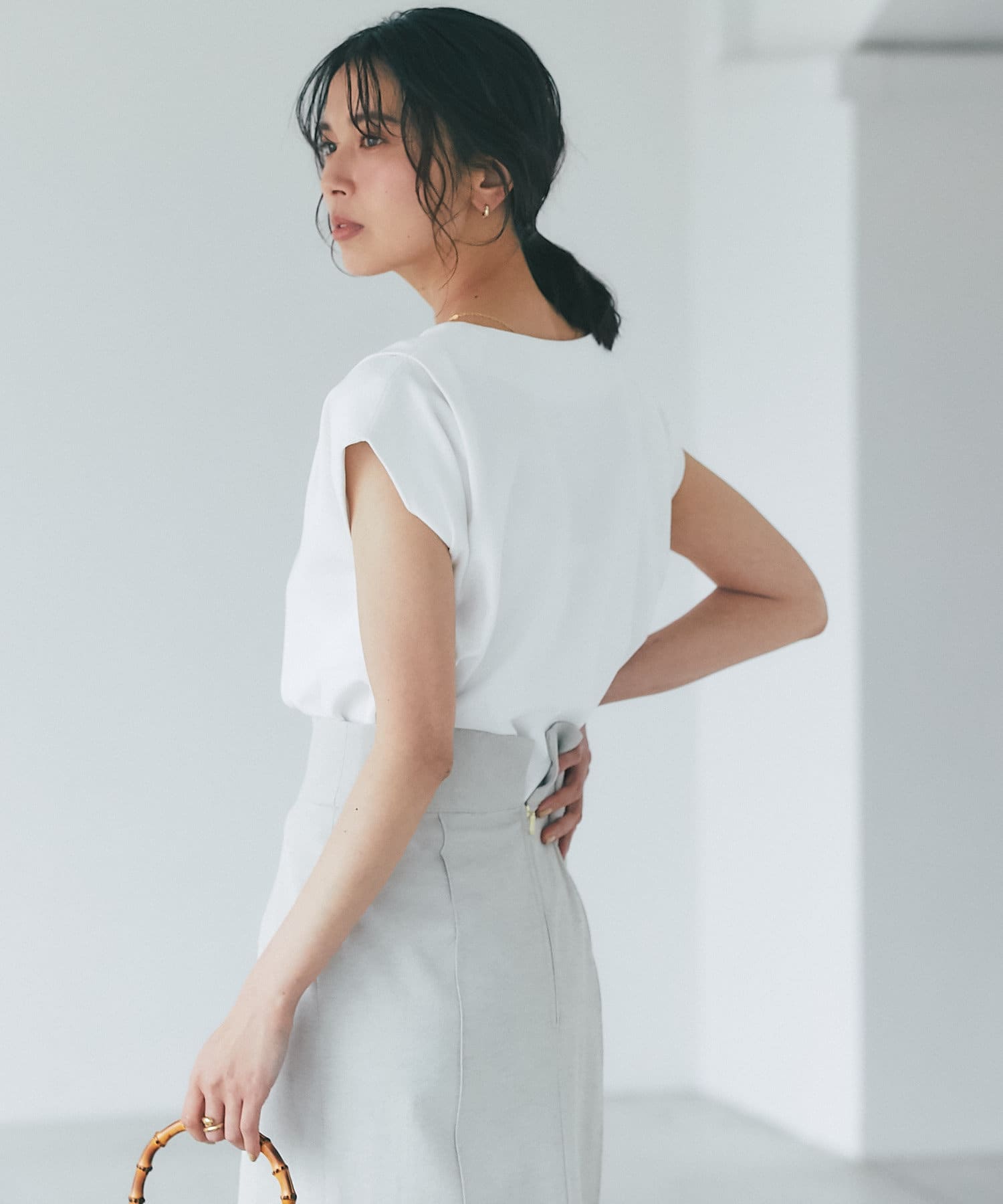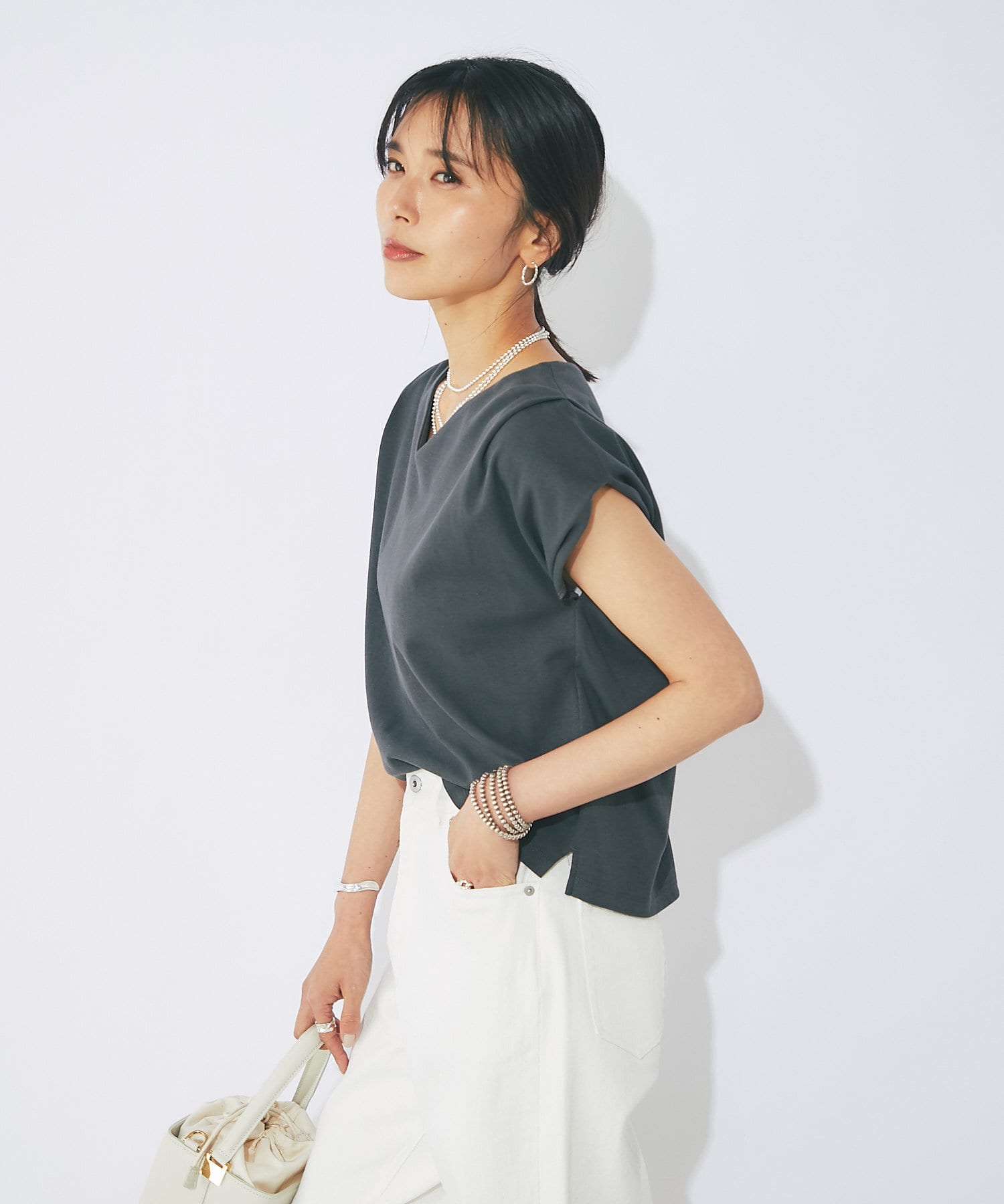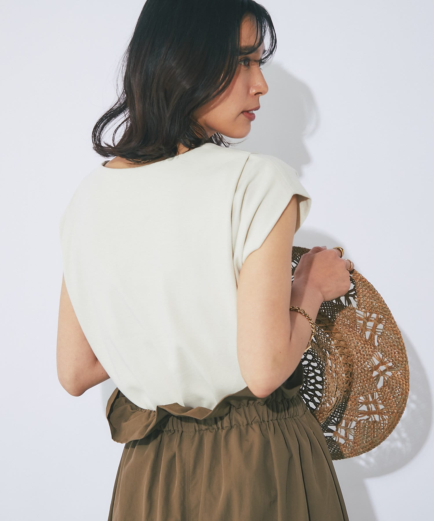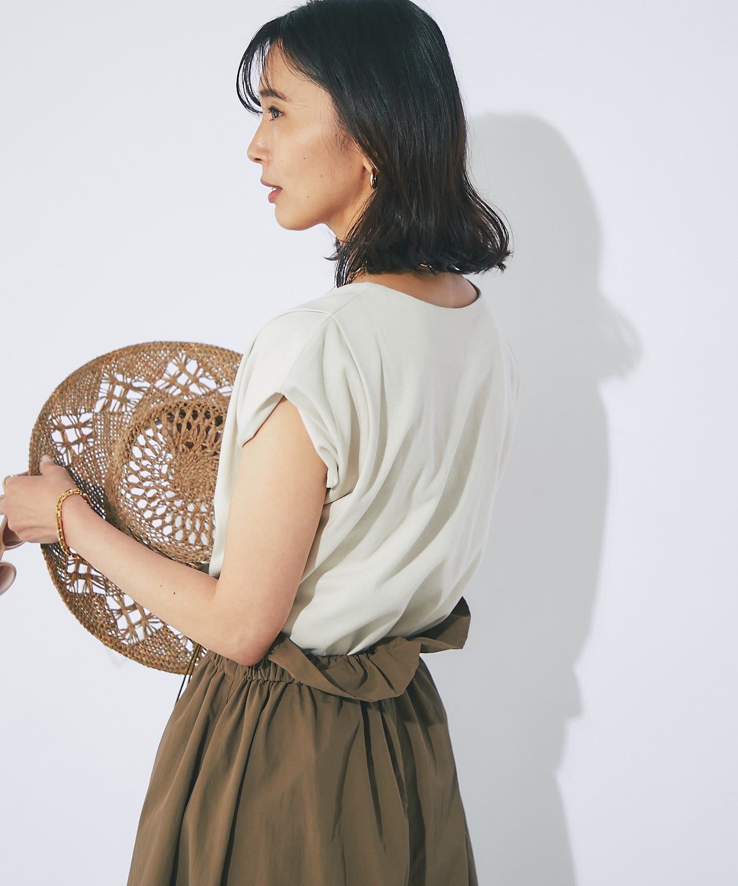 ⇒ノースリーブよりも肩にかかるデザインのため安心感があり、二の腕を華奢見えさせるシルエットになっております。