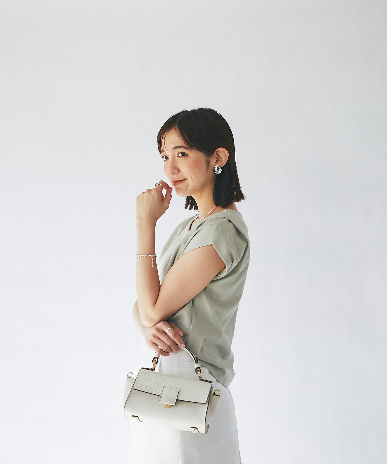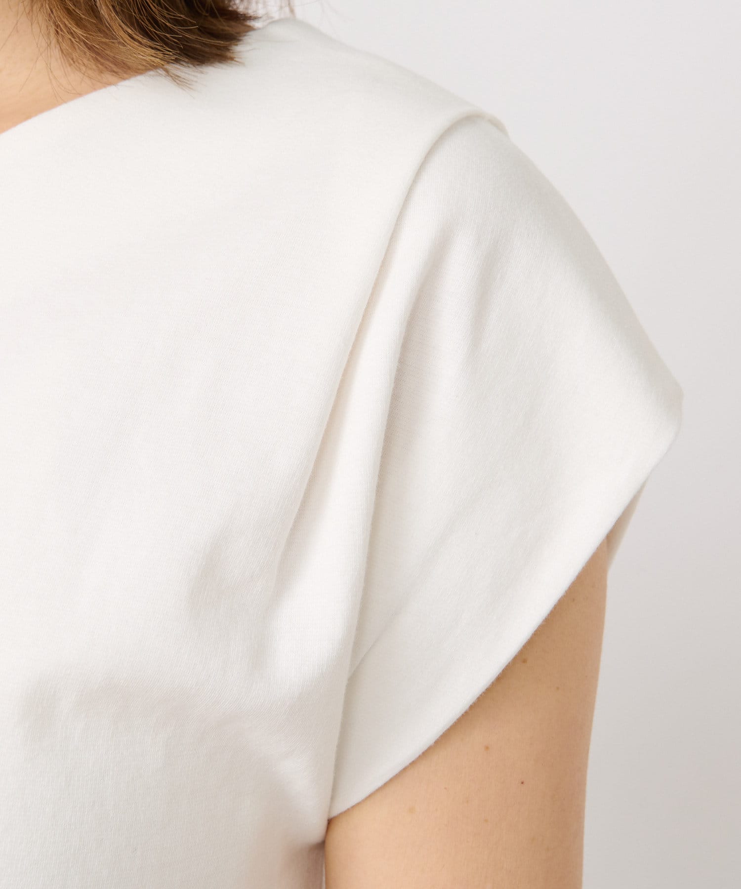 肩や袖のタックデザインがポイントとなり、腕周りを華奢見えさせてくれるのも◎