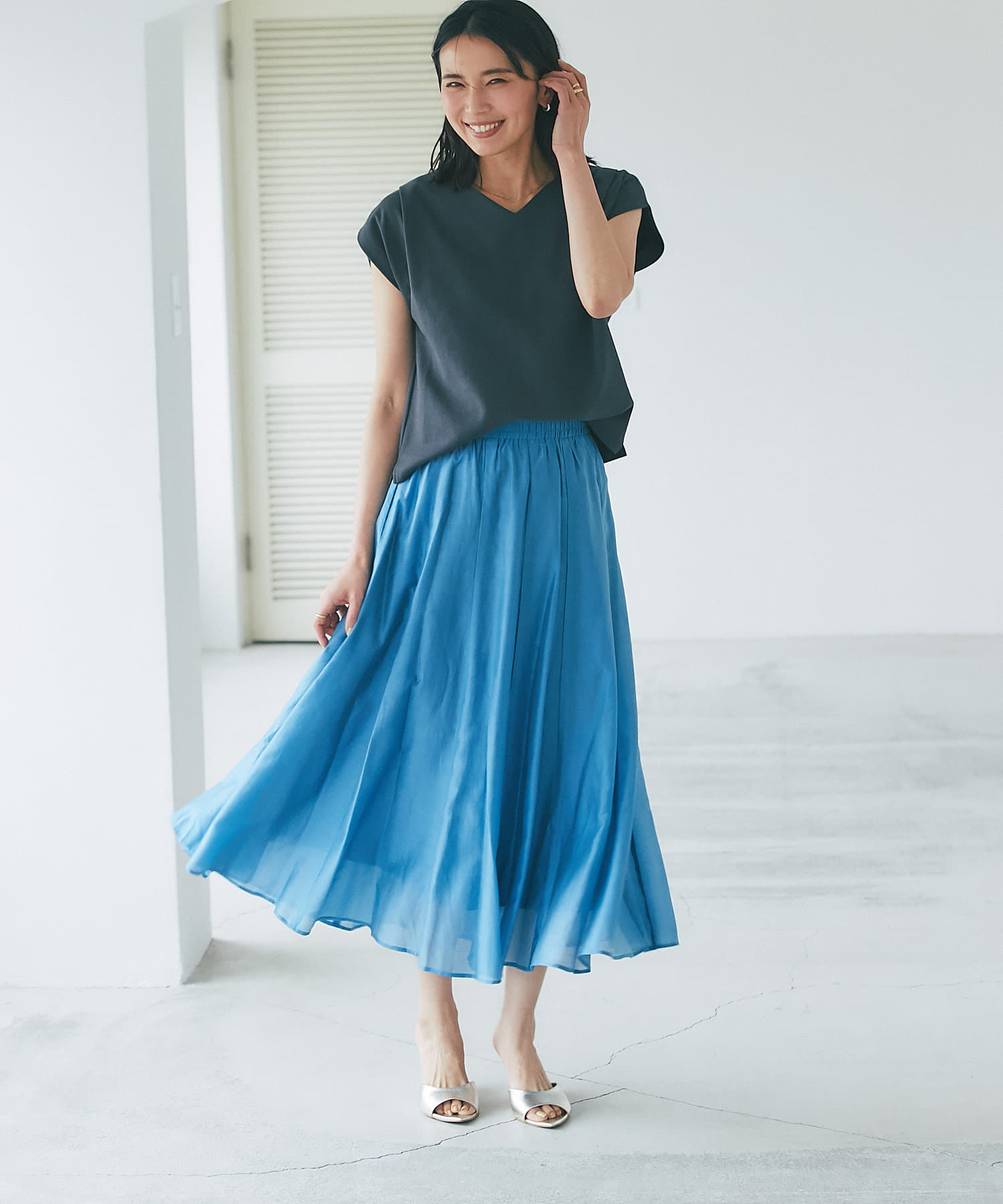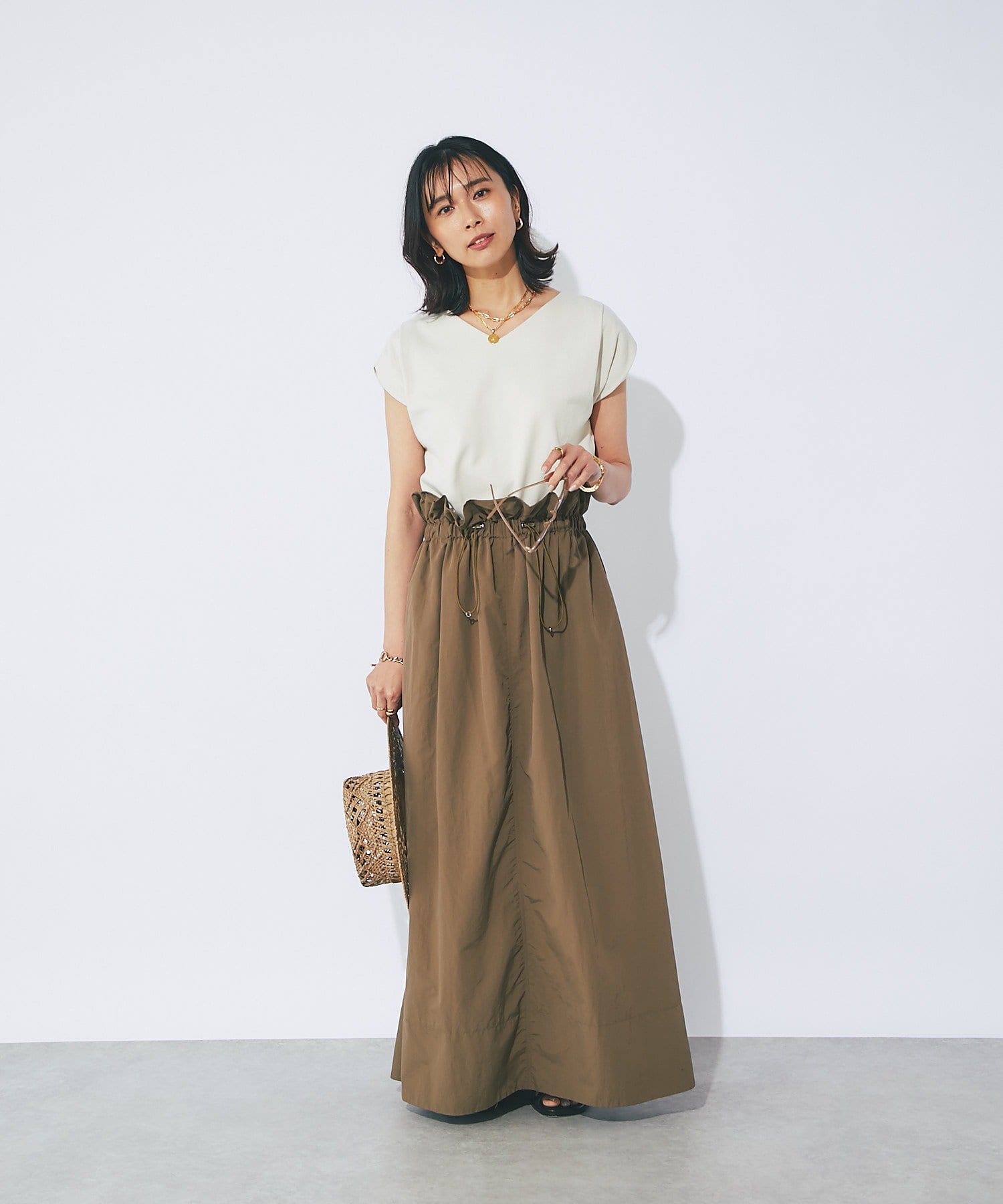 ウエストインでフレアスカートと合わせて女性らしくコーディネートしたり、パンツスタイルでもカジュアルになりすぎずキレイめにまとめまるので合わせるアイテムを選びません。