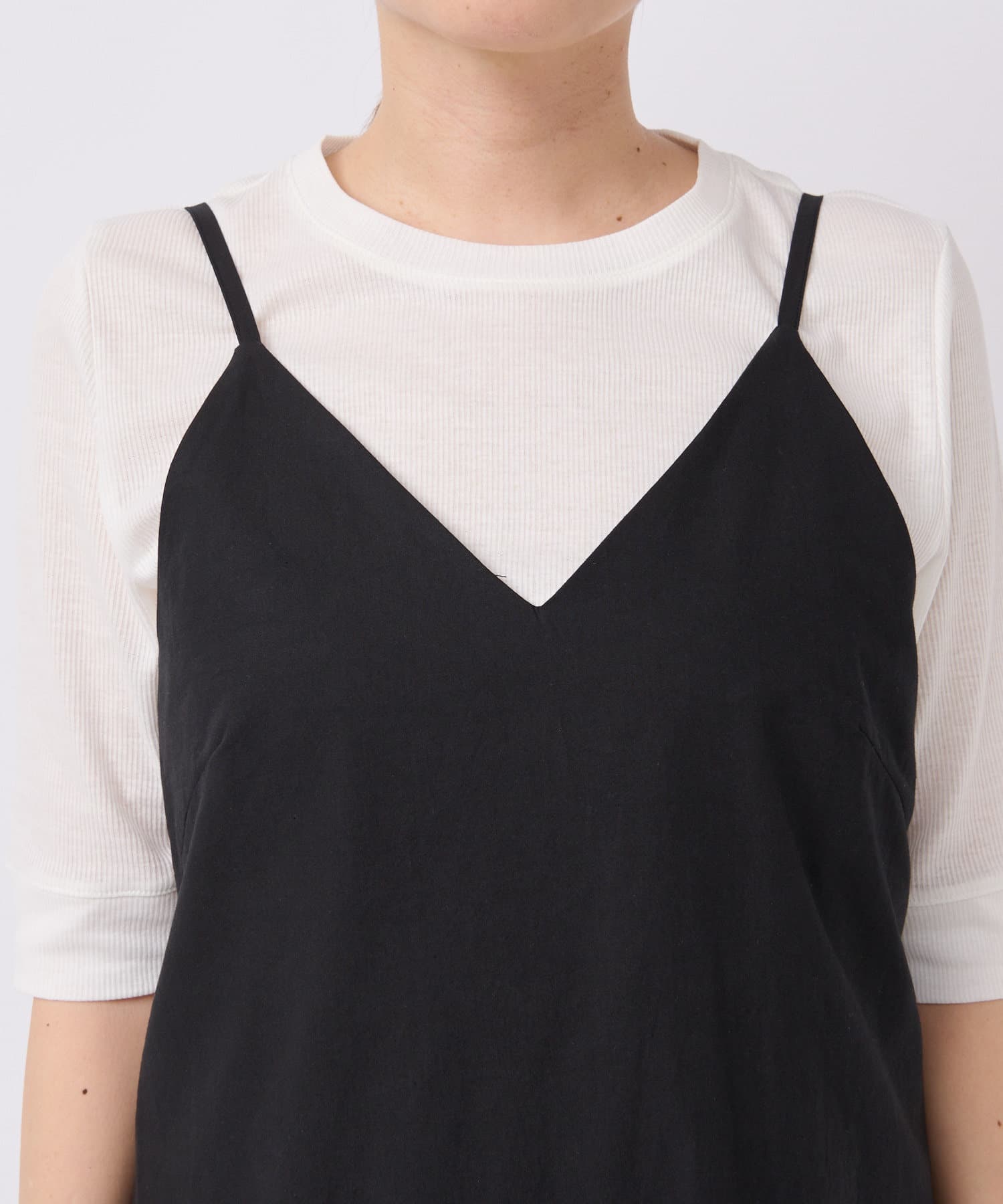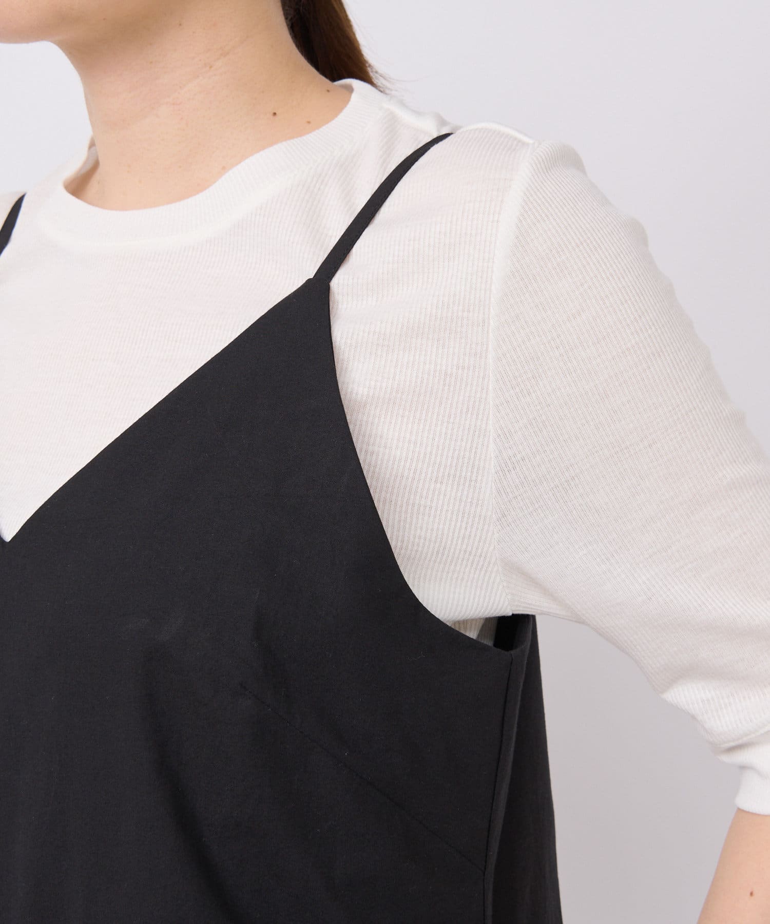 程よい開きの衿周りとアームホールの作りで1枚で着用いただけます。