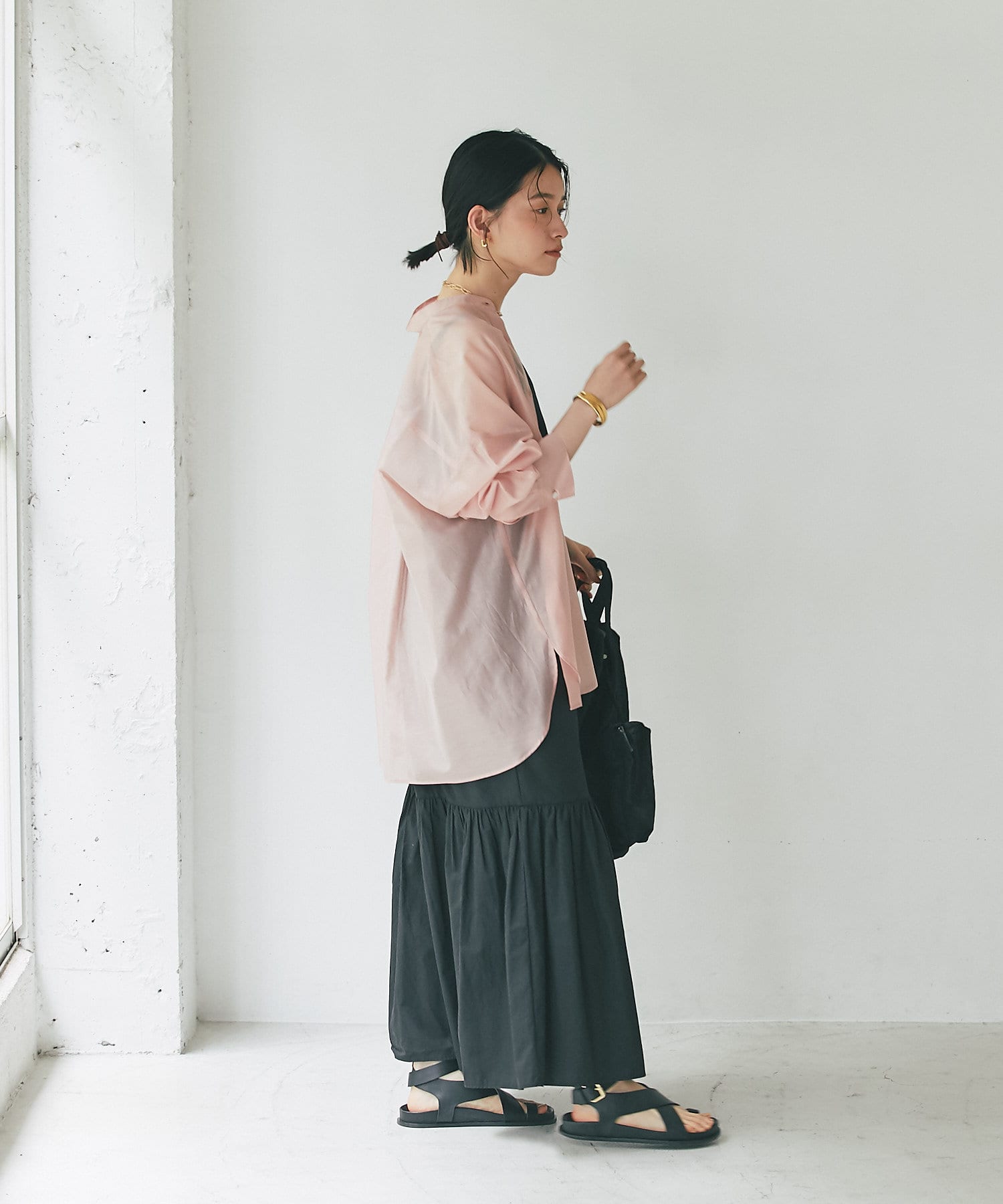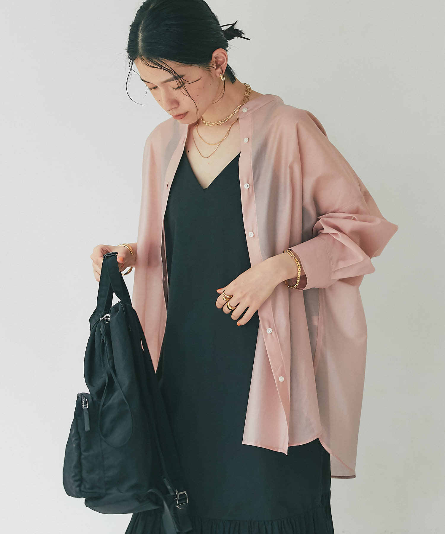 インナーにはさりげなく身体のラインが出るようなシアーカットソーなど、薄手のものを合わせていただくとコンパクトにまとまります。