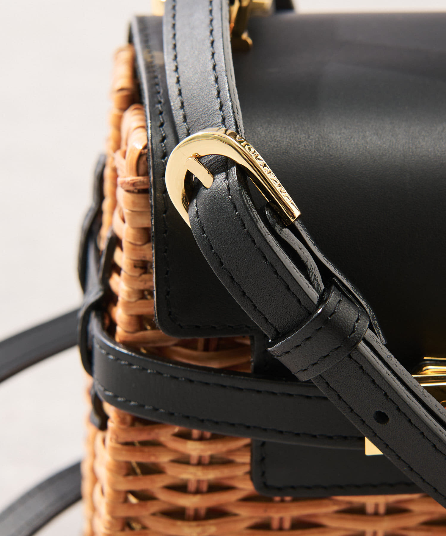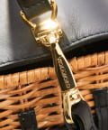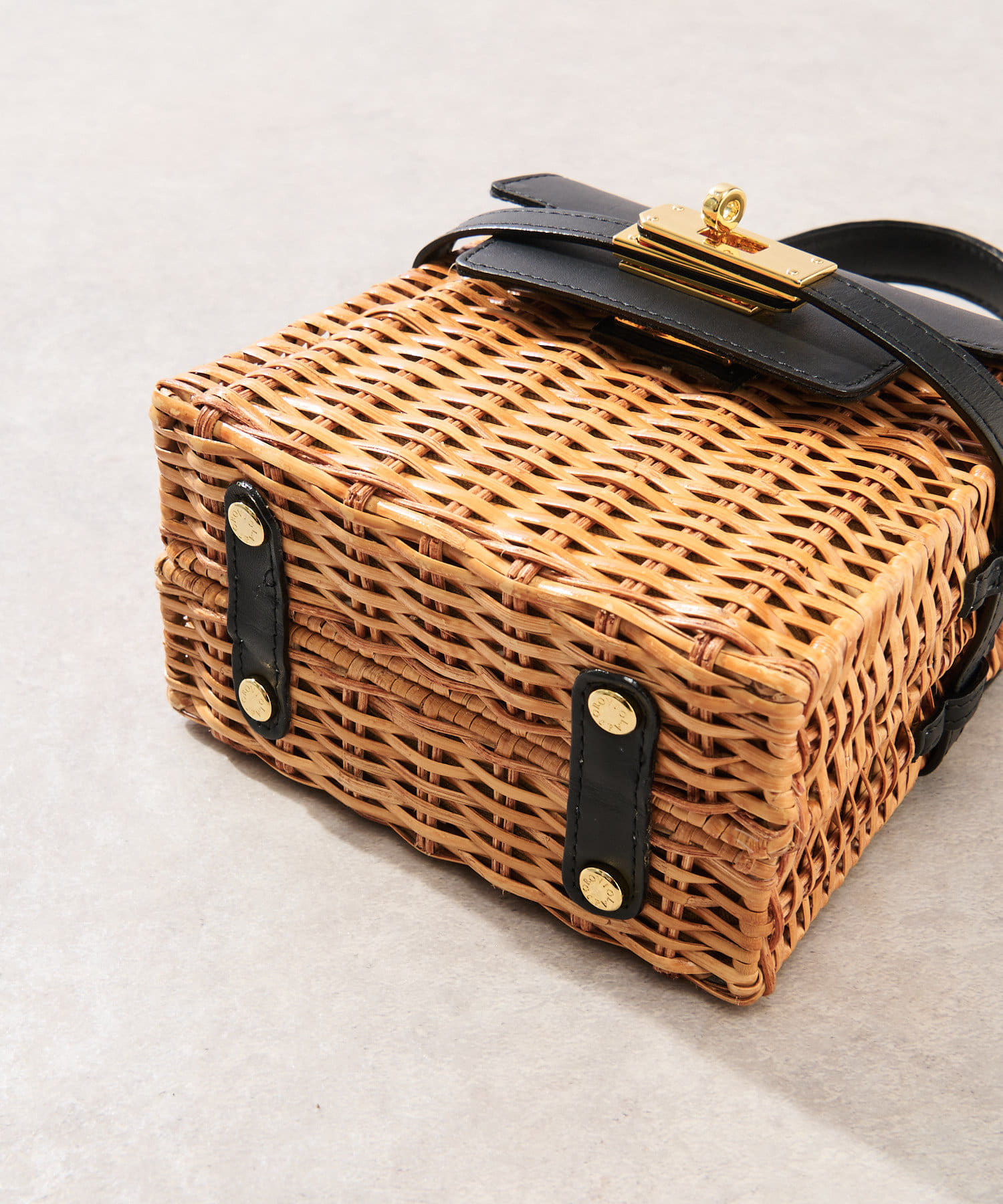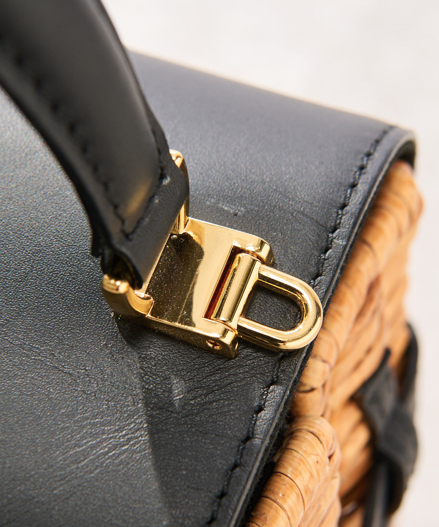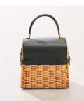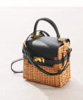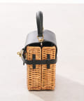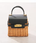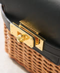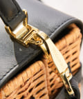 ラタン、ブラックのレザー、ゴールドの金具が高級感のあるミニバッグ。