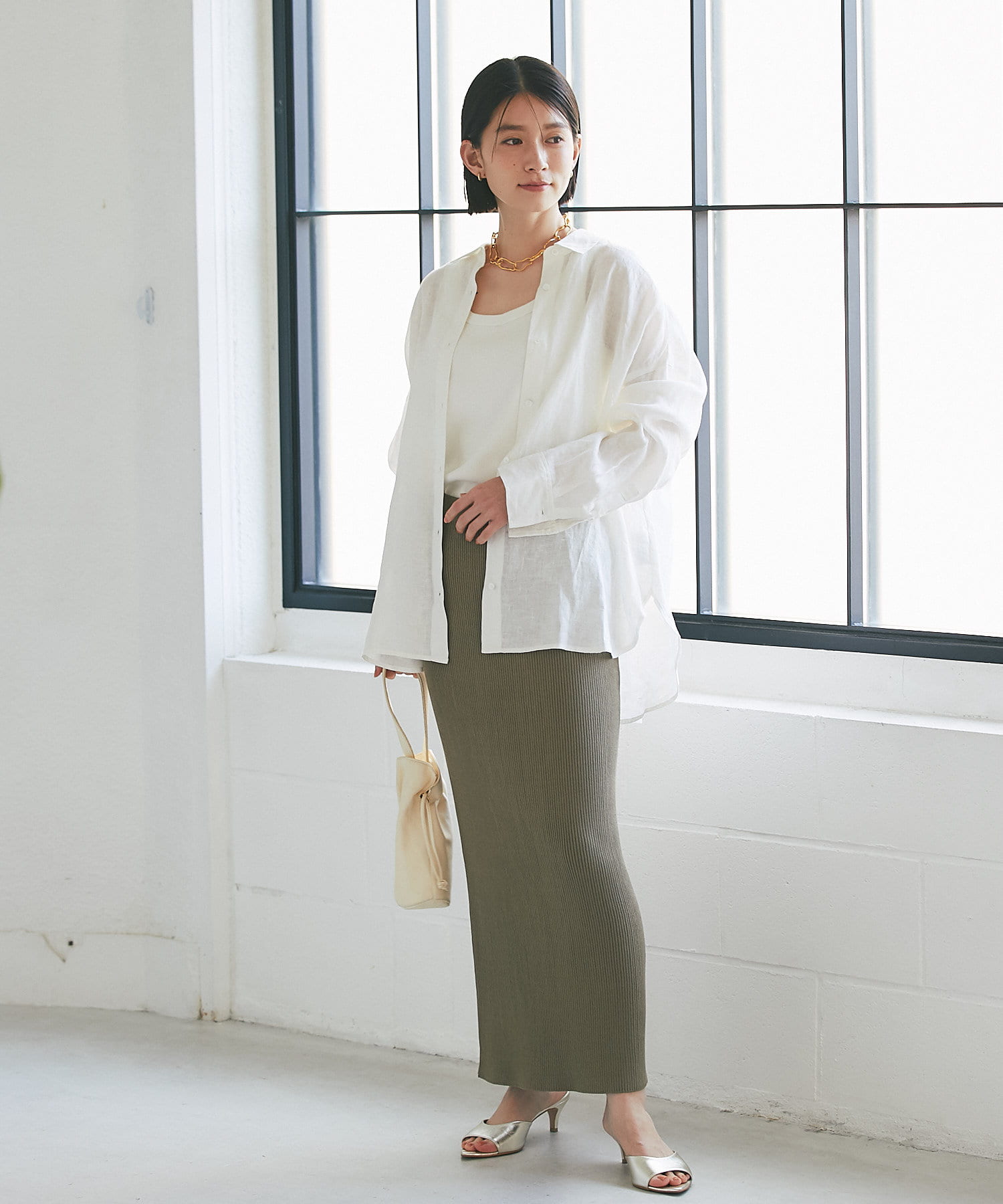 ⇒低身長スタッフの間でも人気のリブスカート。153㎝~155㎝のスタッフ達はウエストを1折りするとマキシ丈としてフラットシューズと合わせて着用可能でした。トップスにゆったりとしたカットソーやシャツを合わせるなど、ウエスト部分が隠れるコーディネートをしていただくと折り目も目立たず綺麗に着ていただけるのでおすすです。