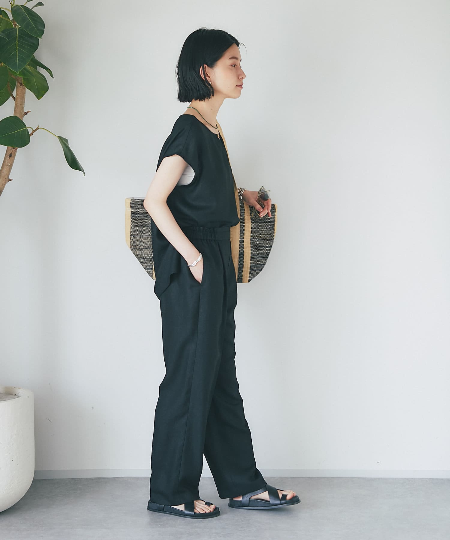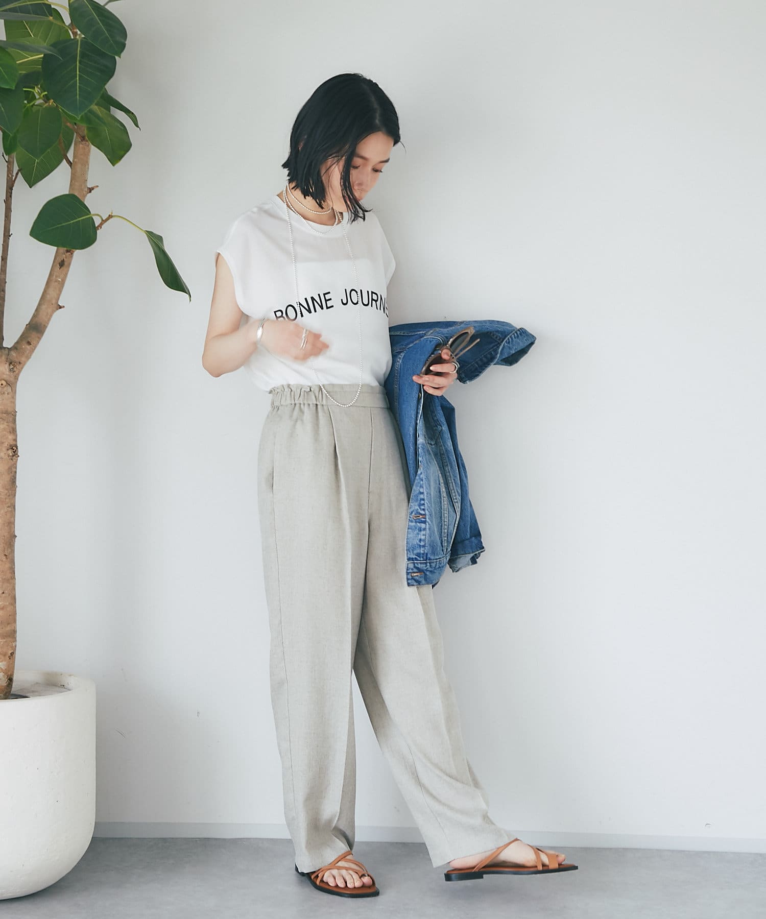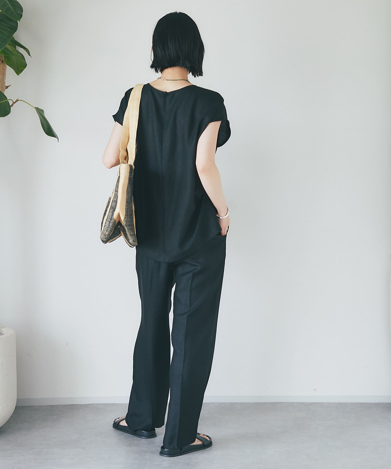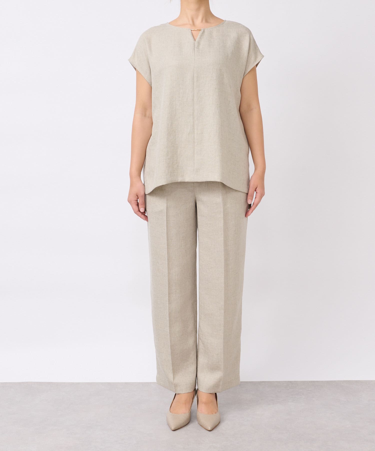 同素材で展開しているリネンライクフレンチスリーブとのセットアップコーディネートがおすすめ。ゆったりとしているのにラフすぎず、上品に着ていただけるのでお仕事や特別な日にも着ていただけます。