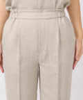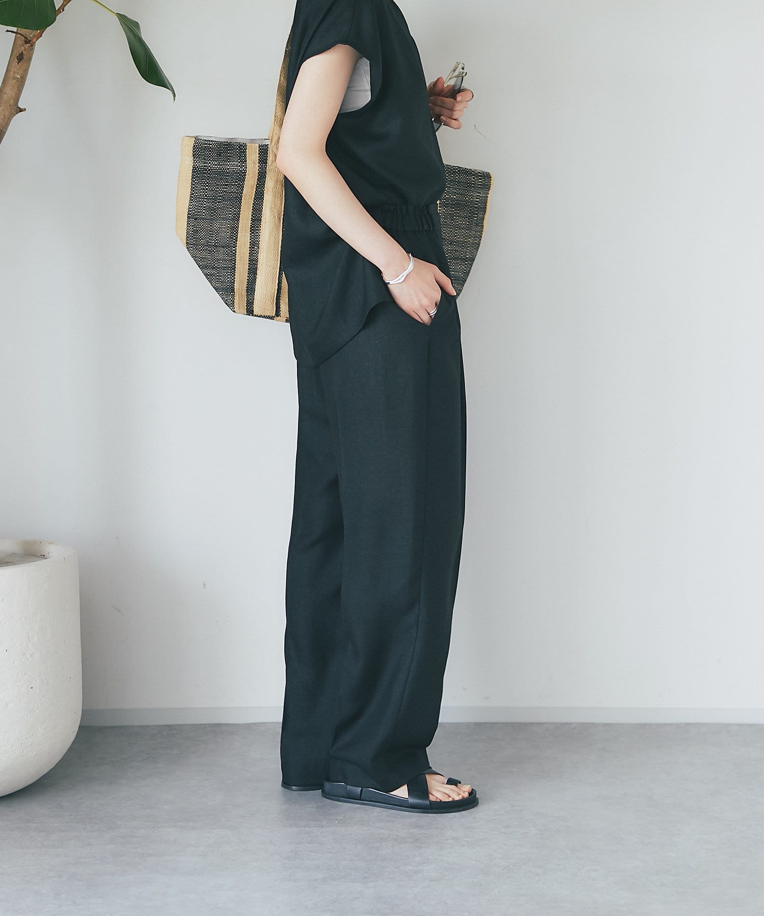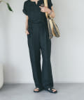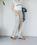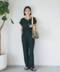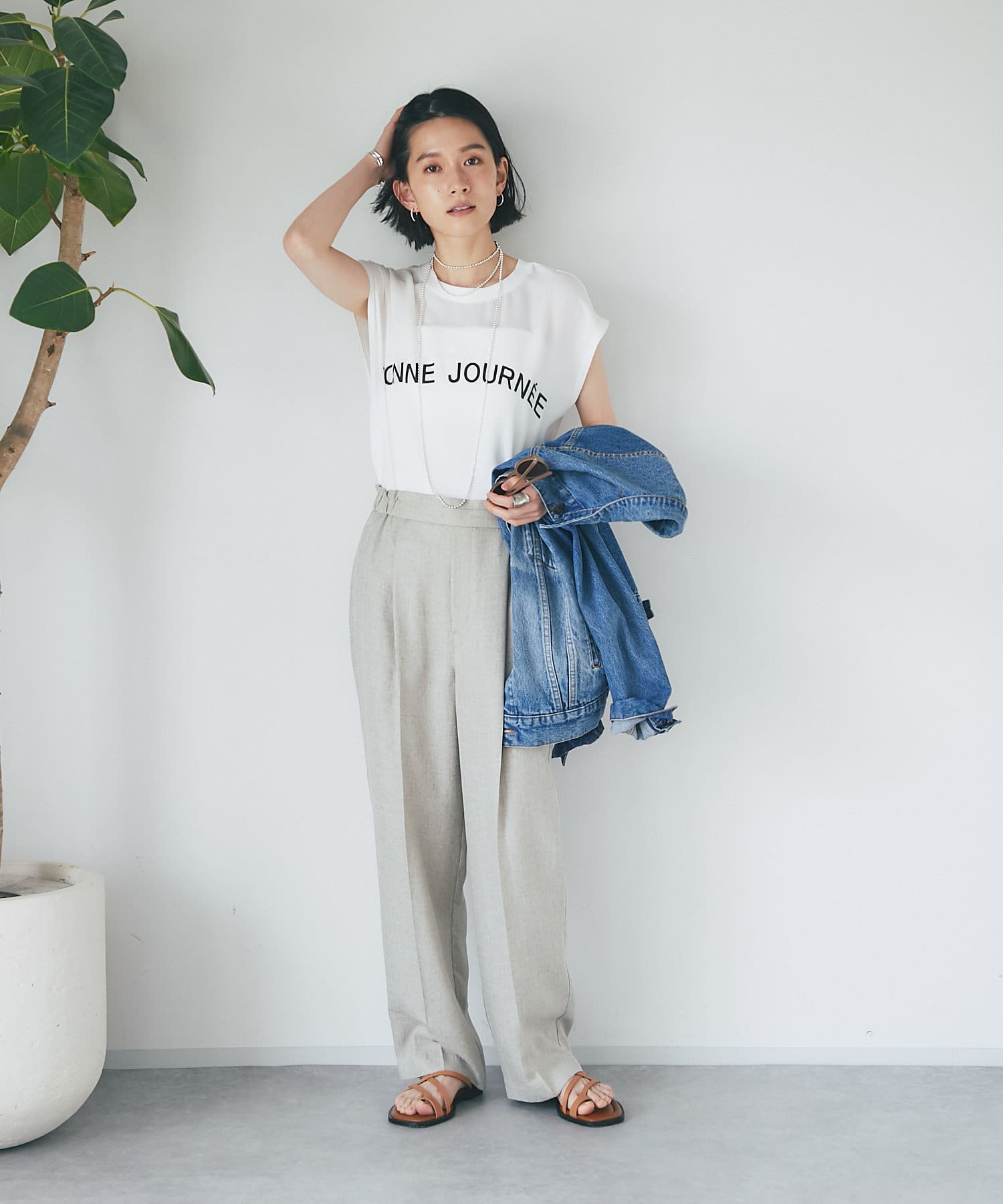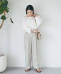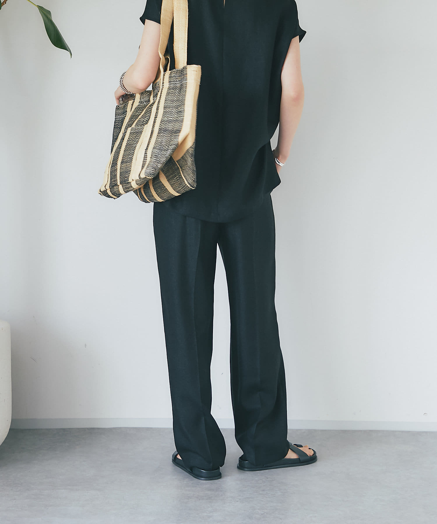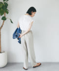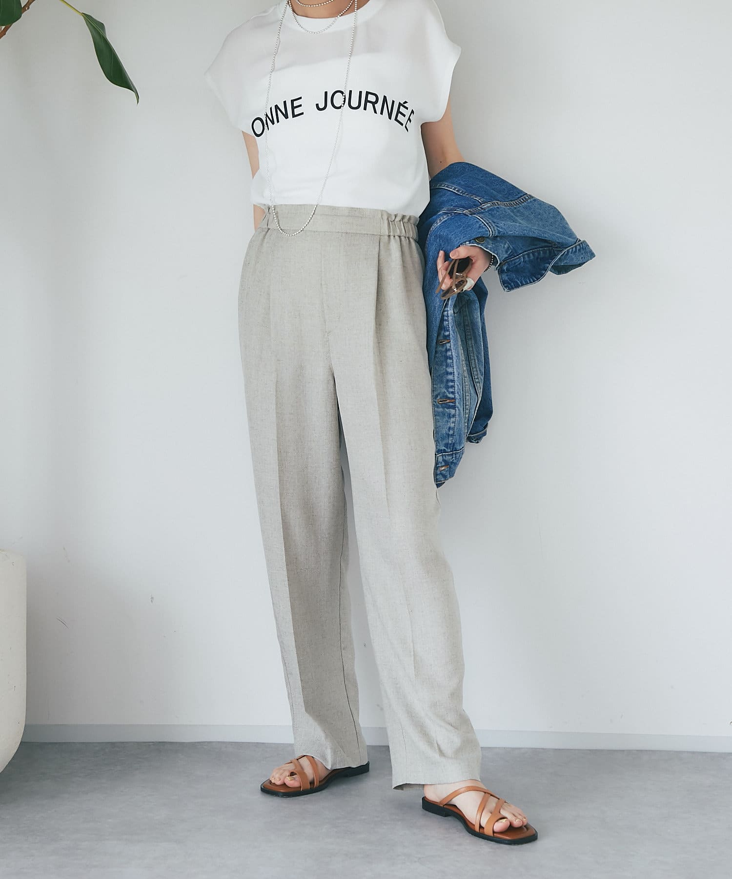 同素材で展開しているリネンライクフレンチスリーブとのセットアップコーディネートがおすすめ。ゆったりとしているのにラフすぎず、上品に着ていただけるのでお仕事や特別な日にも着ていただけます。