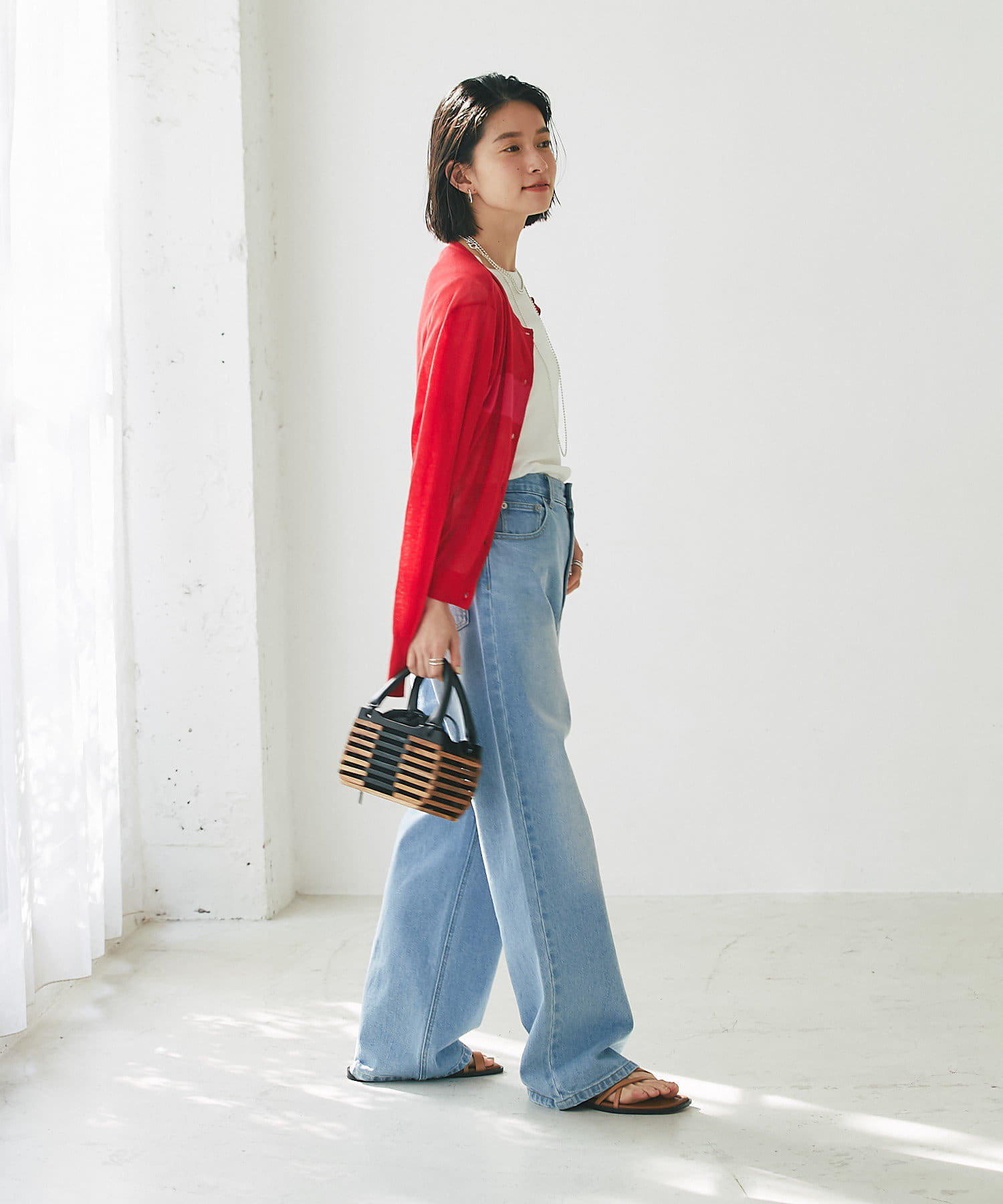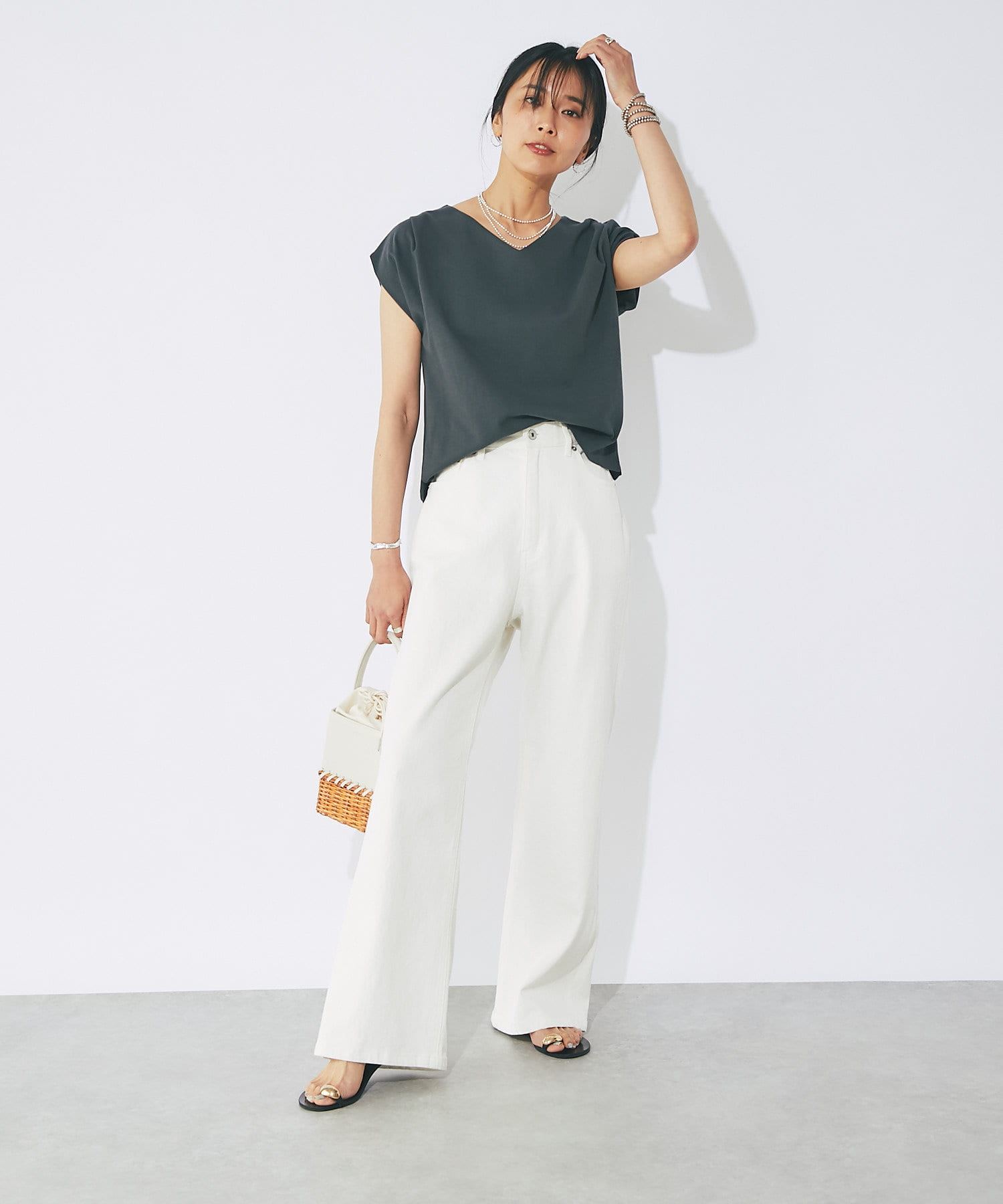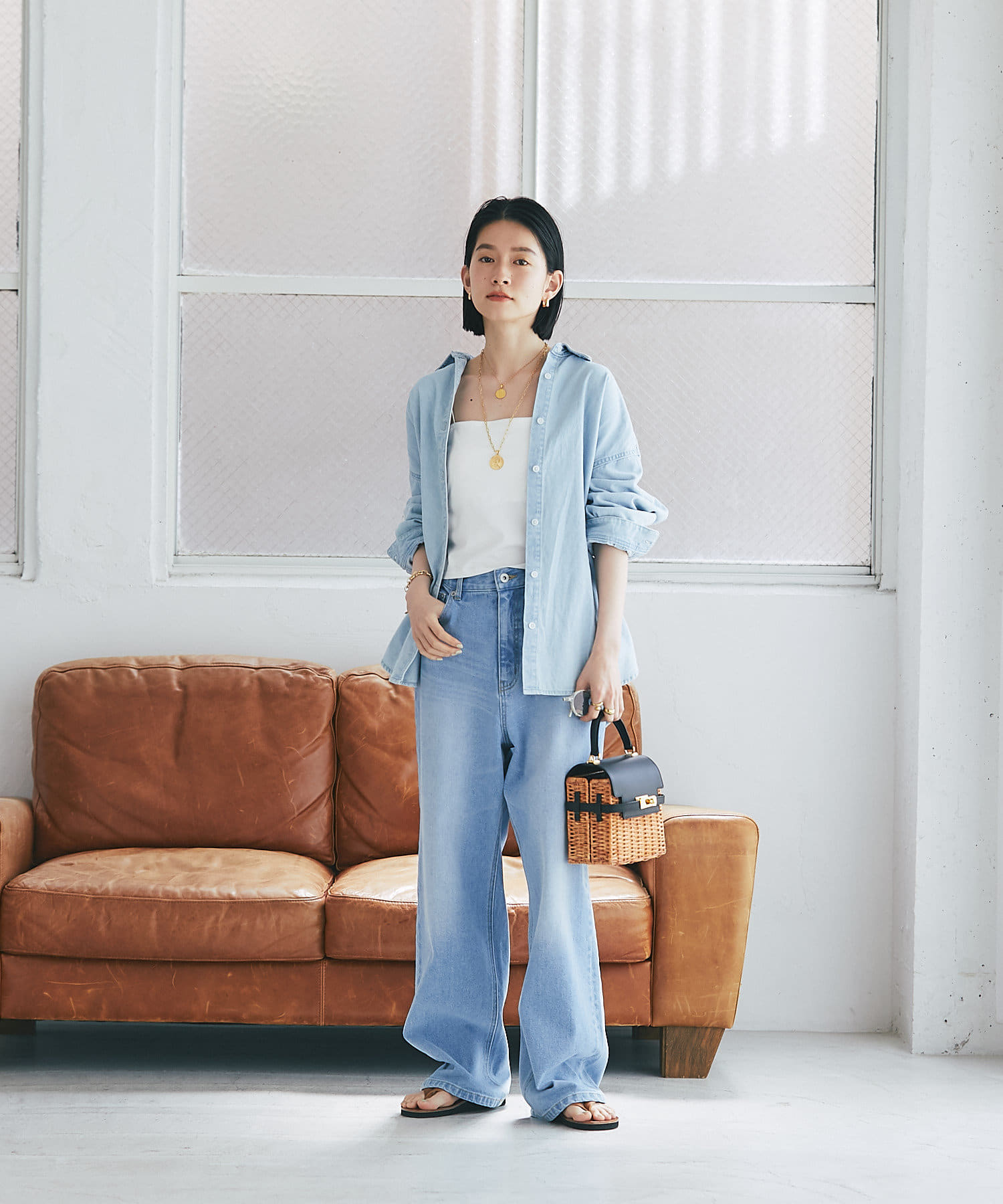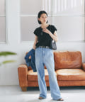 トップスの色はお選びのデニムのカラーと同系色にして、ワントーンでコーディネートしていただくのもトレンドライクでオススメです。