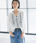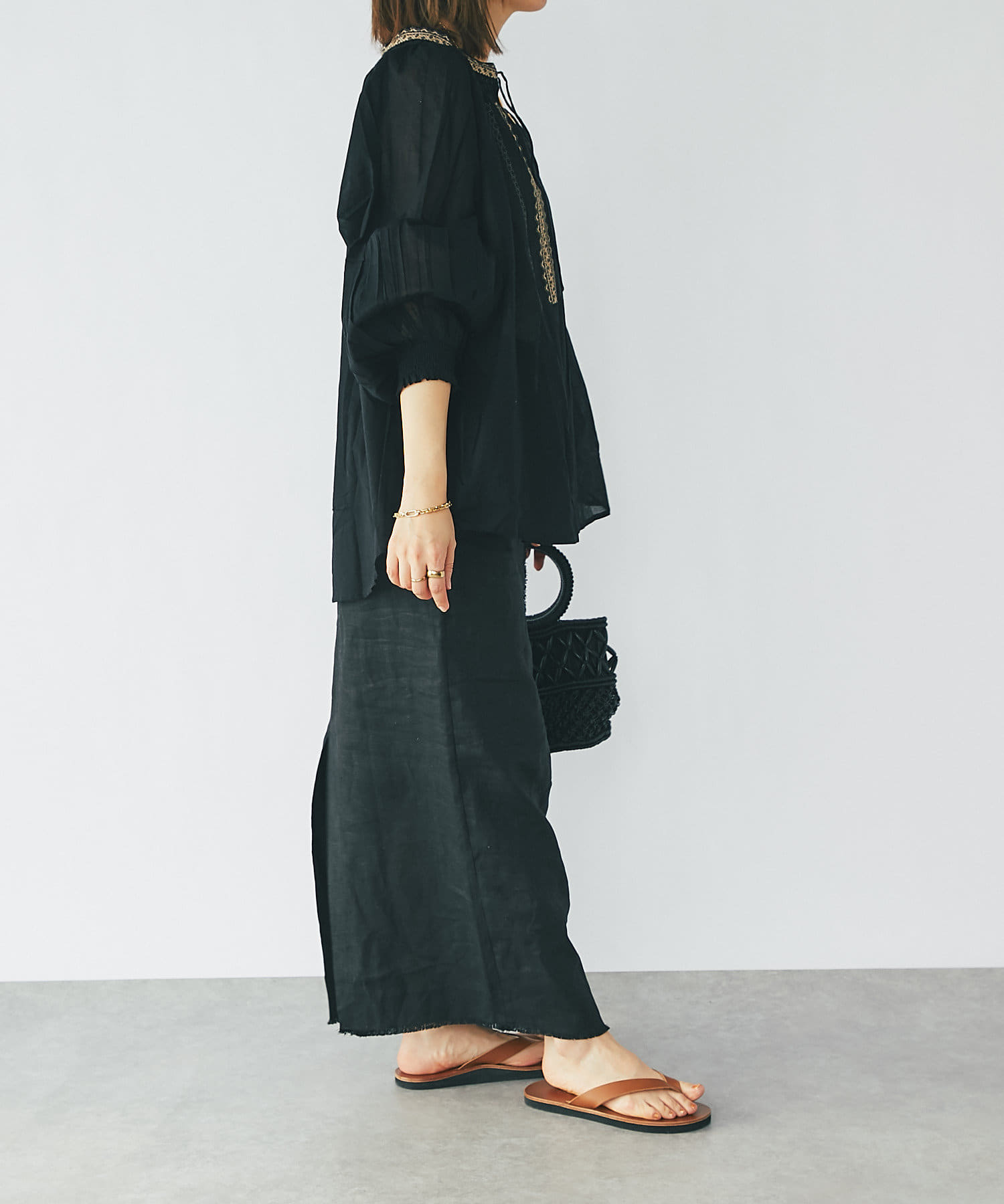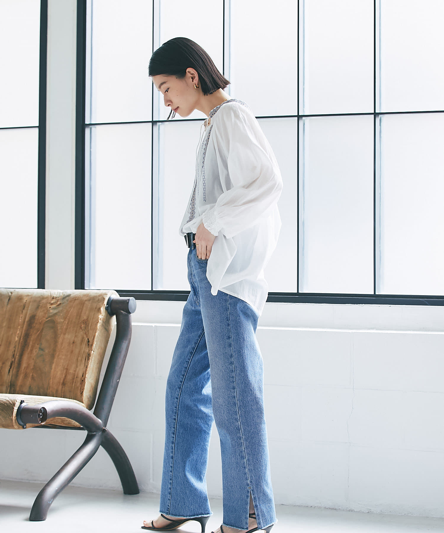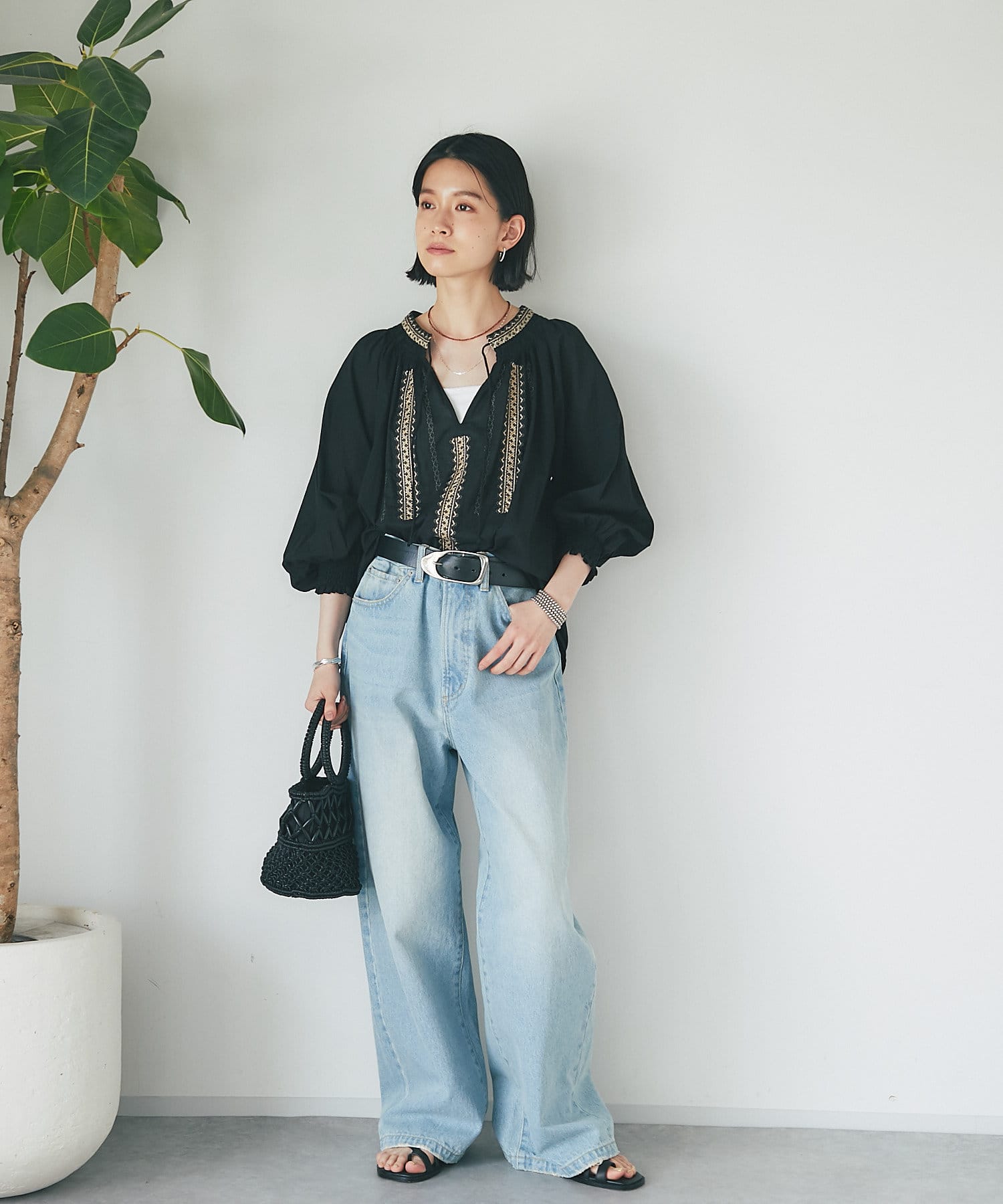 ナチュラルな雰囲気の刺繍ブラウスは、ふわっとしたシルエットのためタイトスカートと合わせるとバランスがとりやすくておすすめ。