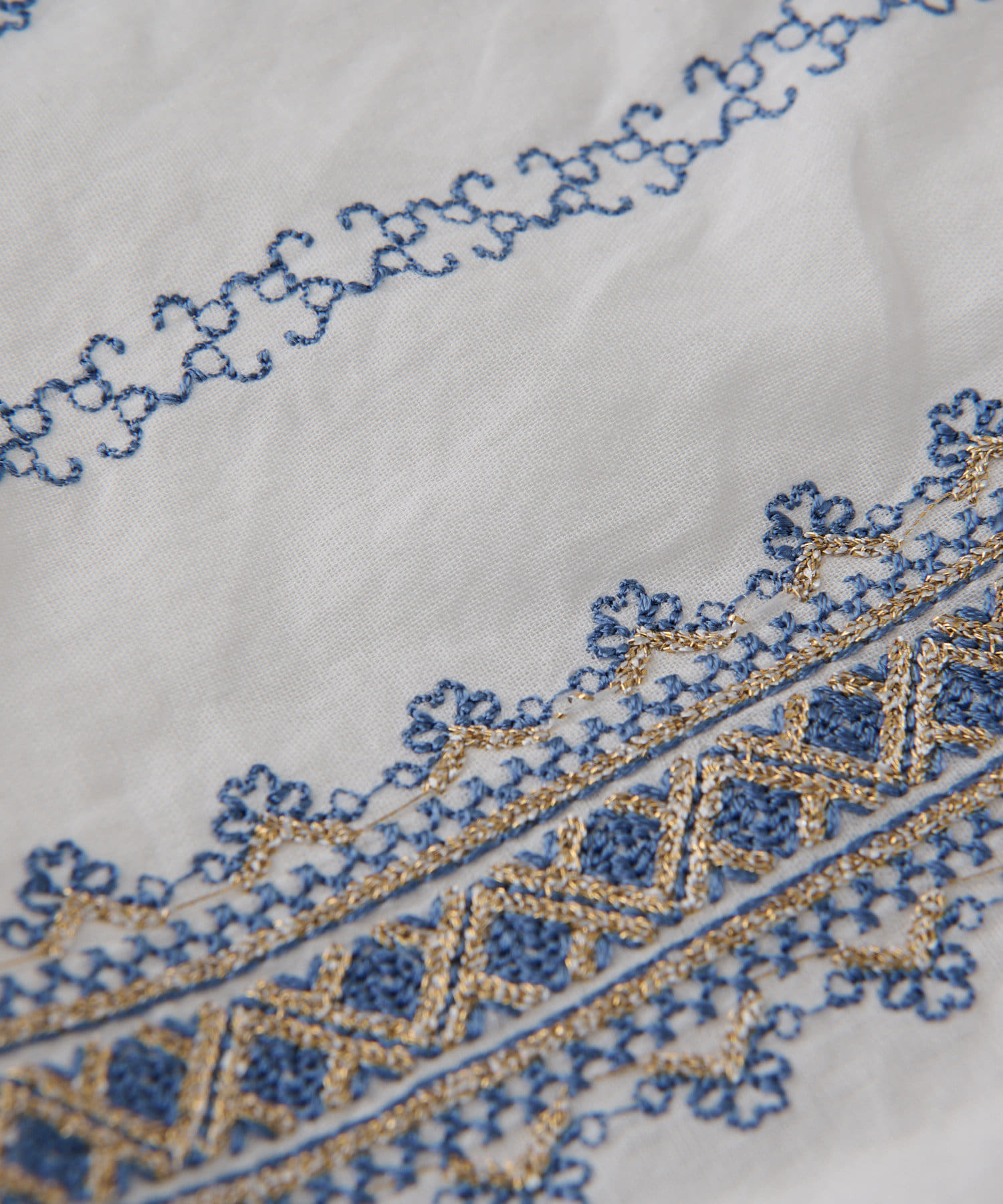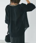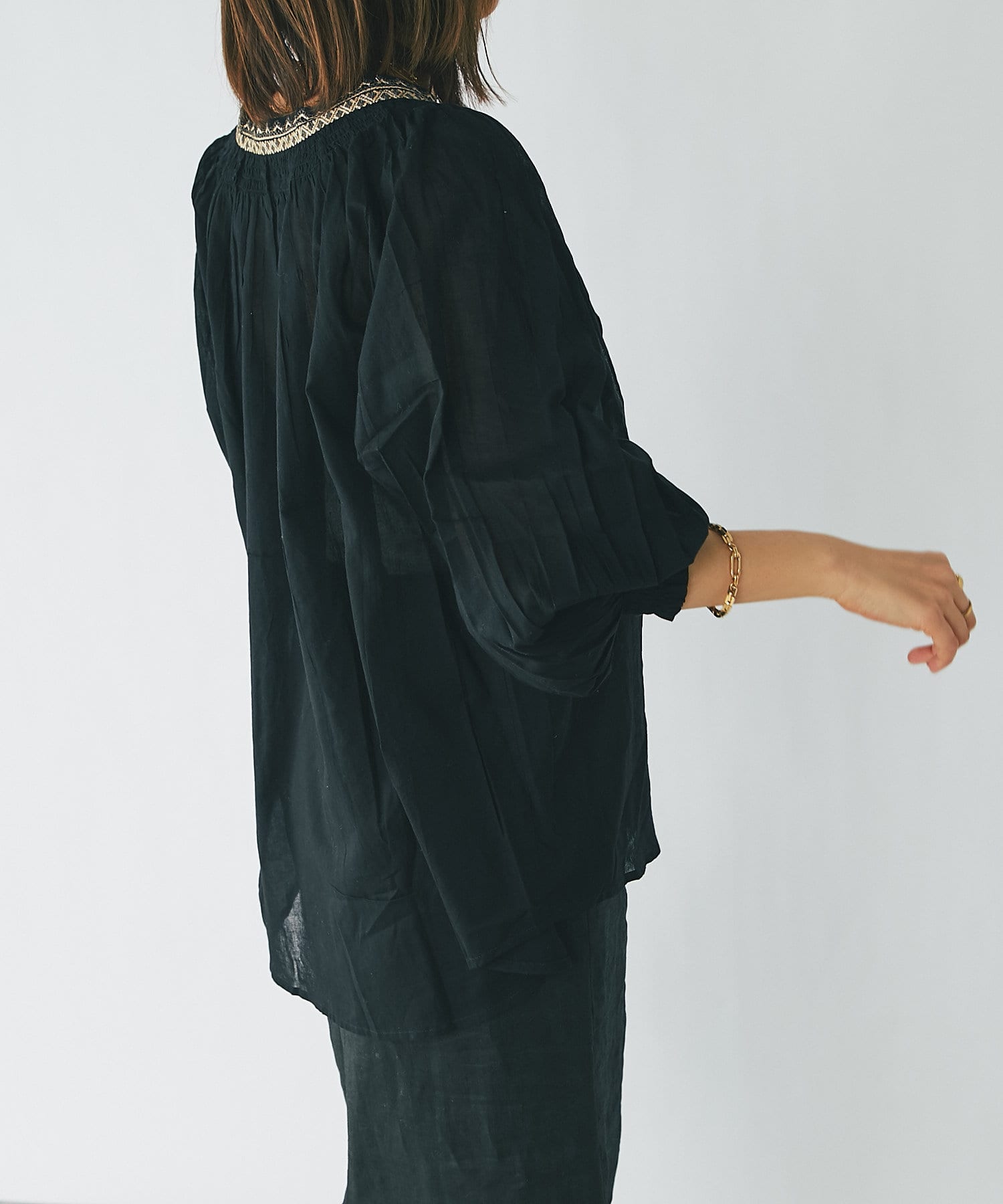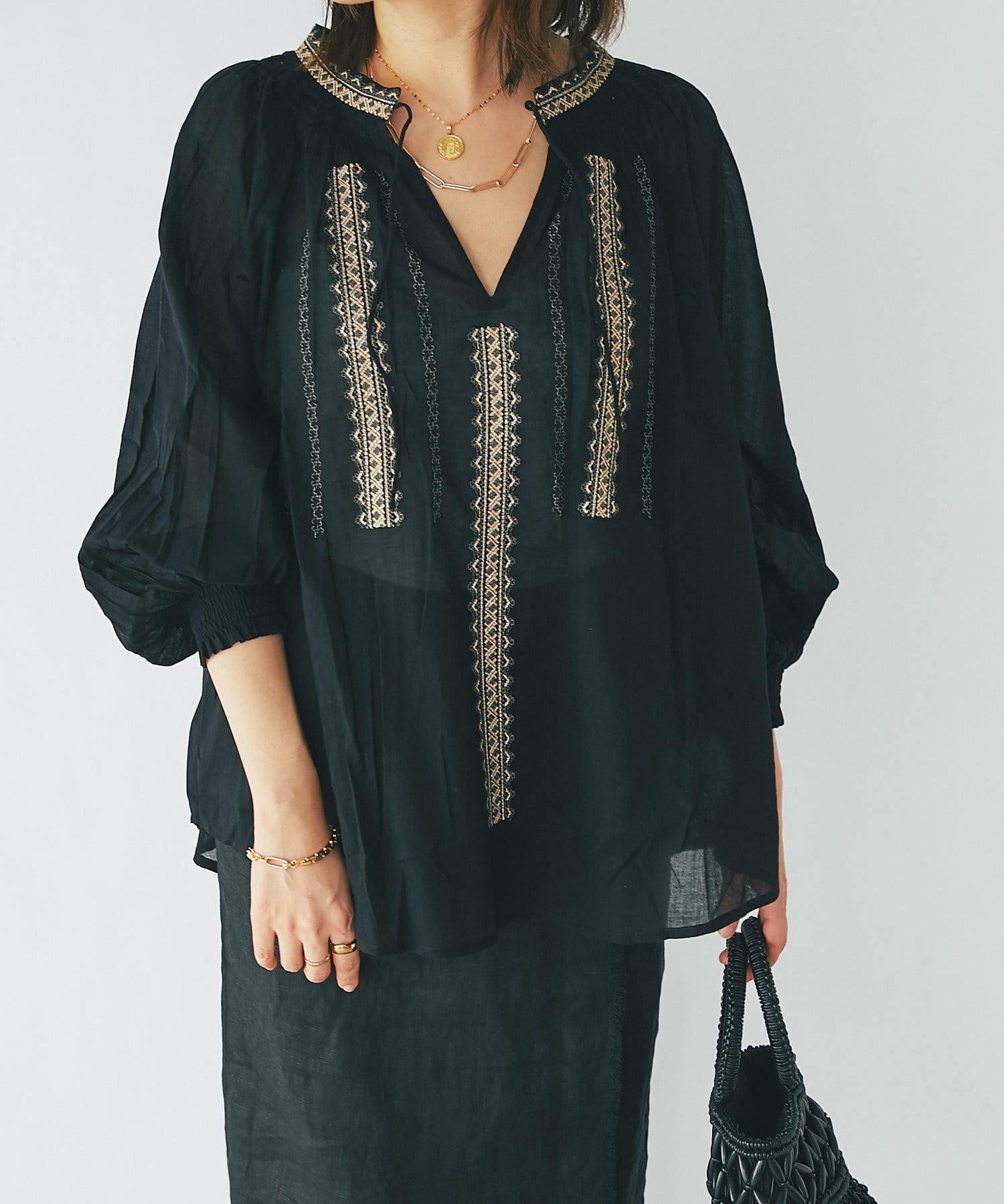 インド生産ならではの凝ったディテールと、胸元と衿に施された金刺繍が目を惹くブラウス。