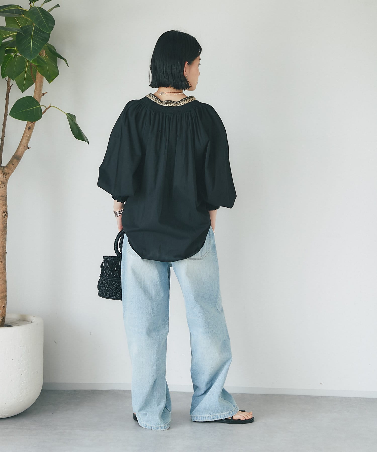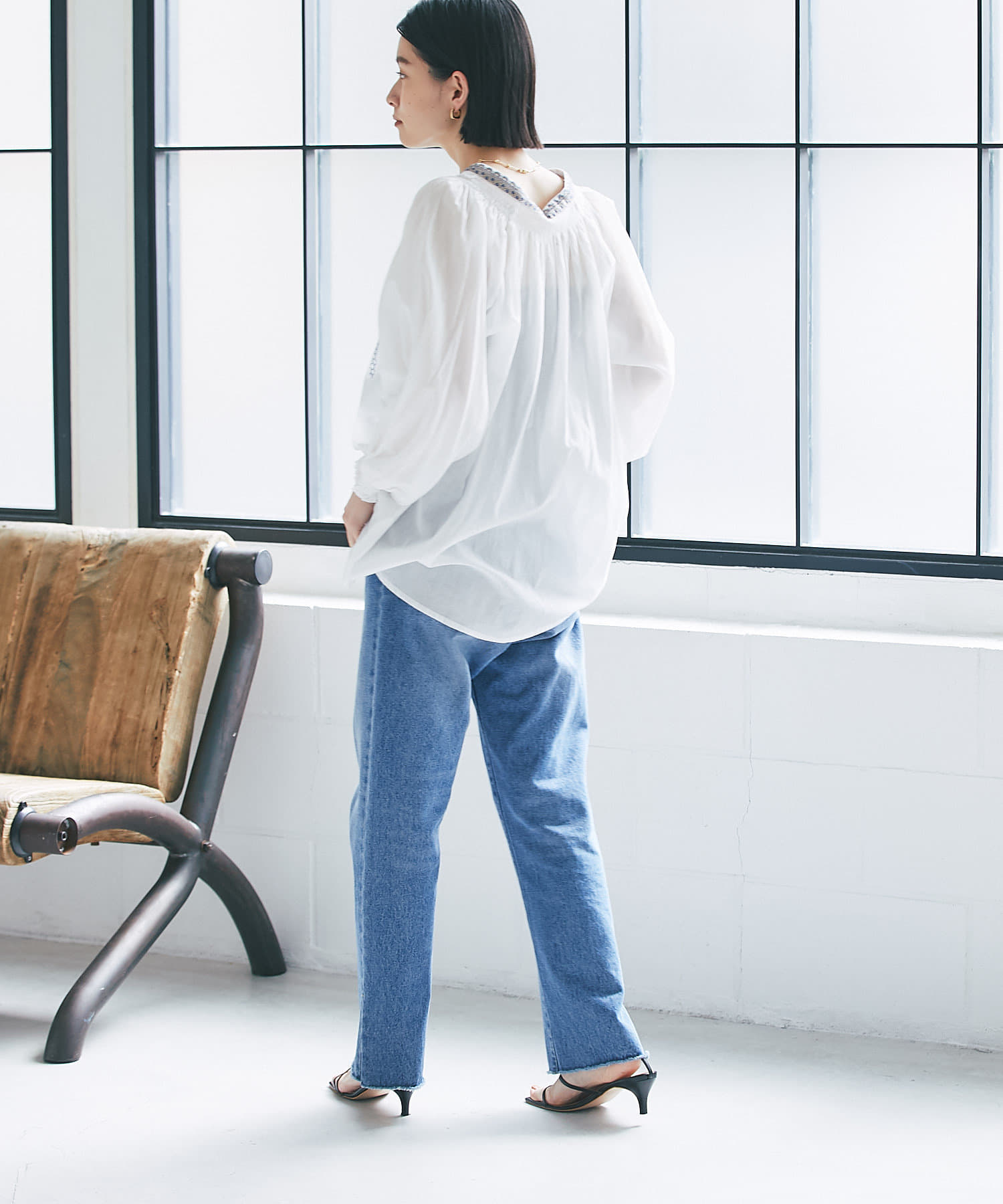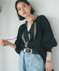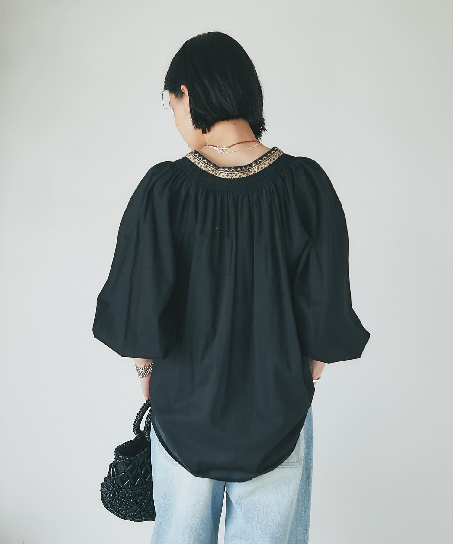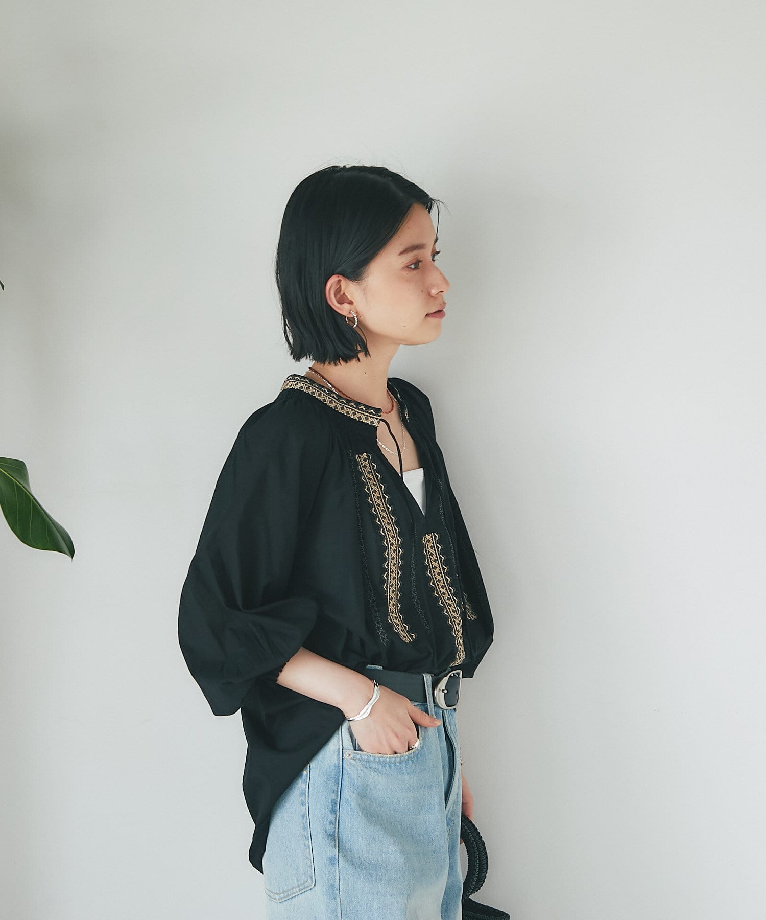 インド生産ならではの凝ったディテールと、胸元と衿に施された金刺繍が目を惹くブラウス。