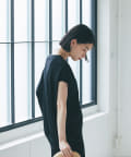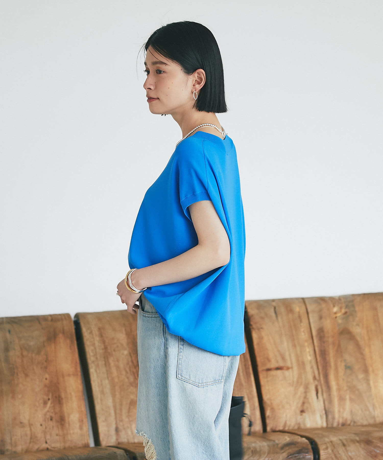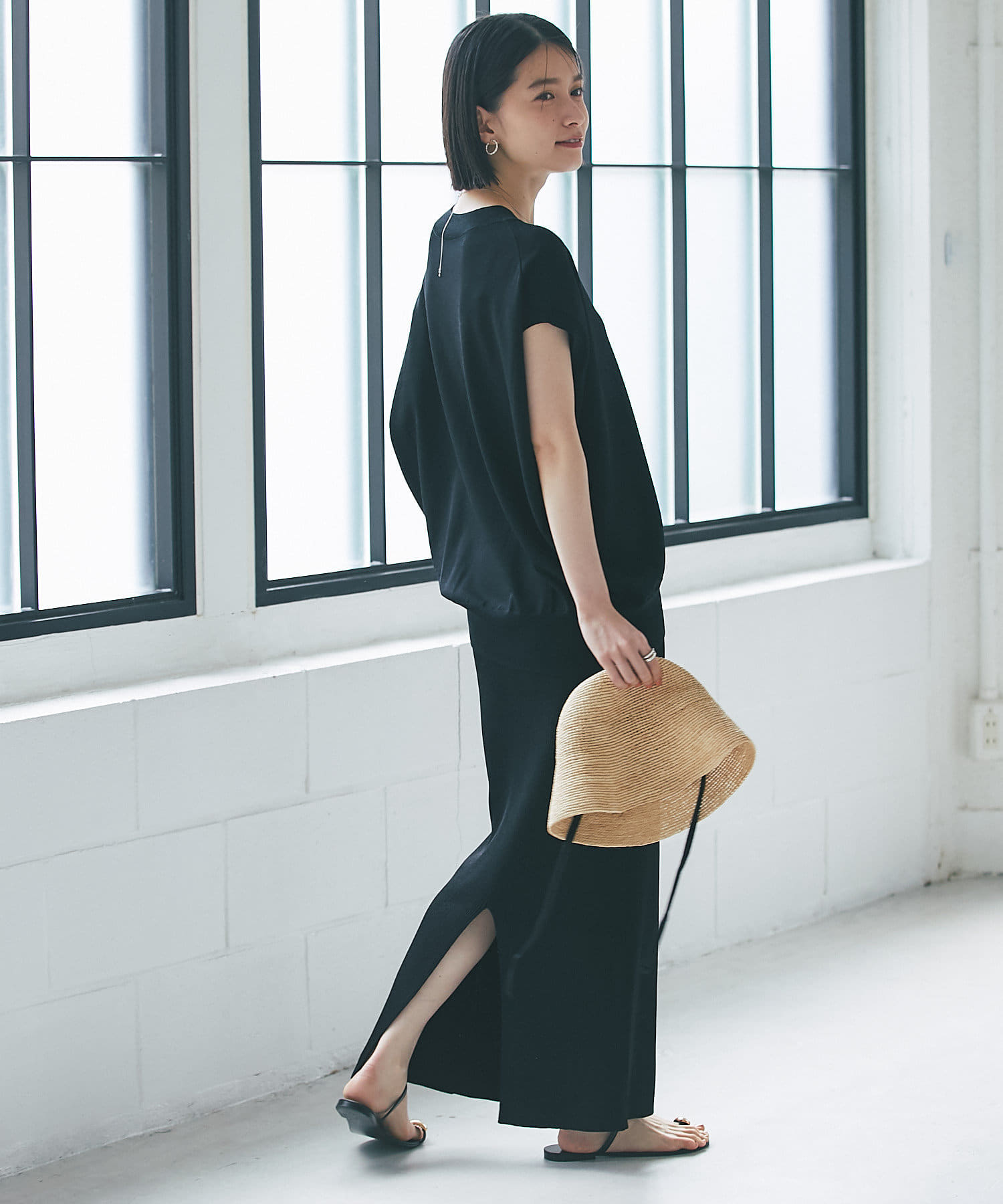 二の腕をカバーする絶妙な袖丈と、ゆったり丸みのあるシルエットのバランスが取れた、体型カバーと洒落感をあわせ持った優秀デザイン。                               前後差をつけたラウンドヘム(裾を丸くしたデザイン)とサイドスリットで抜け感もプラス。