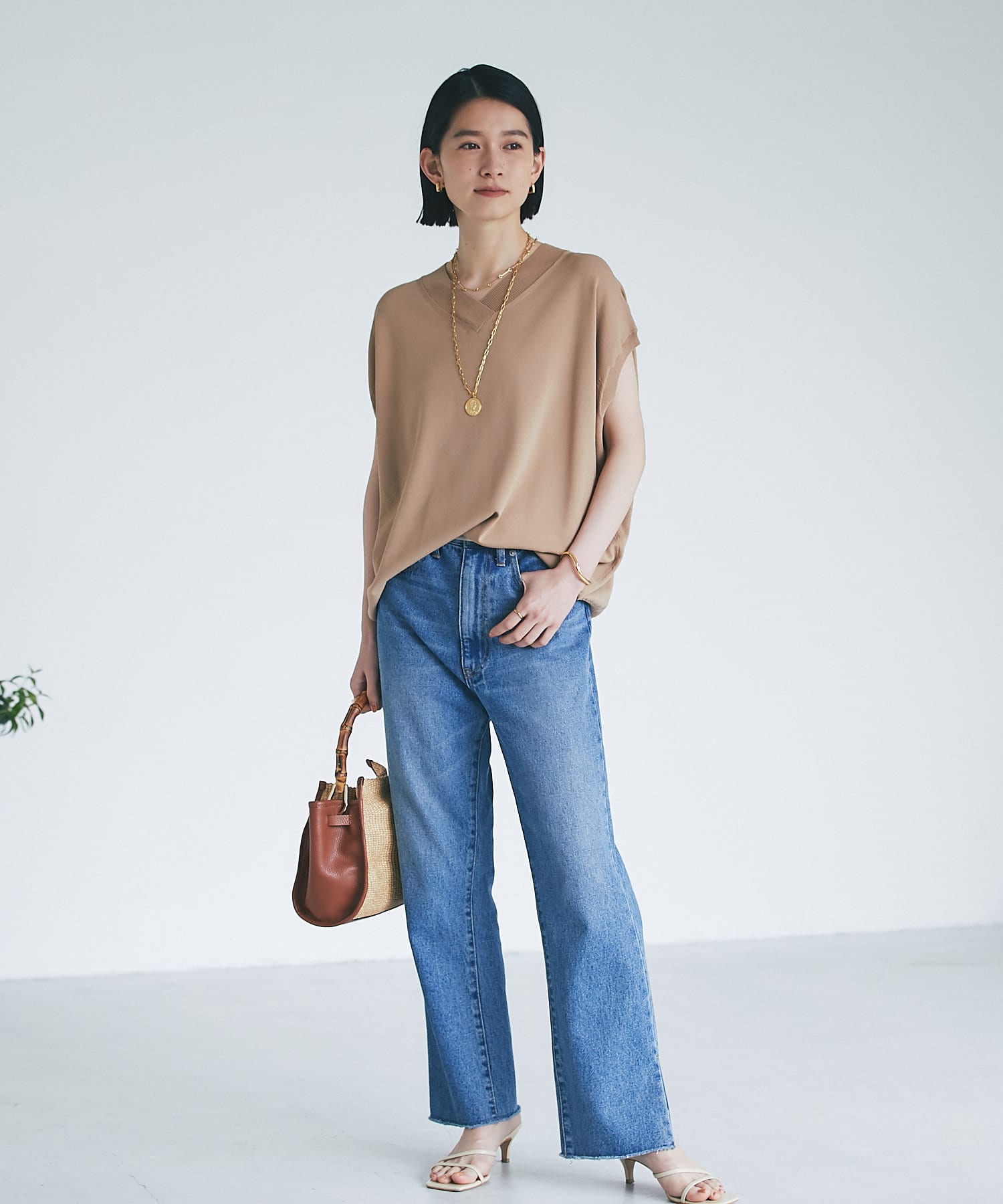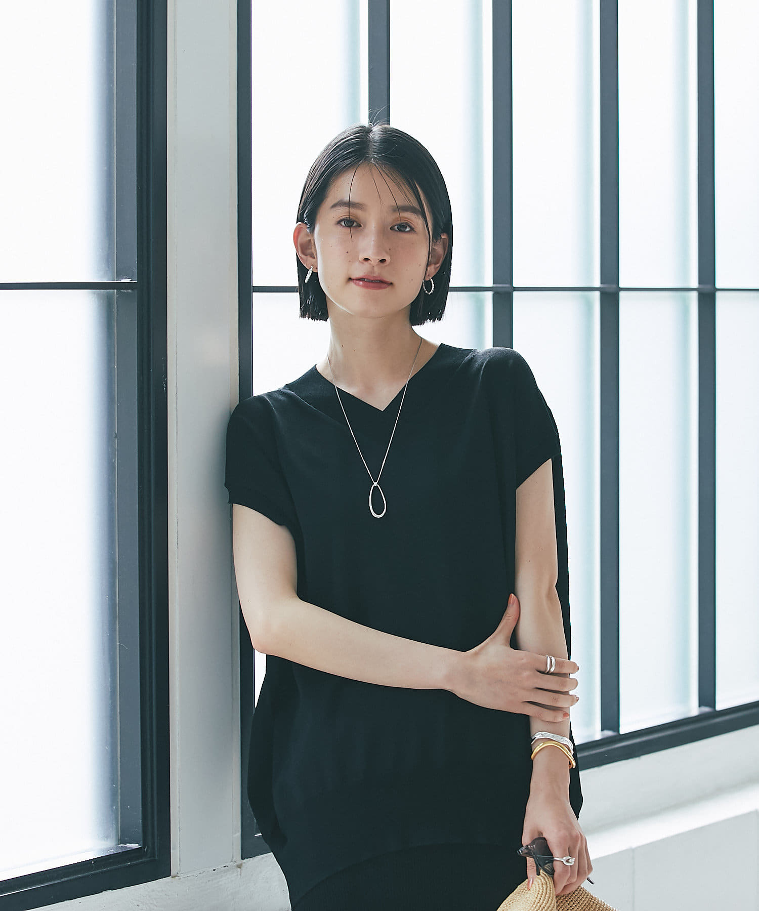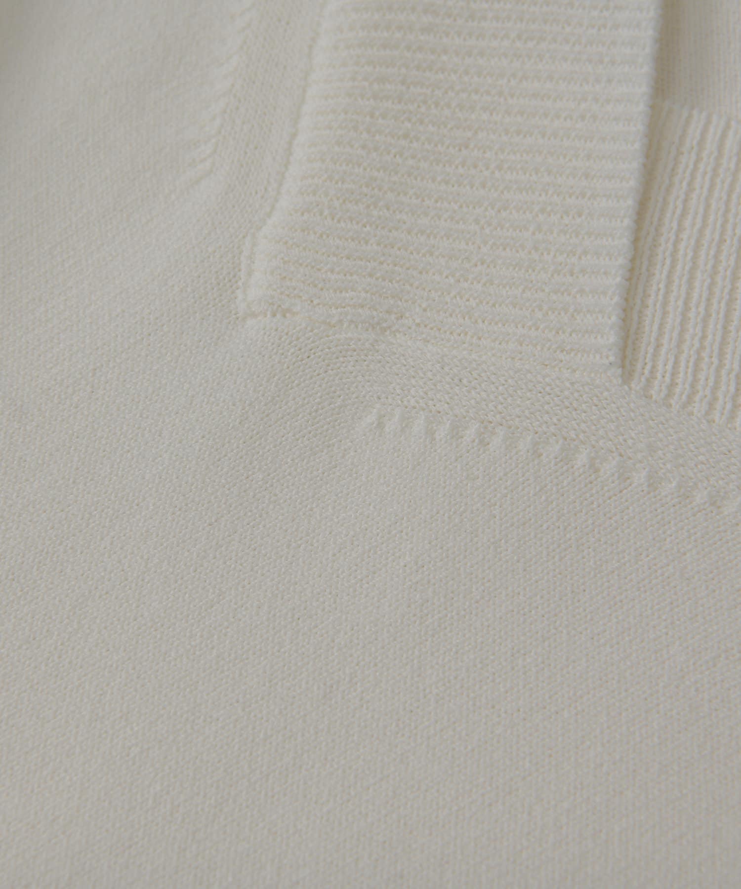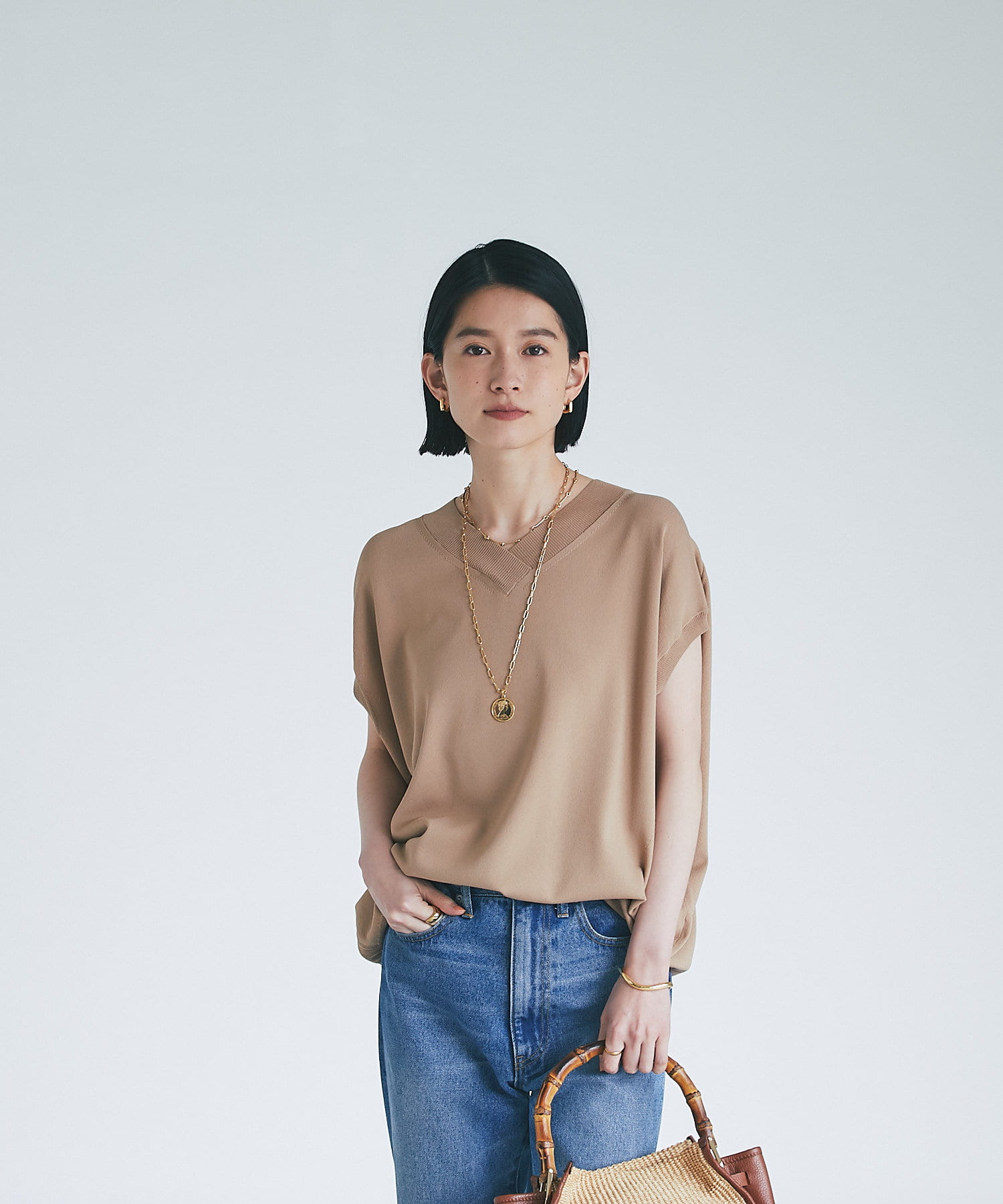 • 詰まり気味のVネックはカジュアルスタイルにもベストマッチ。