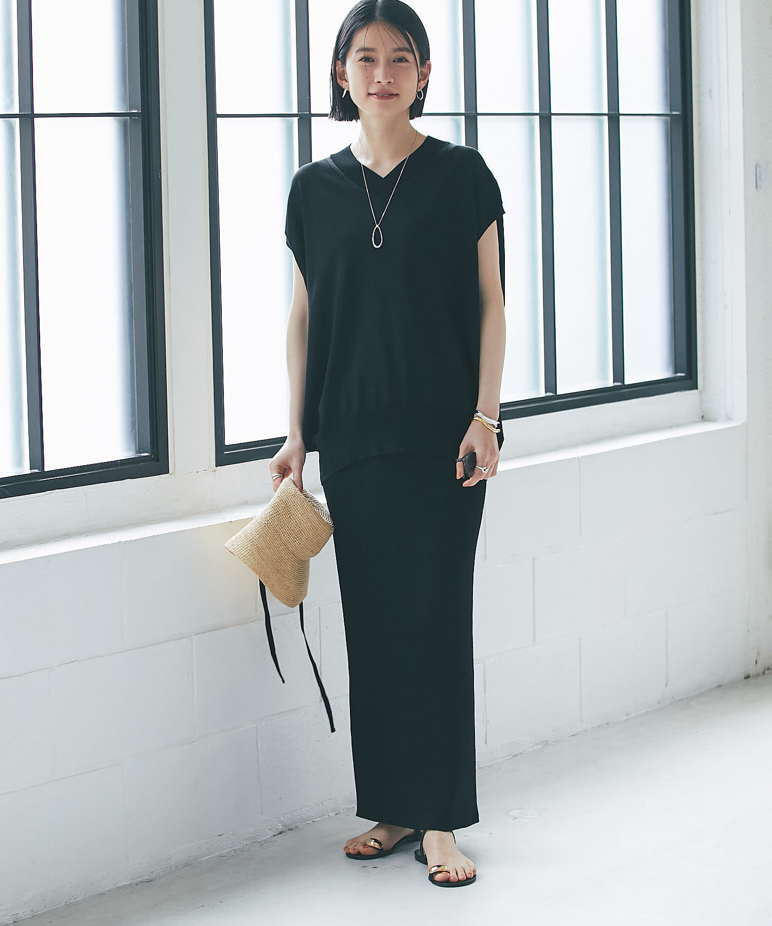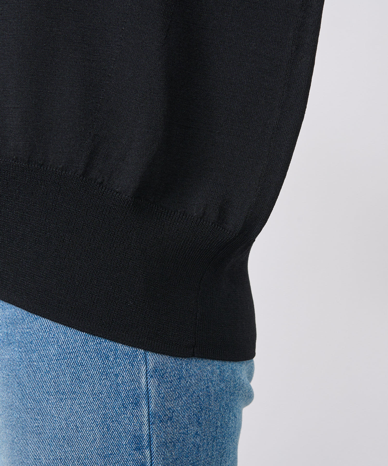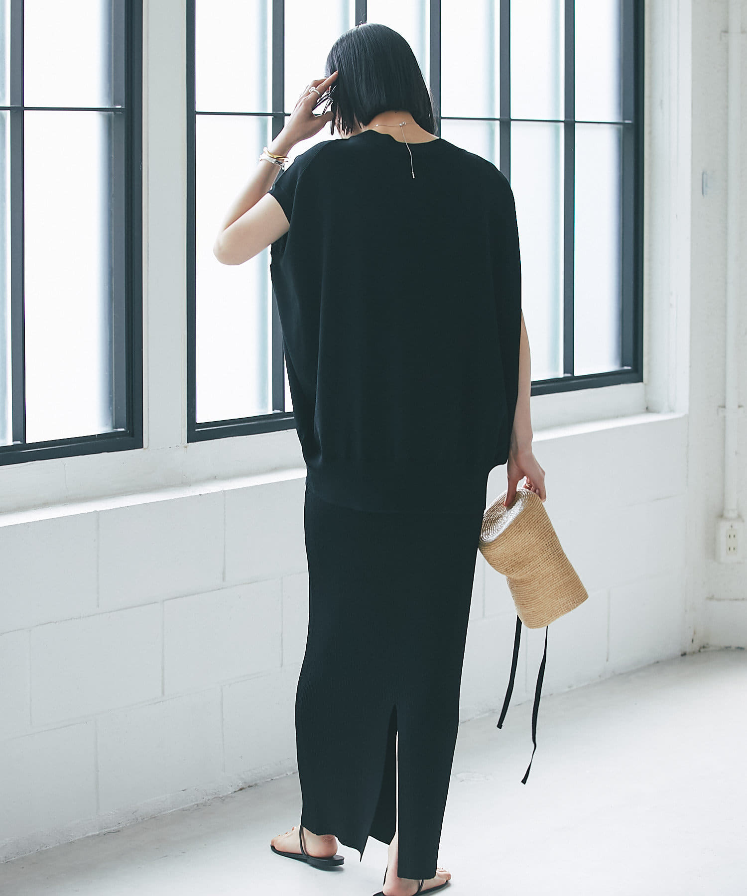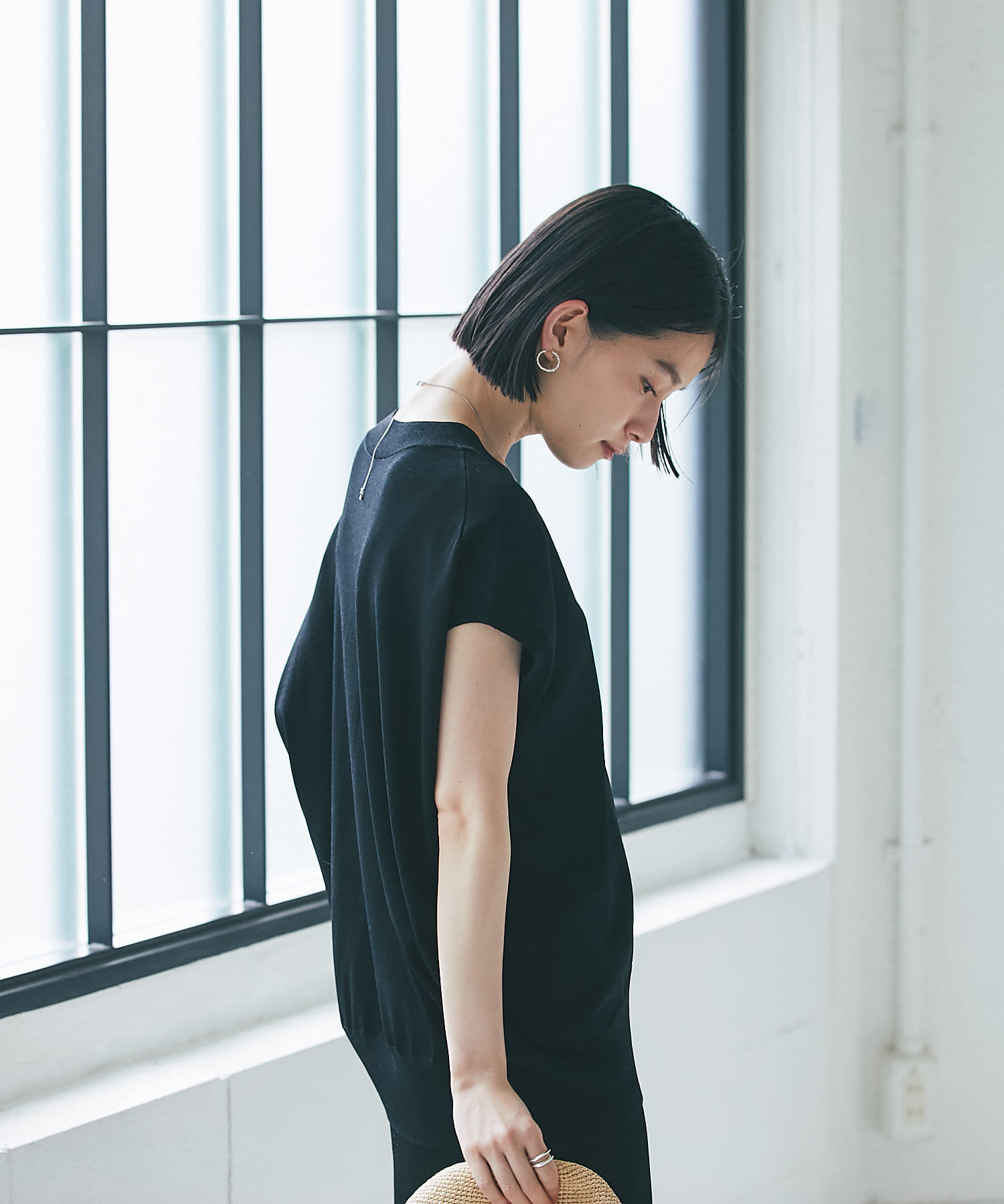長すぎず短すぎない着丈で、ウエストイン・アウト問わずボトムとのバランスが取りやすいニットです。