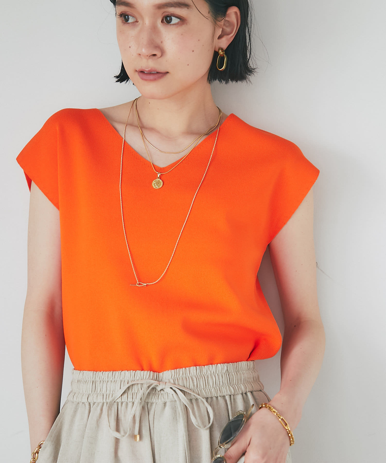 首元でVのシルエットを作り出すロングネックレスは、首回りをすっきり&長く見せてくれます。