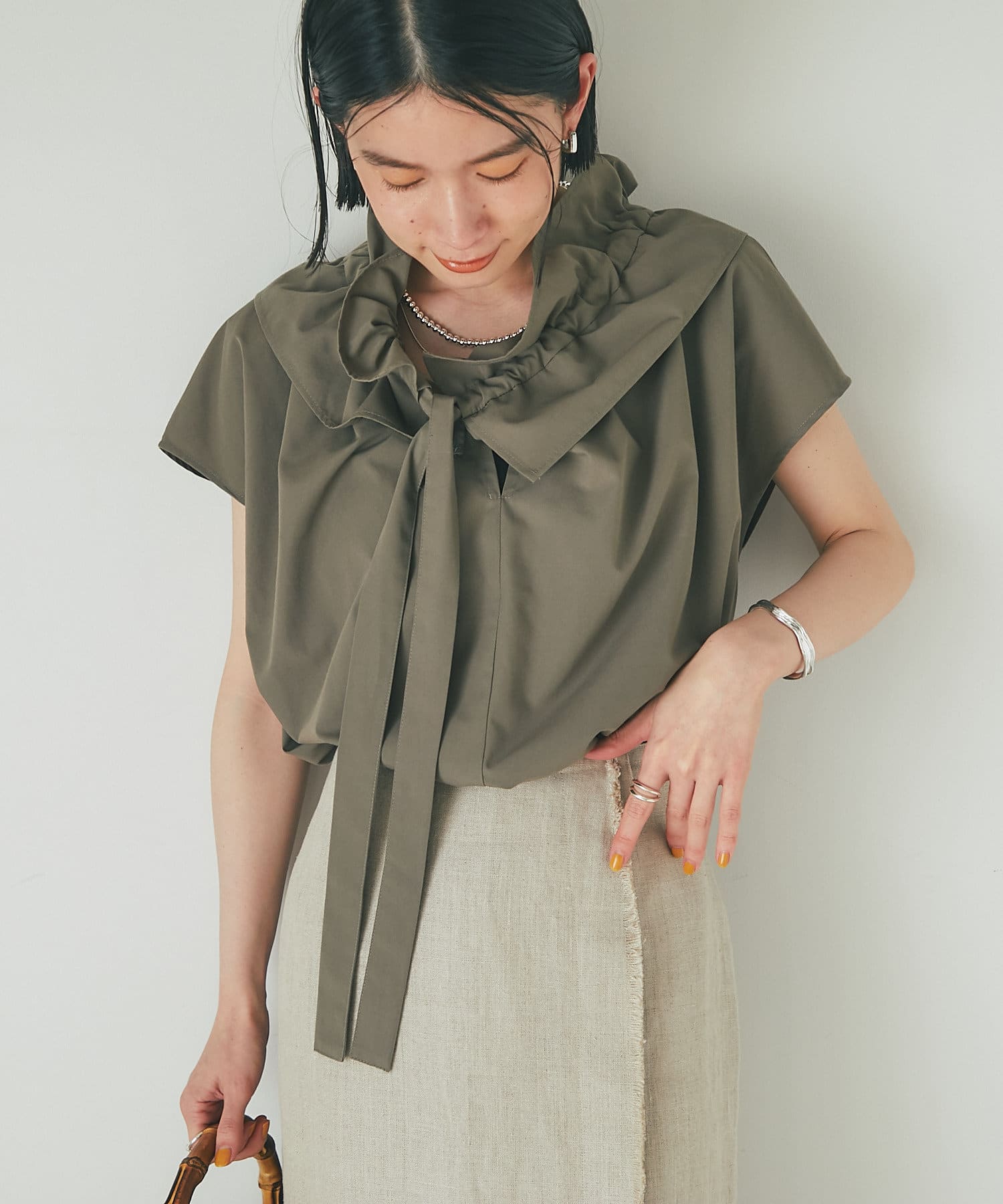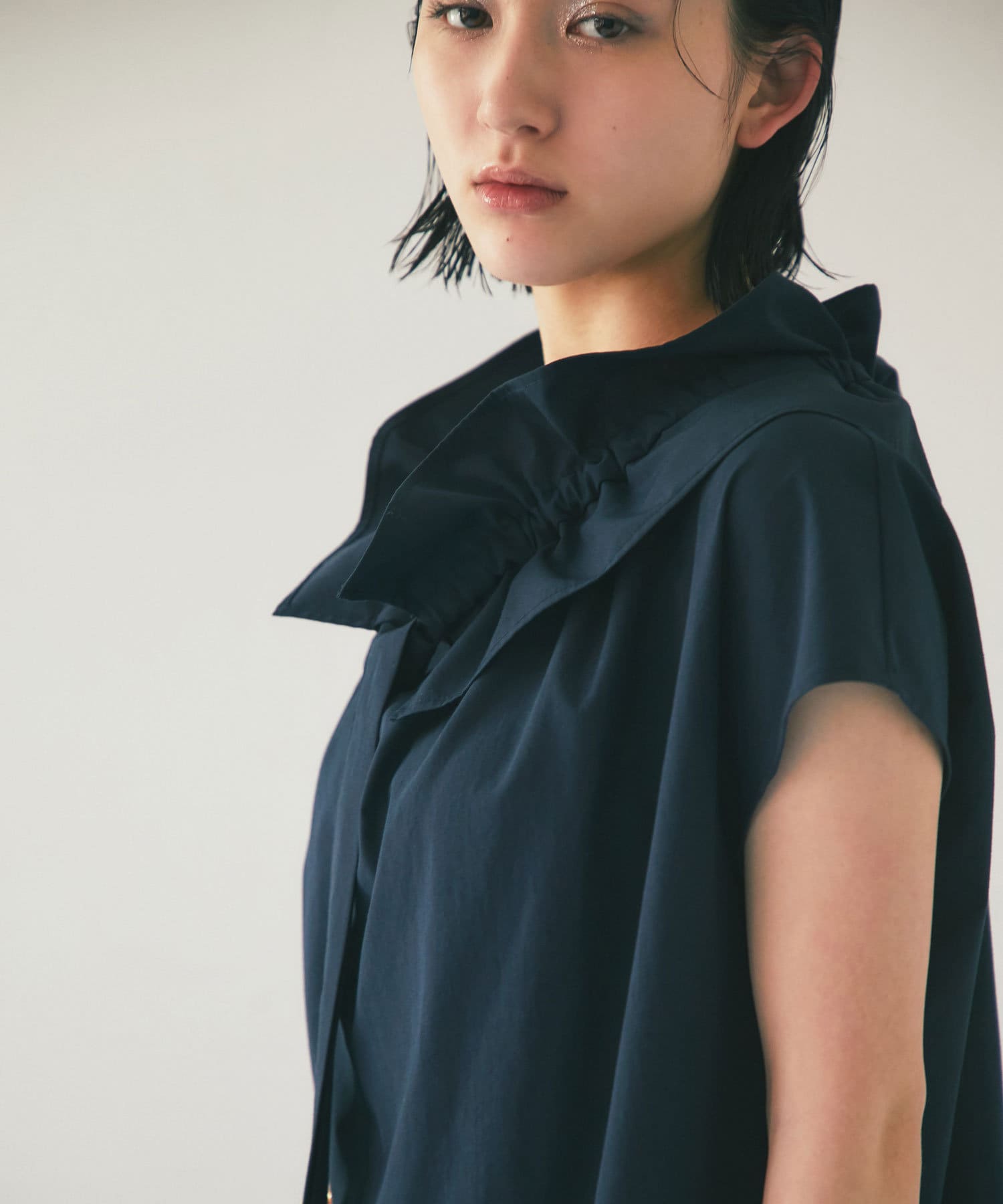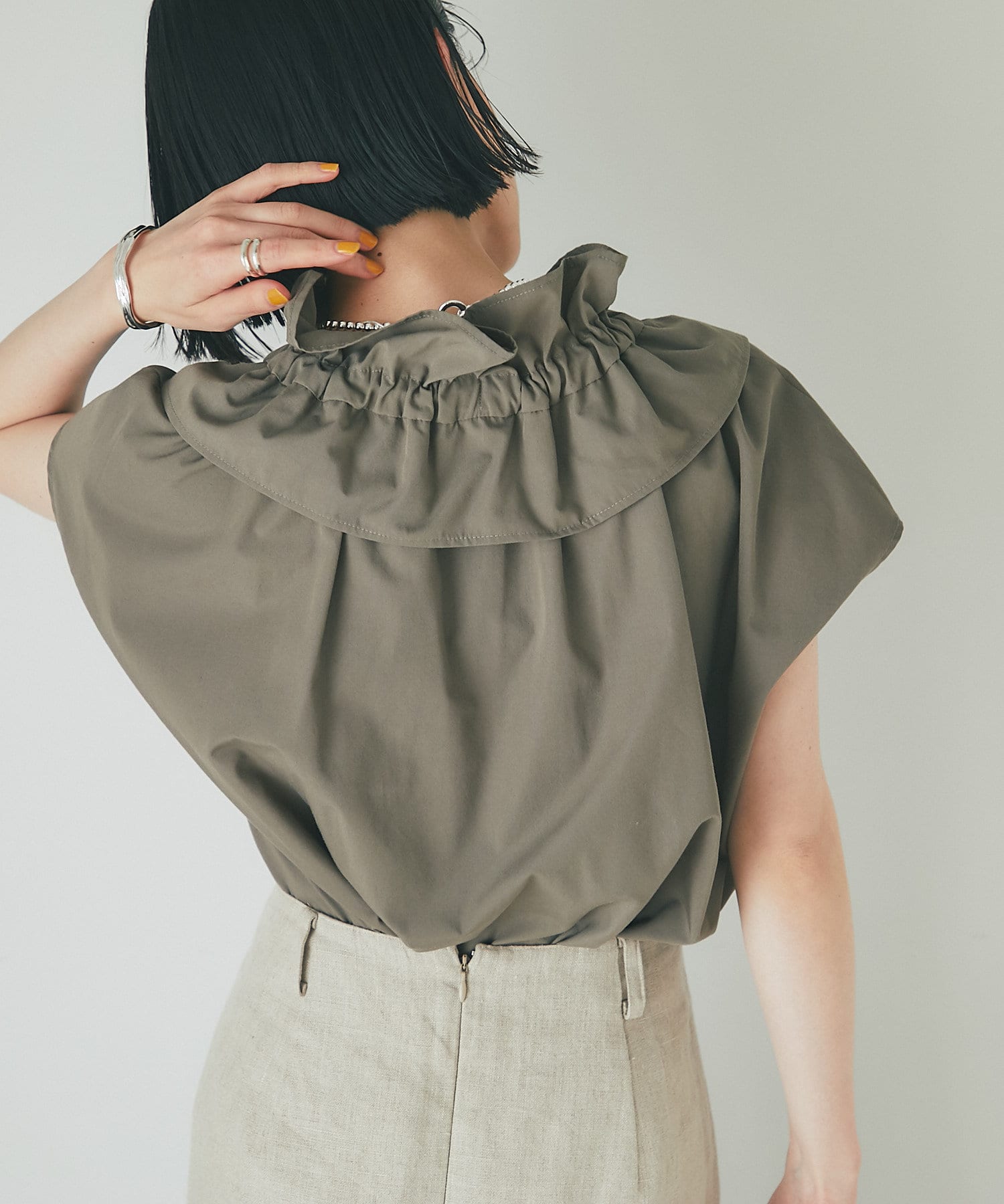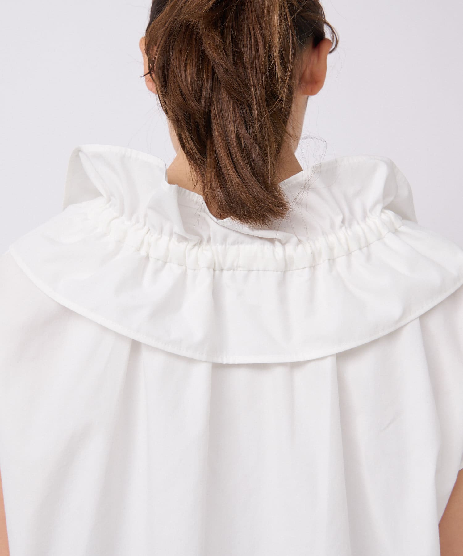 くしゅくしゅっとギャザーを寄せてフェミニンに仕上げたり、ギャザーを寄せずにフラットな衿にしてみたりと自由自在です。
