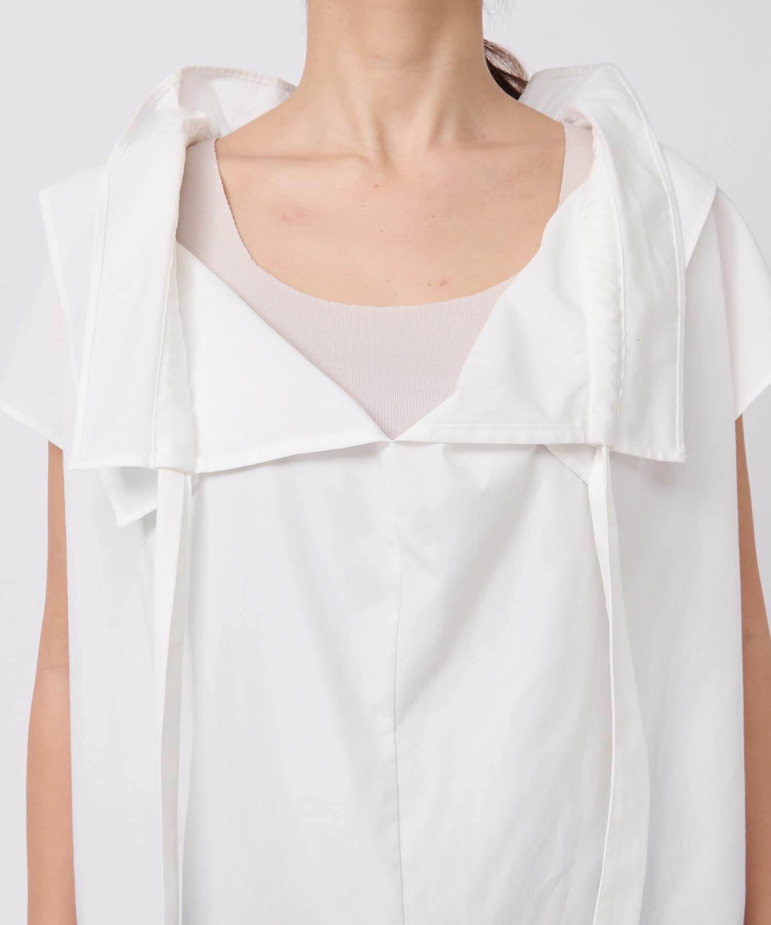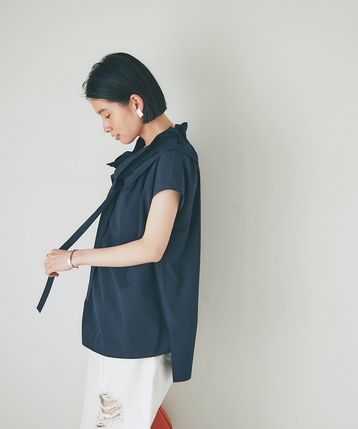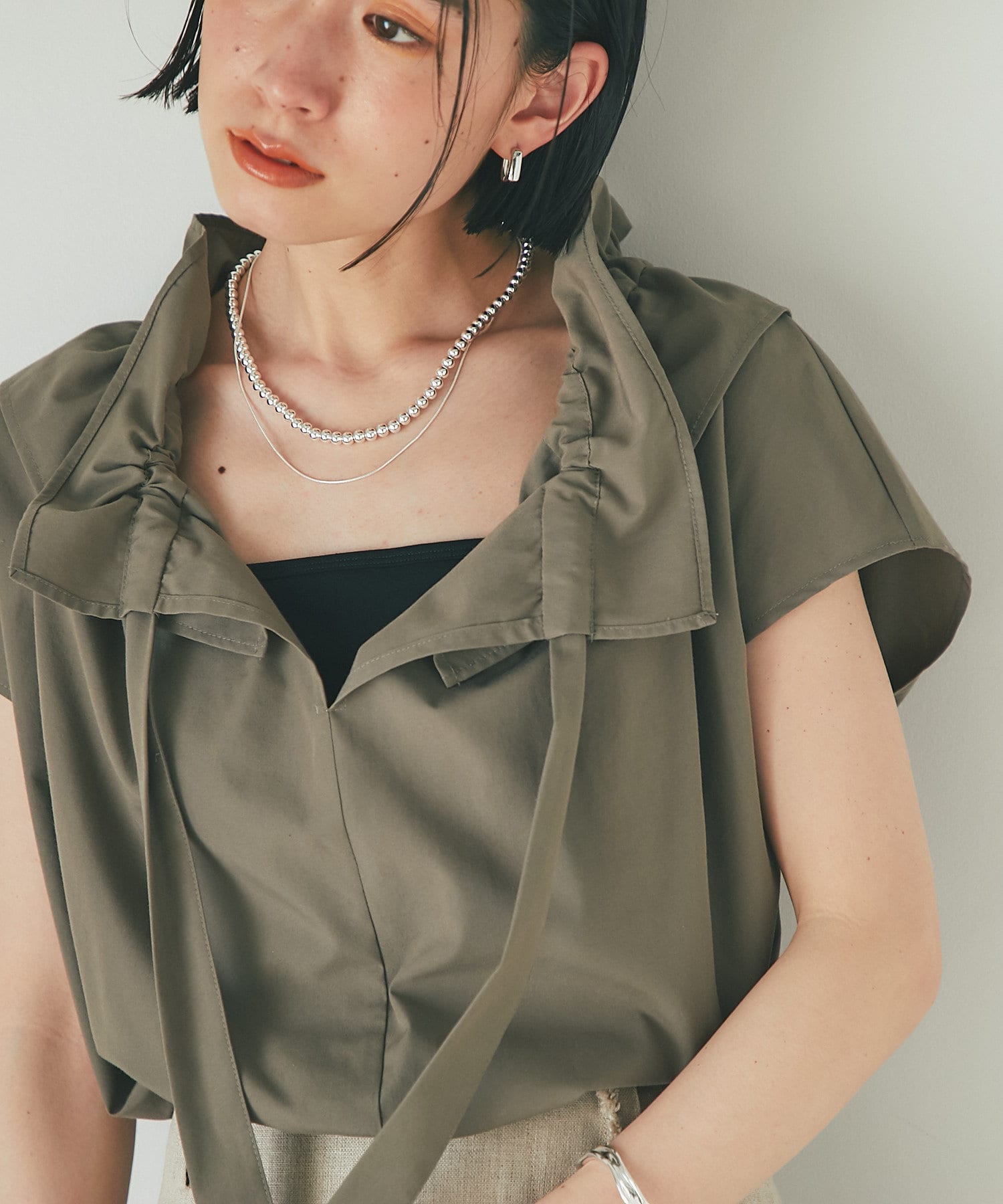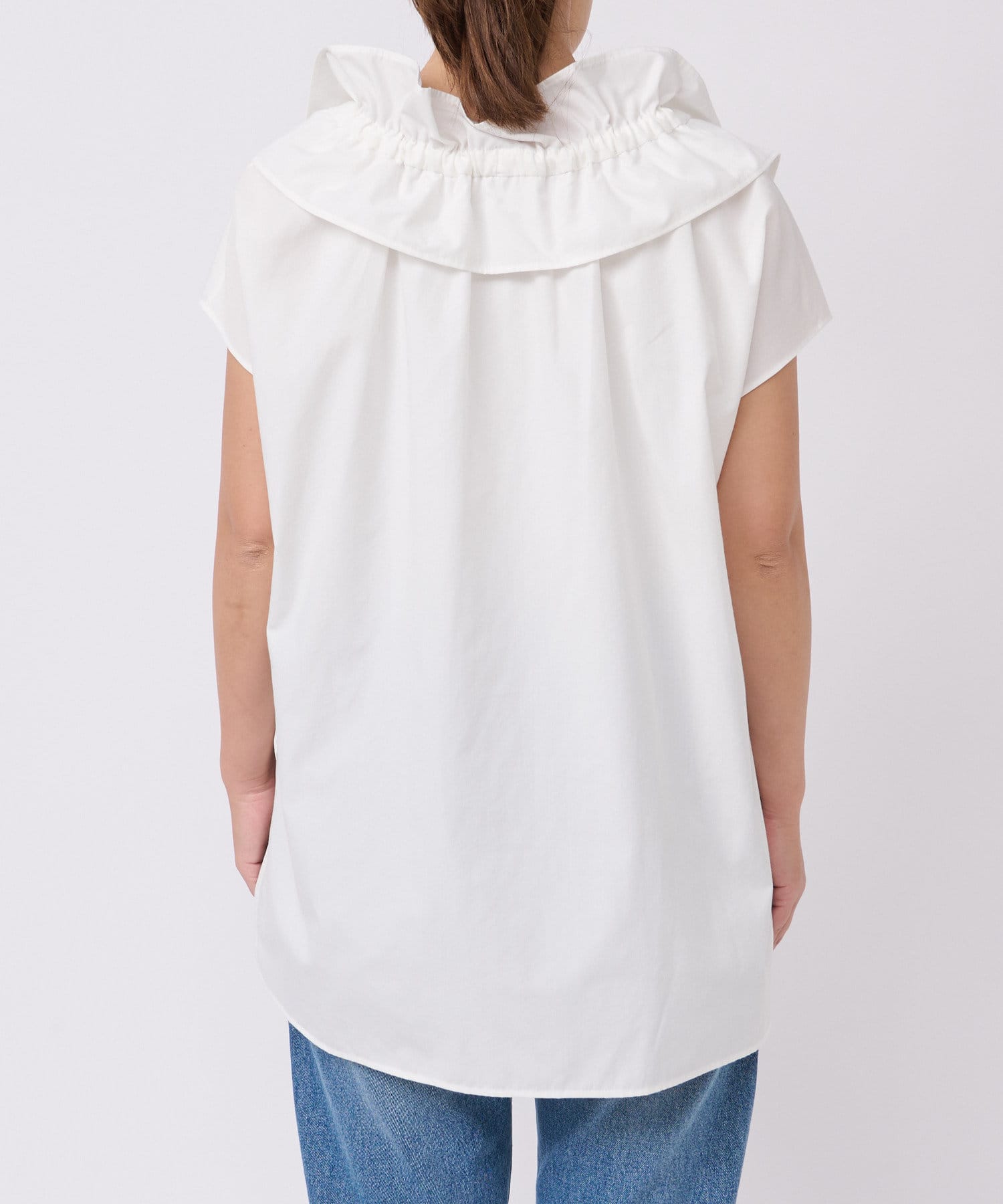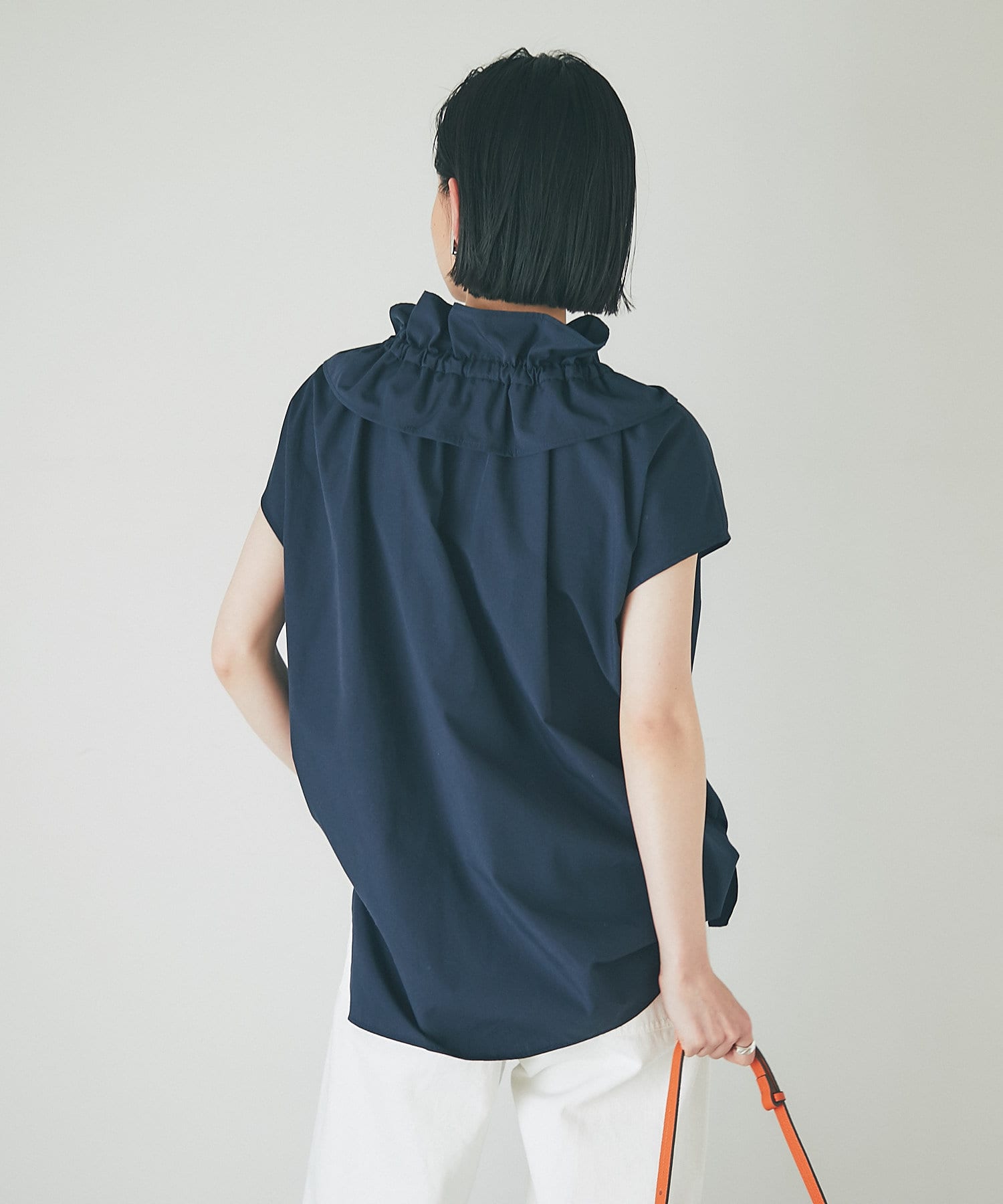 くしゅくしゅっとギャザーを寄せてフェミニンに仕上げたり、ギャザーを寄せずにフラットな衿にしてみたりと自由自在です。