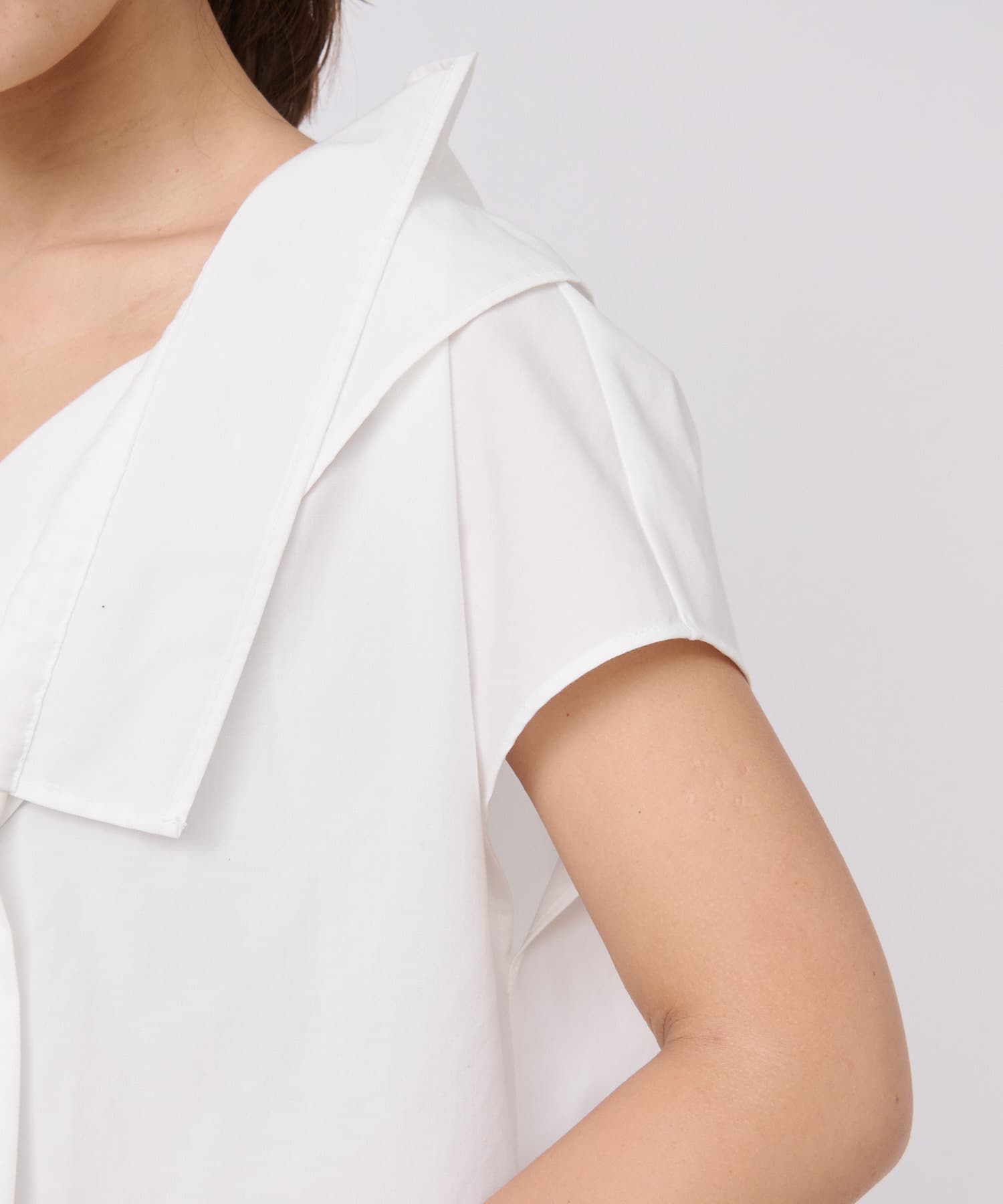 半袖と比較すると腕の露出は若干増えますが、二の腕回りにフィットしすぎない立体的な袖の形が綺麗な商品ですので、大人の方にもぜひ着ていただきたいブラウスです。