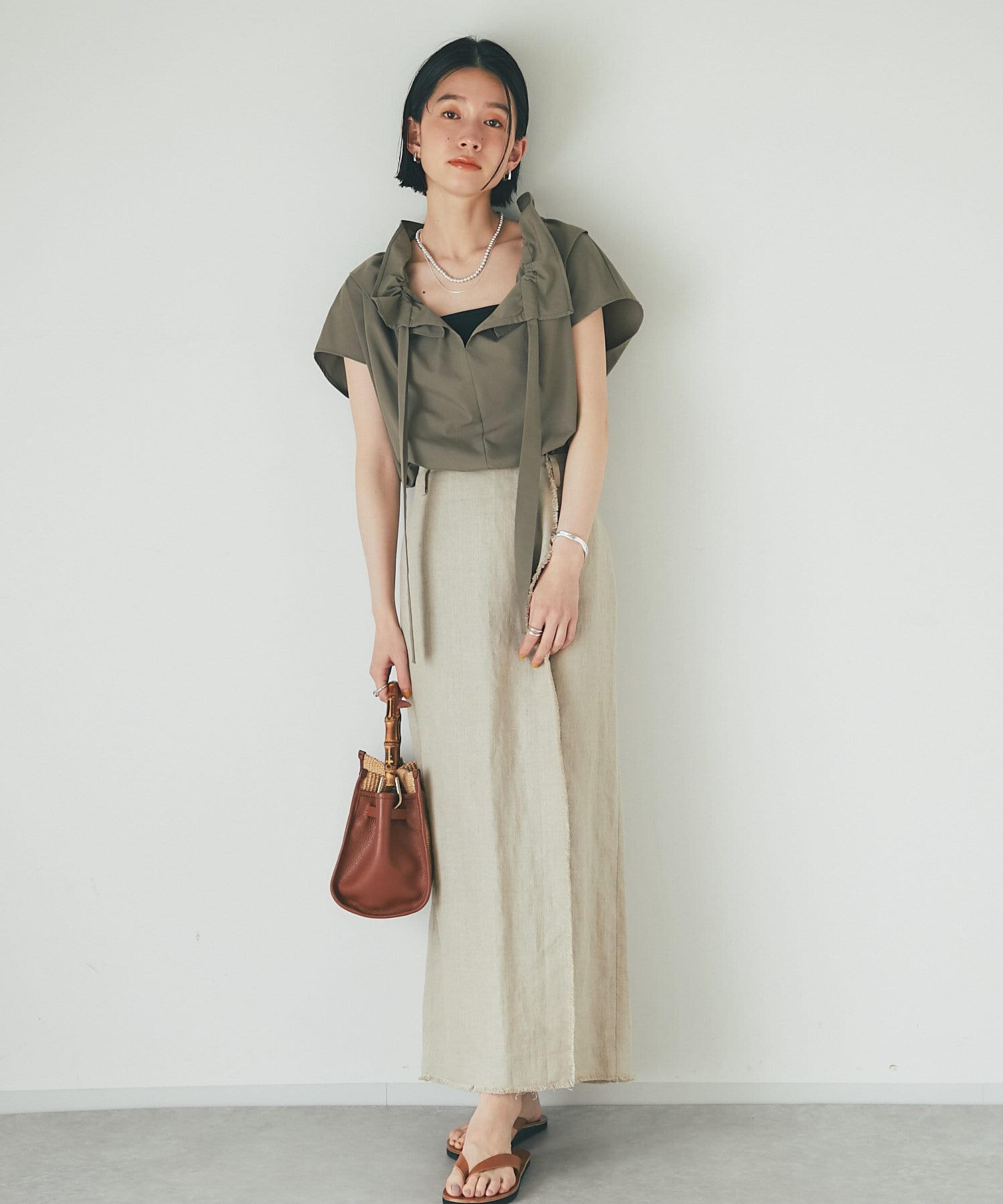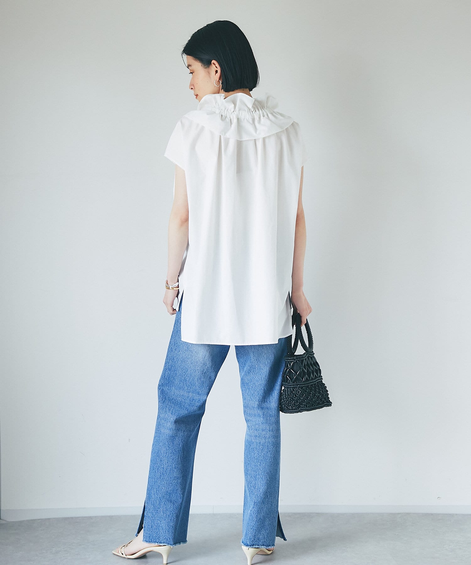 カジュアルな日にはデニム&サンダルでヘルシーに、オフィスやキレイめの日にはスラックスやタイトスカートと合わせていただくのがおすすめです。