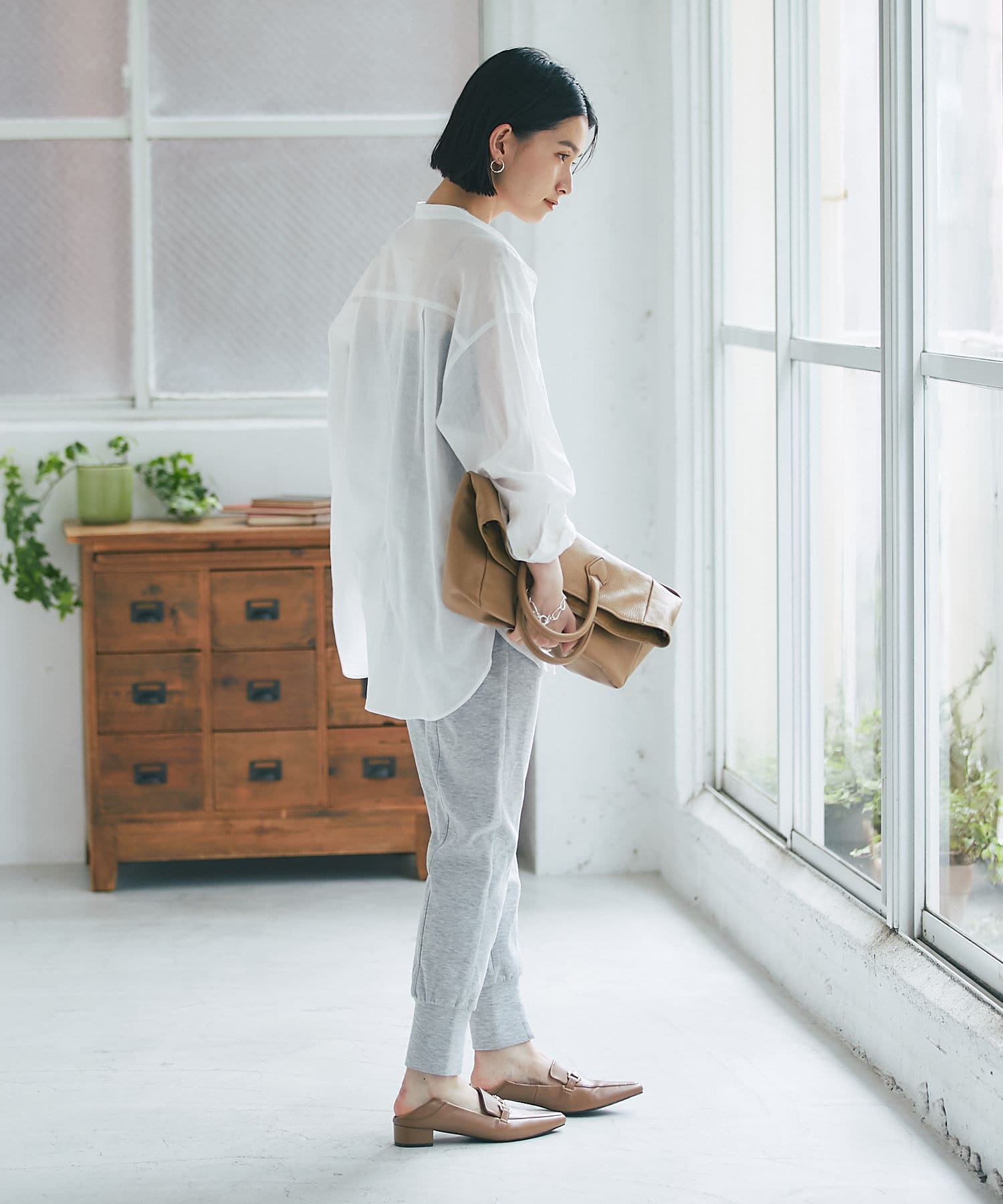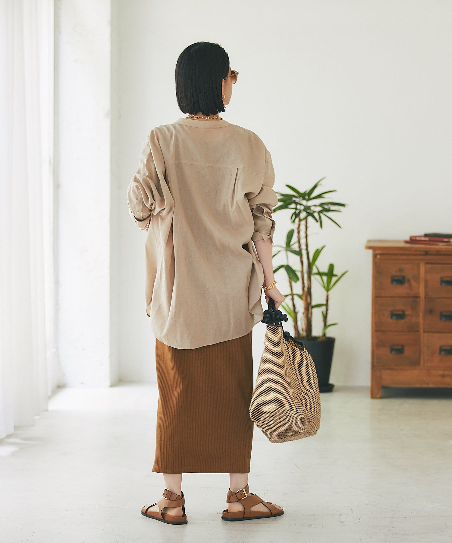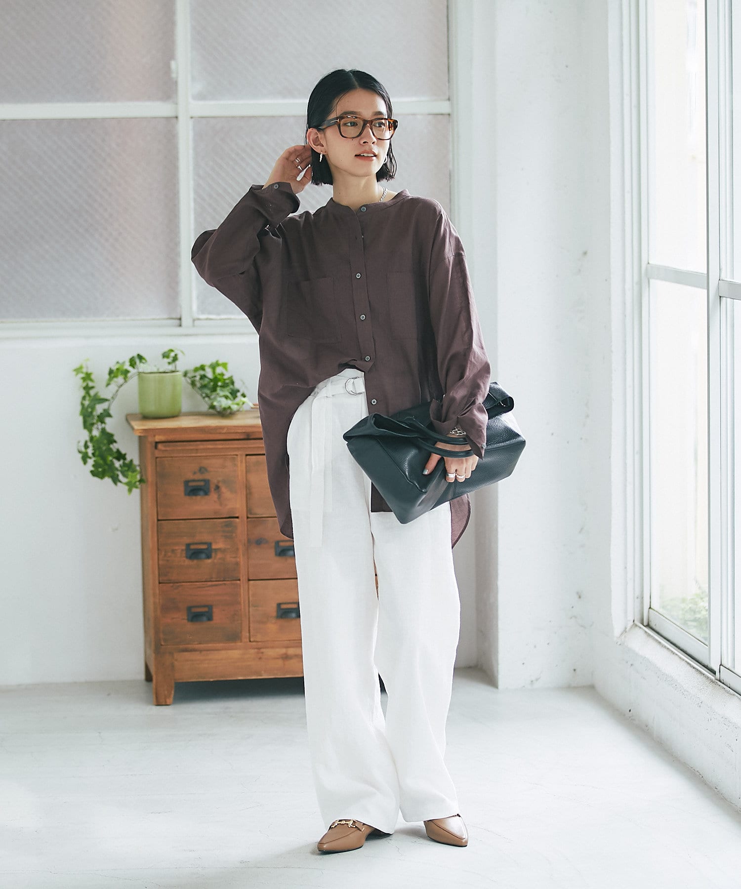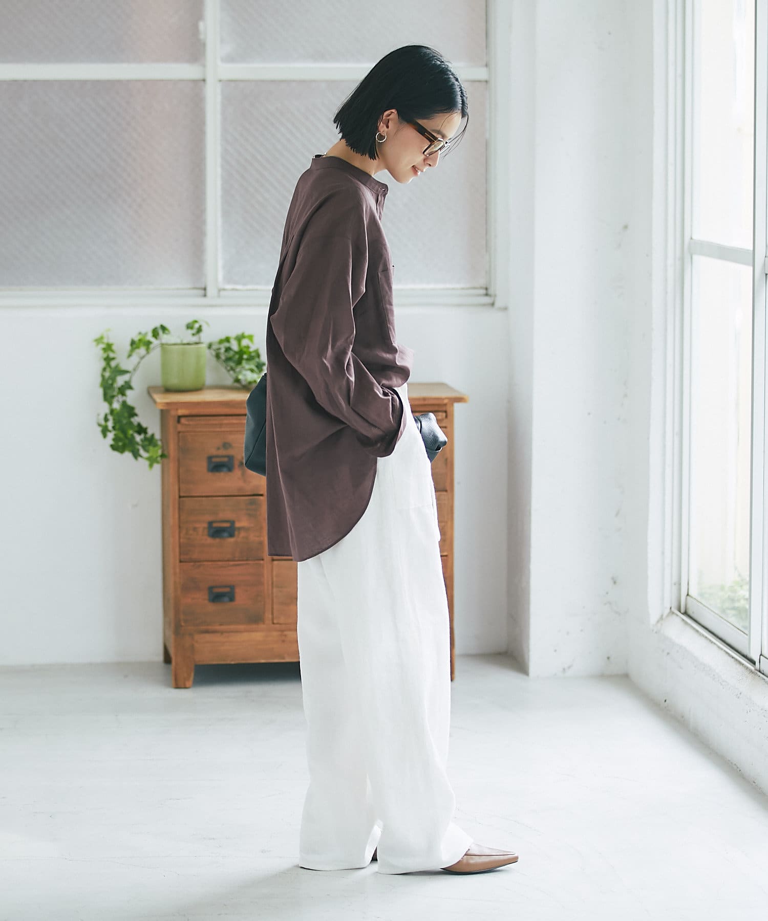 サラッとした素材とすっきりとしたバンドカラーがナチュラルすぎない印象で様々な場面でお使いいただけるアイテムです。