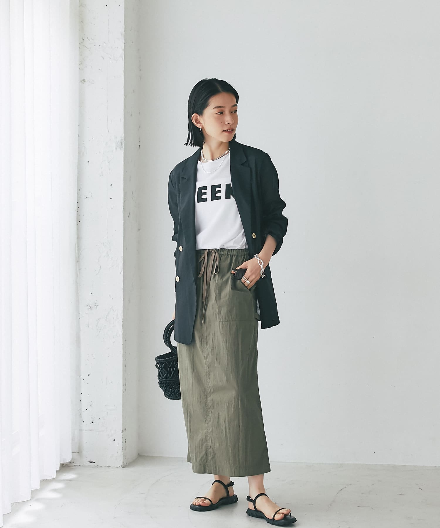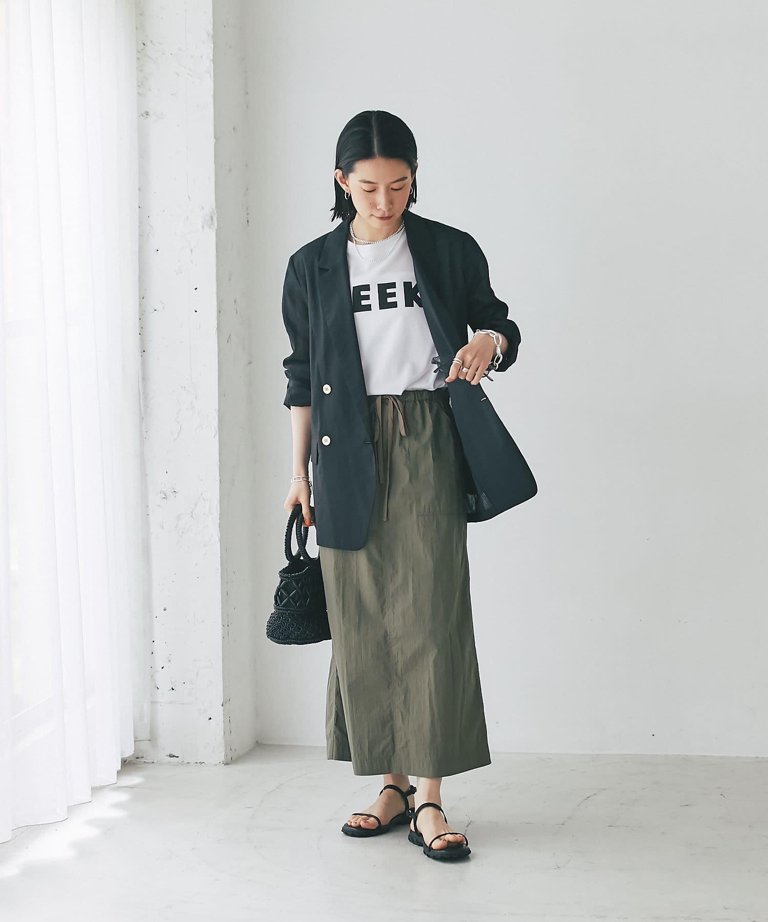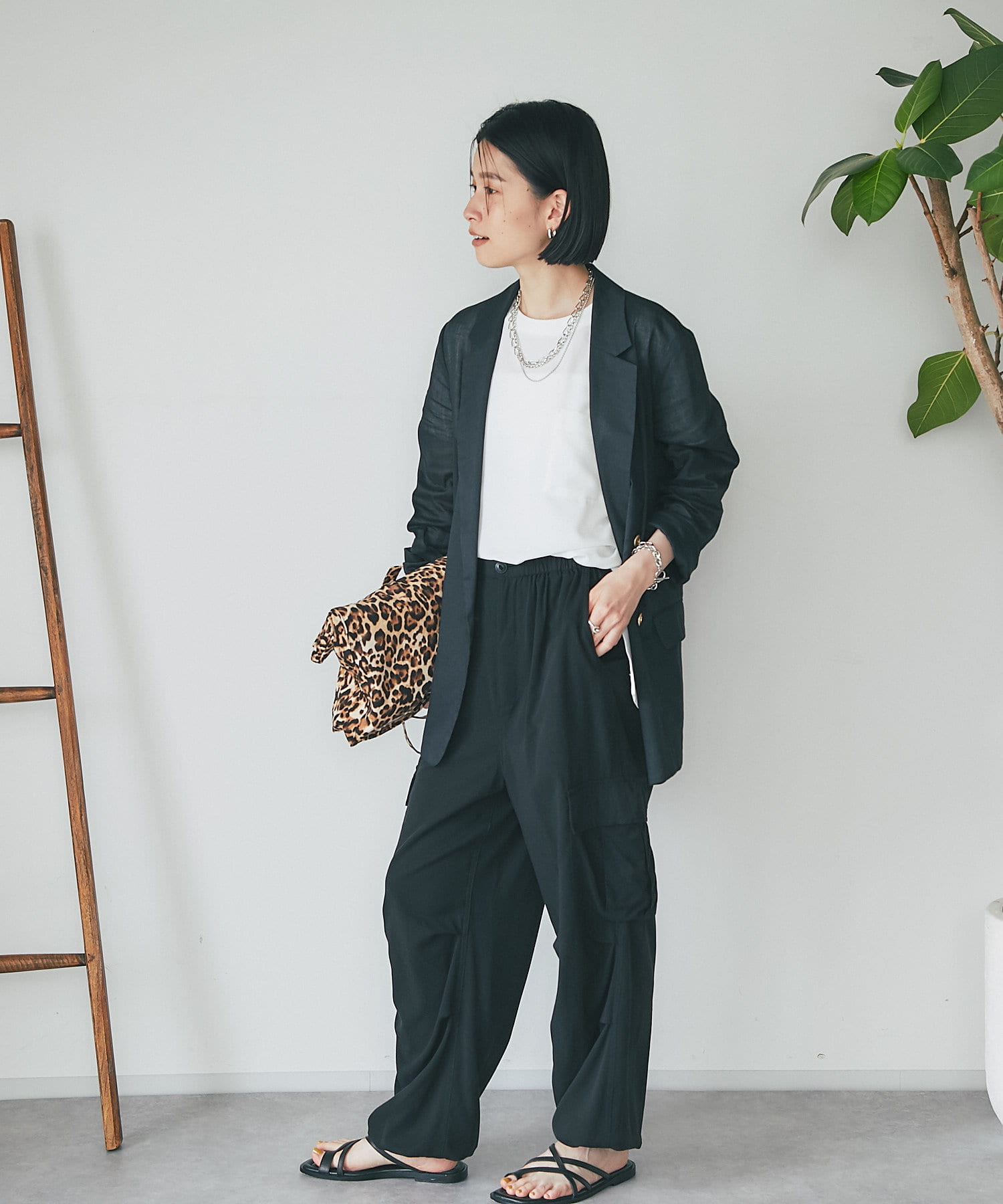 シンプルなデザインでどんなアイテムとも合わせやすく、ボトムのシルエットも問いません。