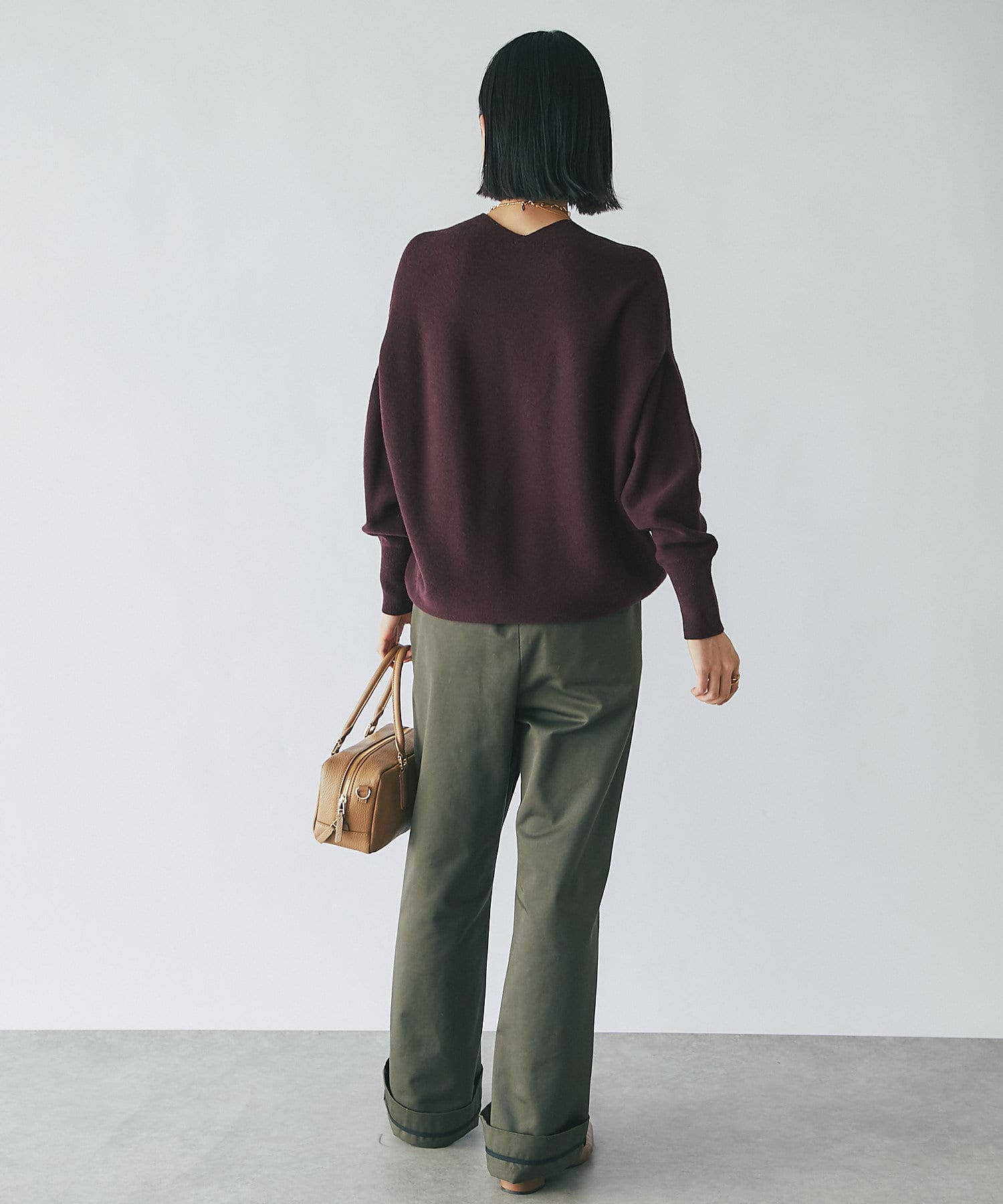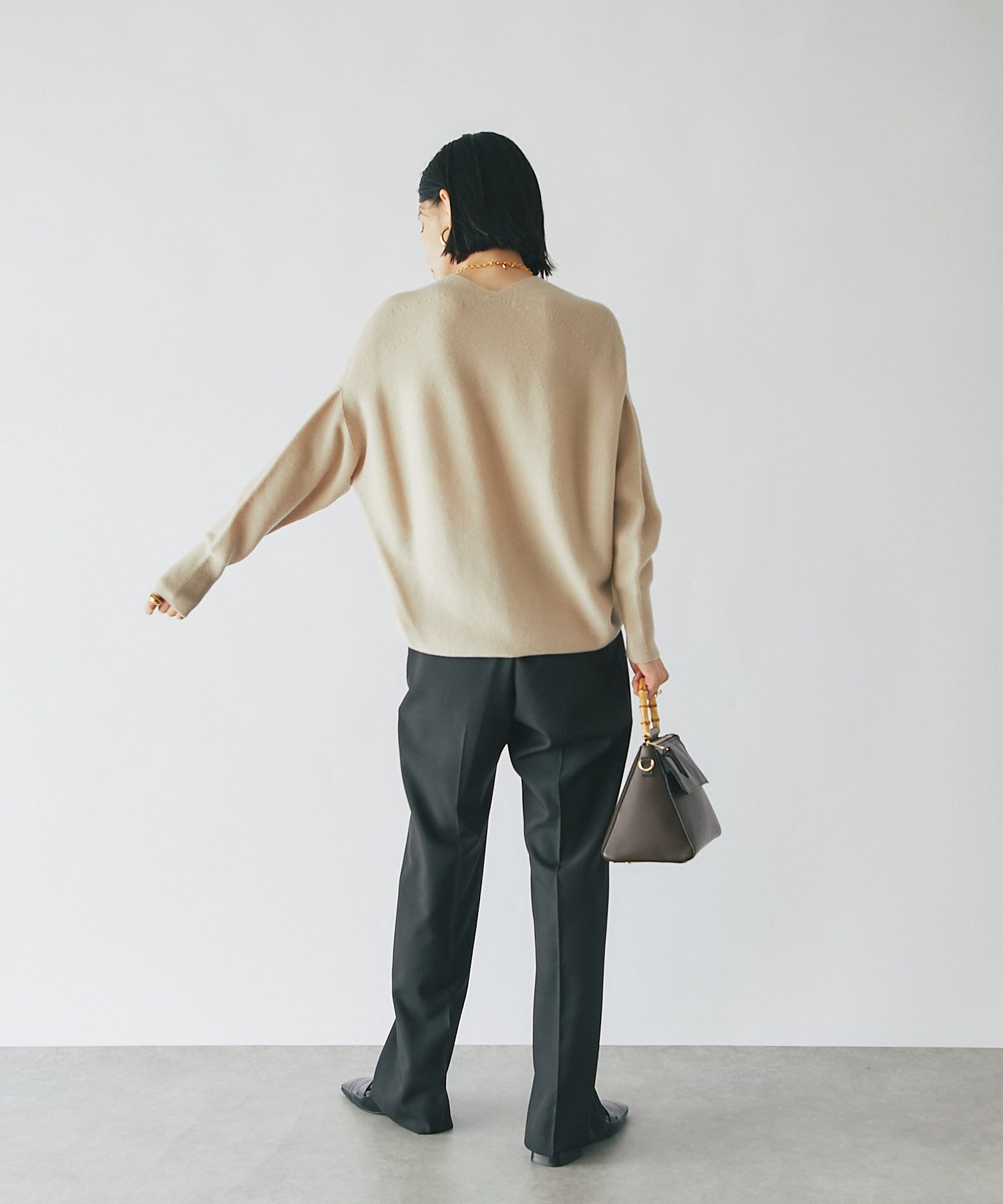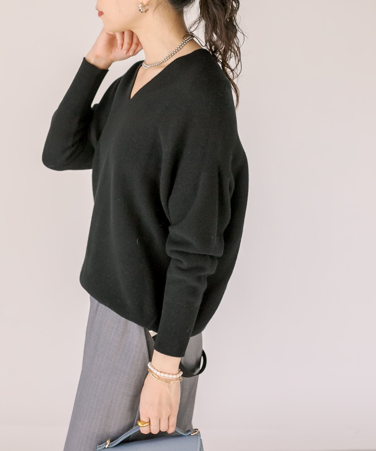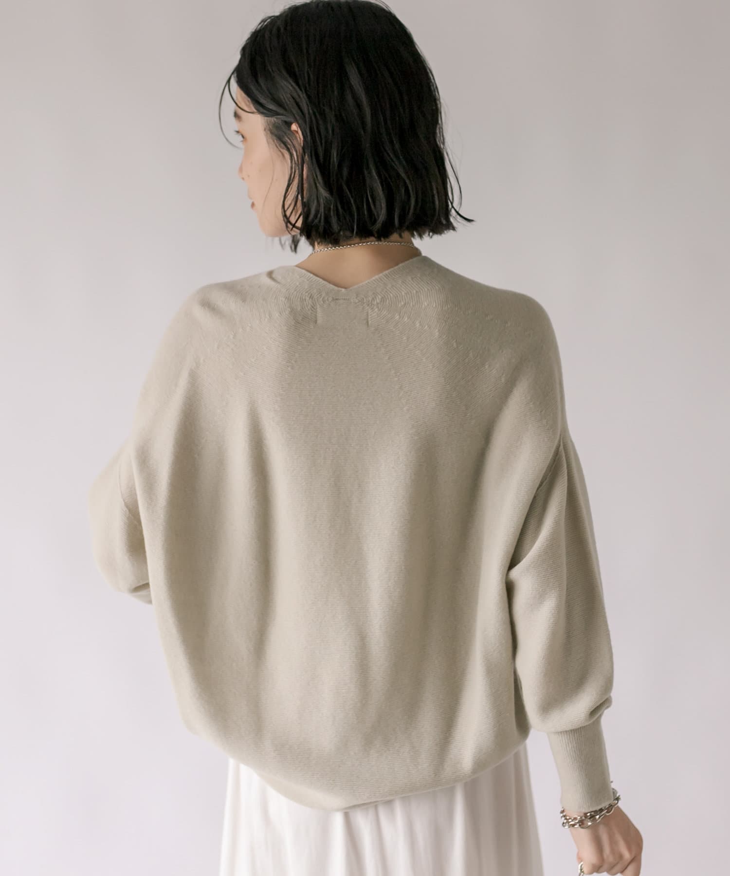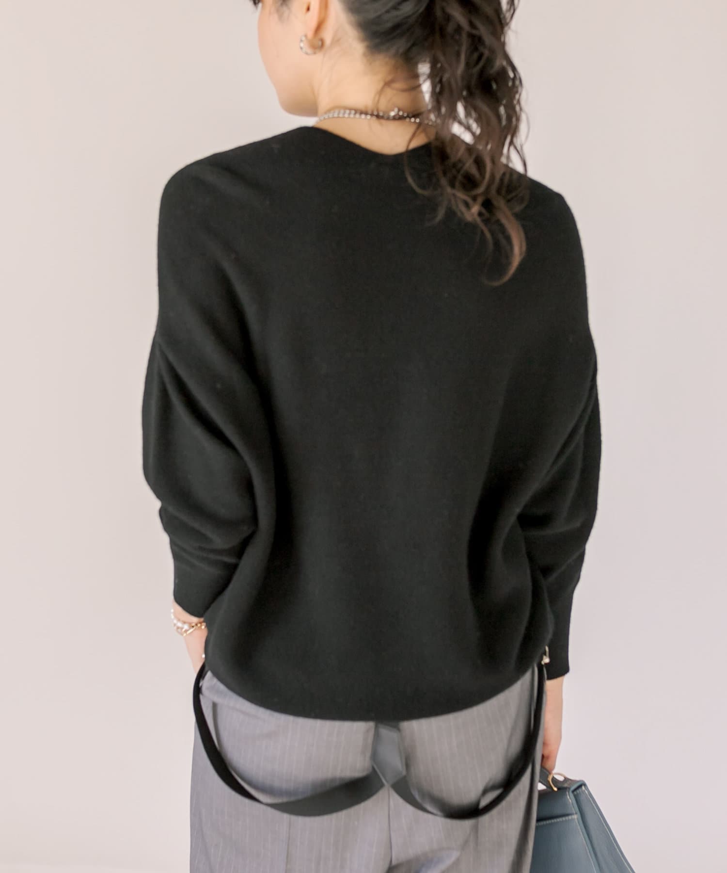 首元はVネックで顔回りをすっきりと見せつつ、バックスタイルは程よいボリューム感のあるシルエットで体のラインを拾わない嬉しいポイントも。