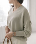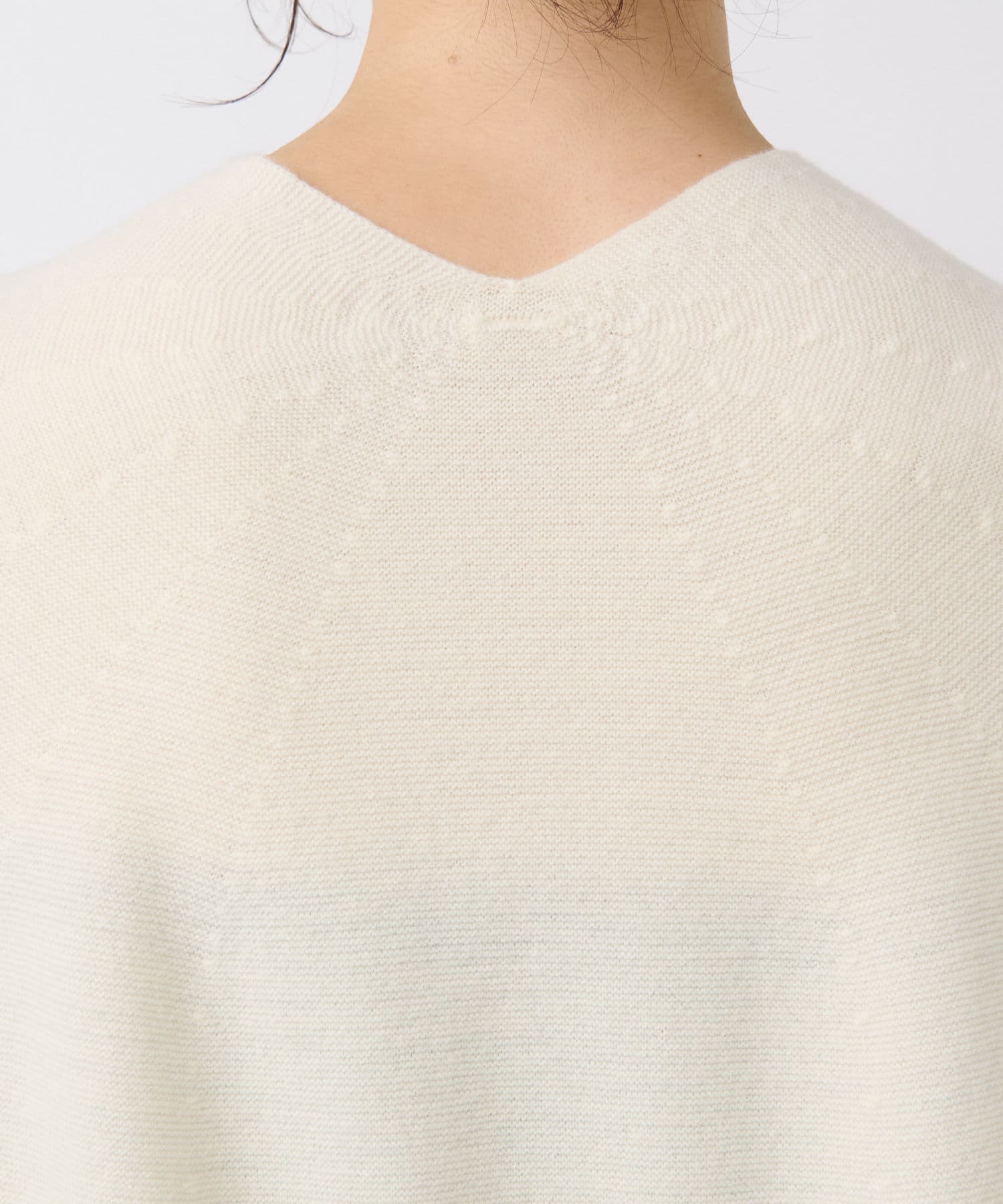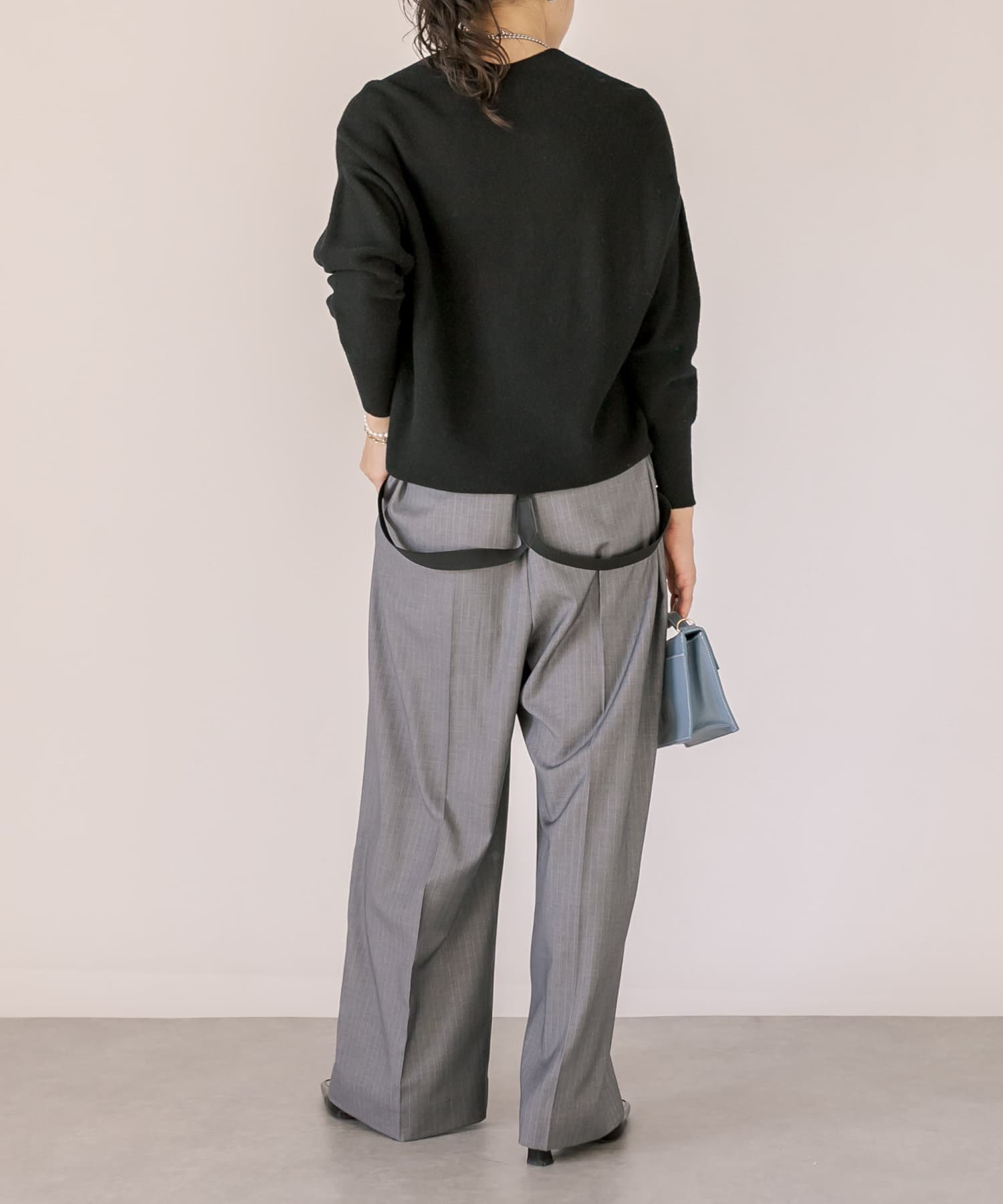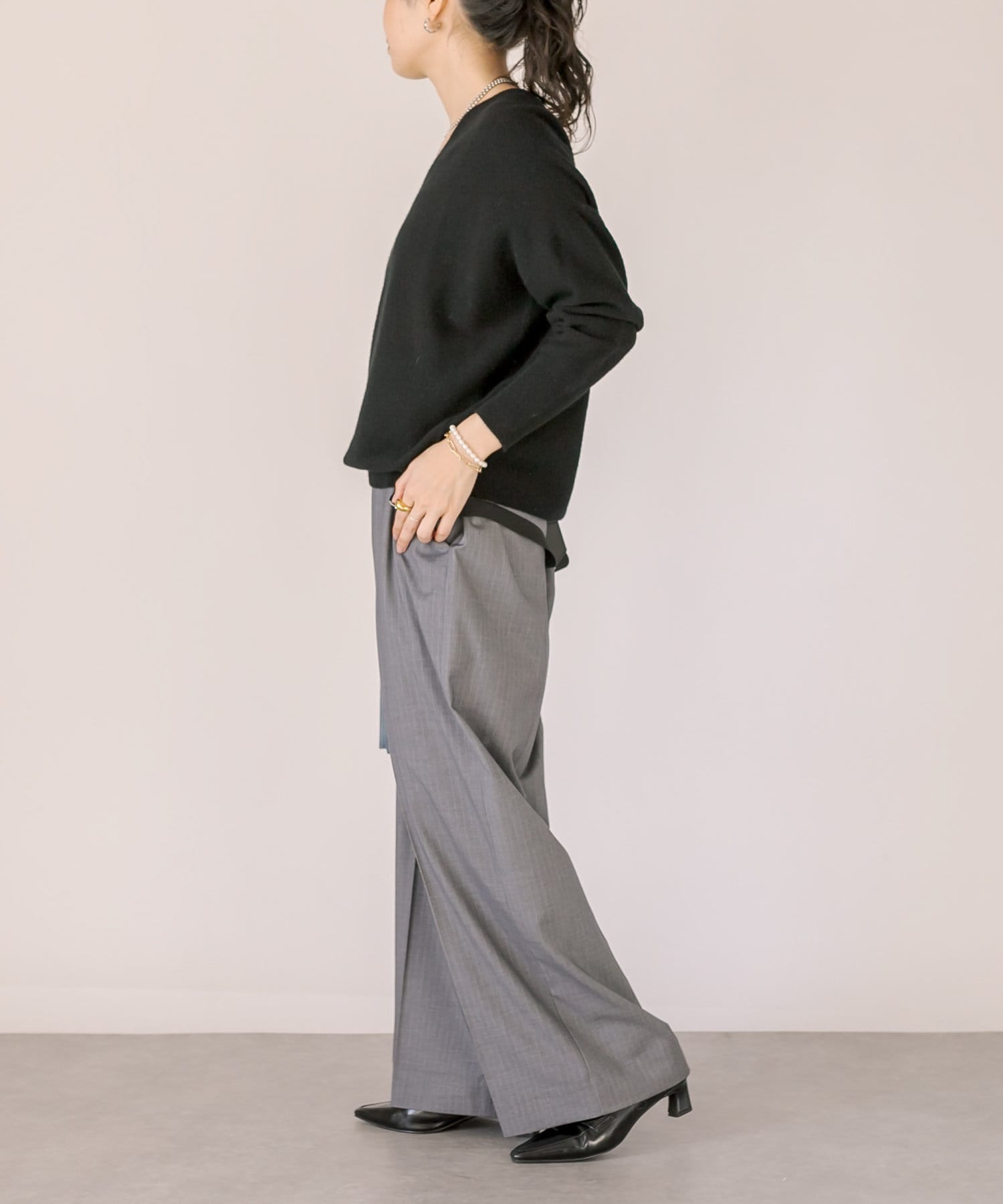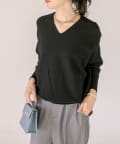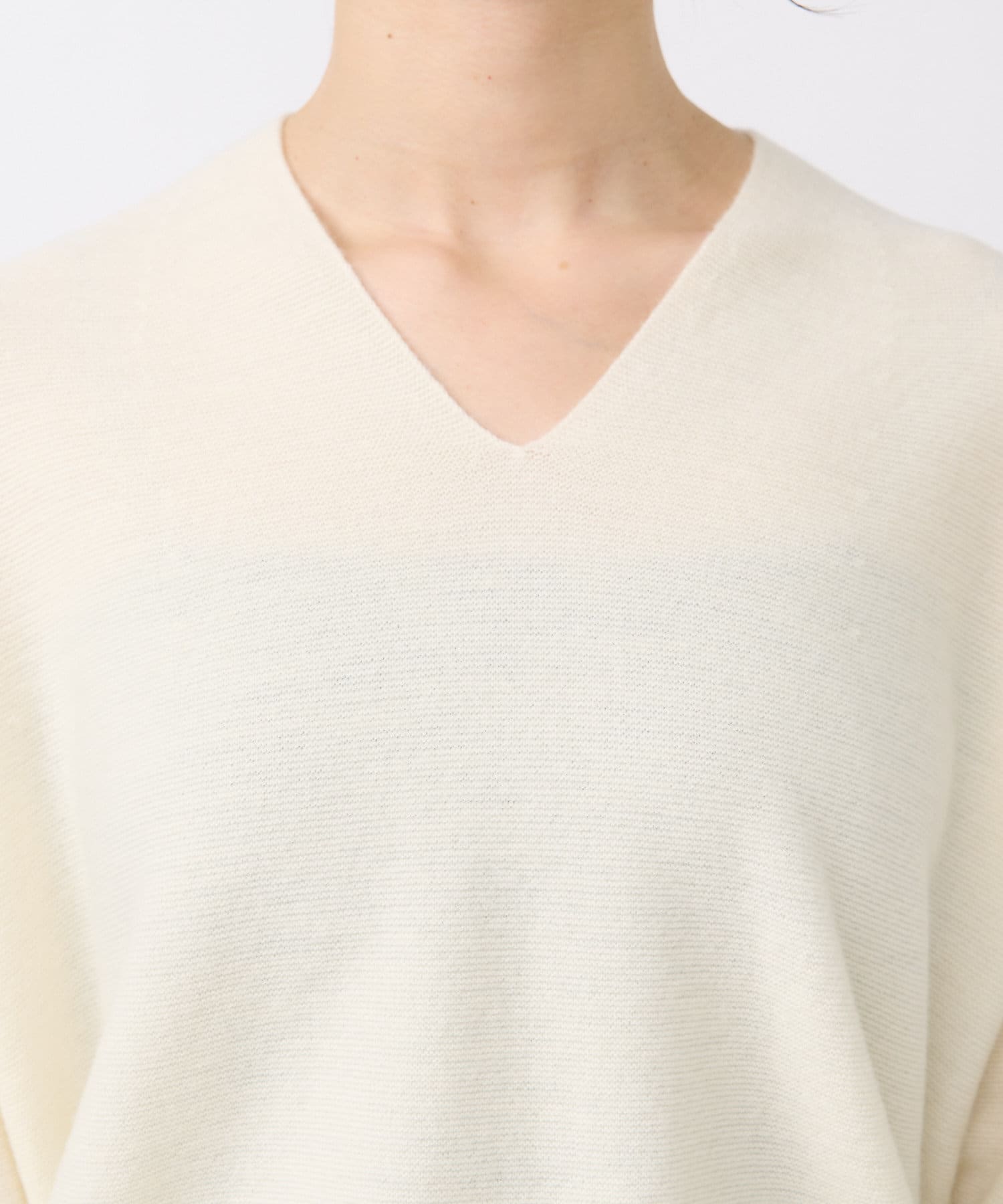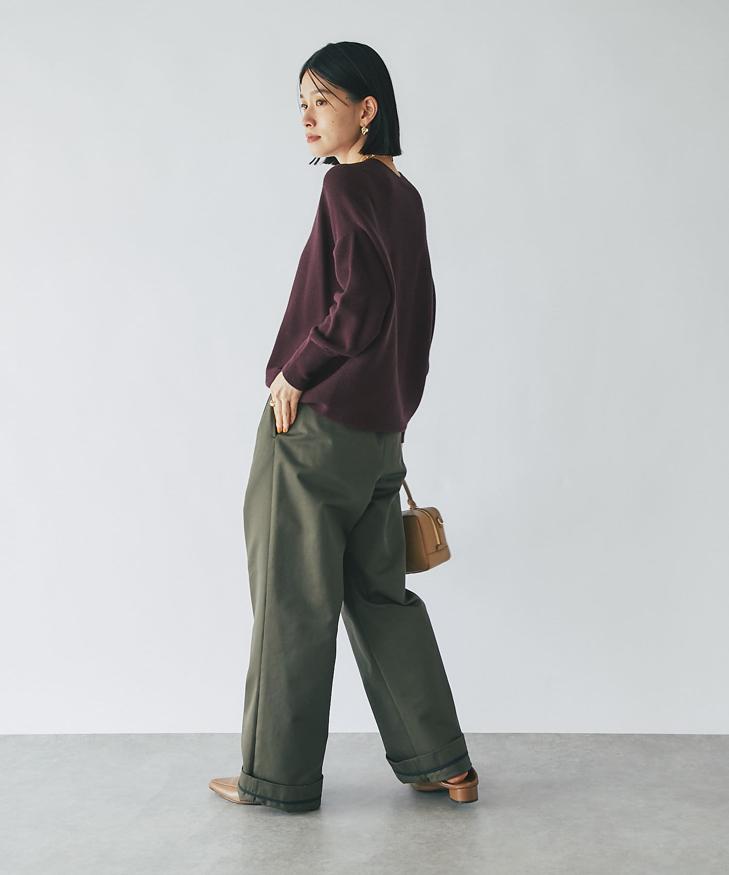 首元はVネックで顔回りをすっきりと見せつつ、バックスタイルは程よいボリューム感のあるシルエットで体のラインを拾わない嬉しいポイントも。