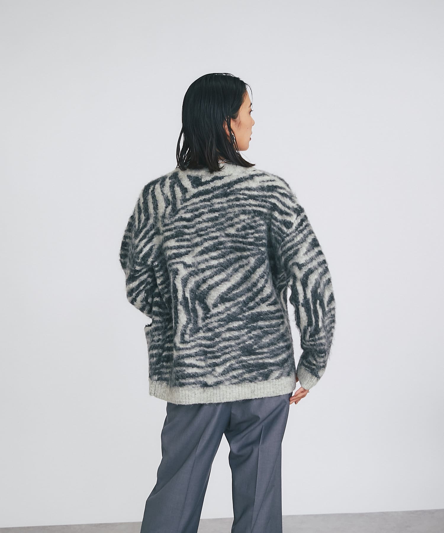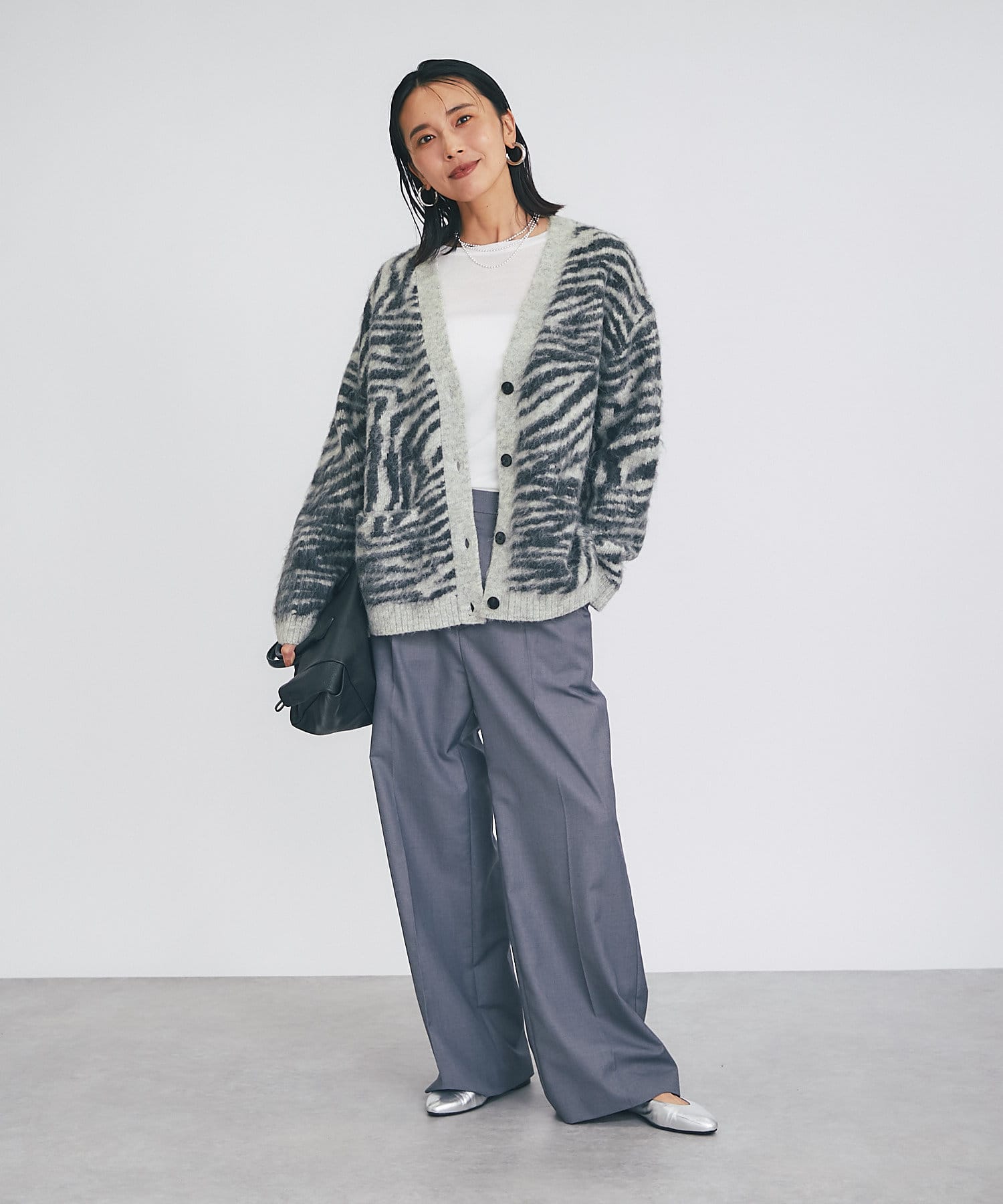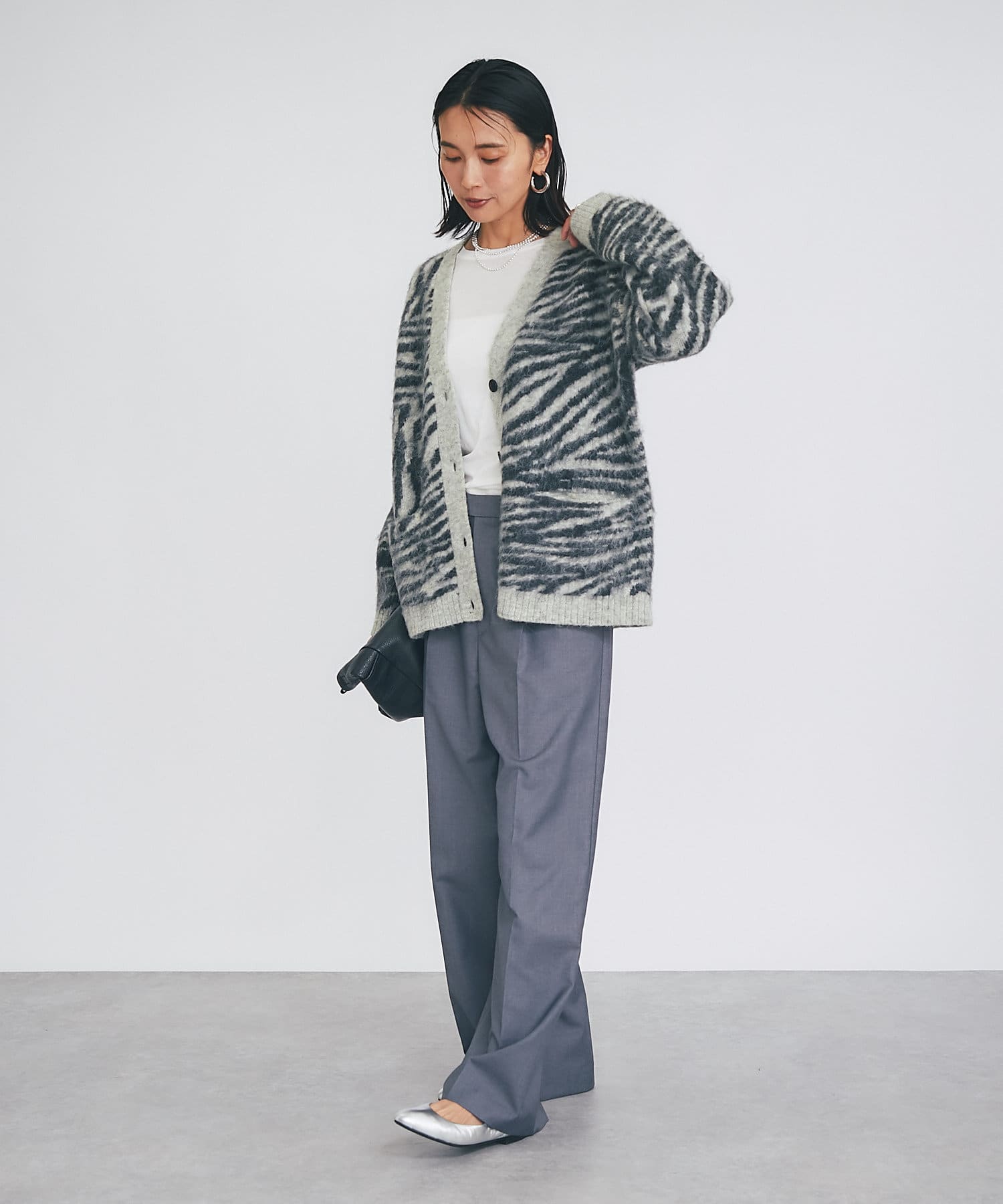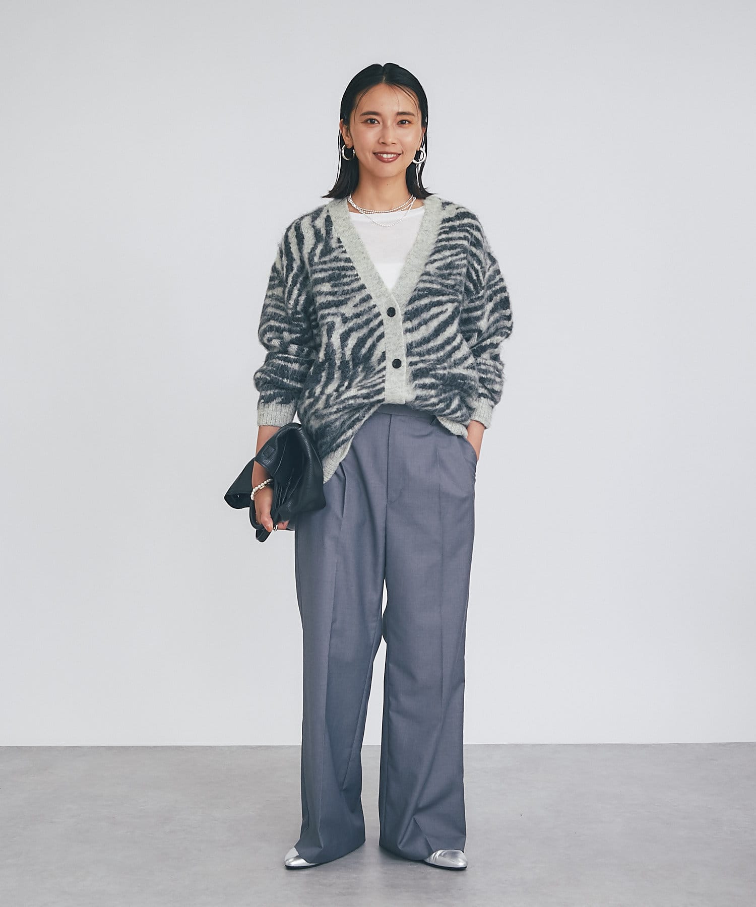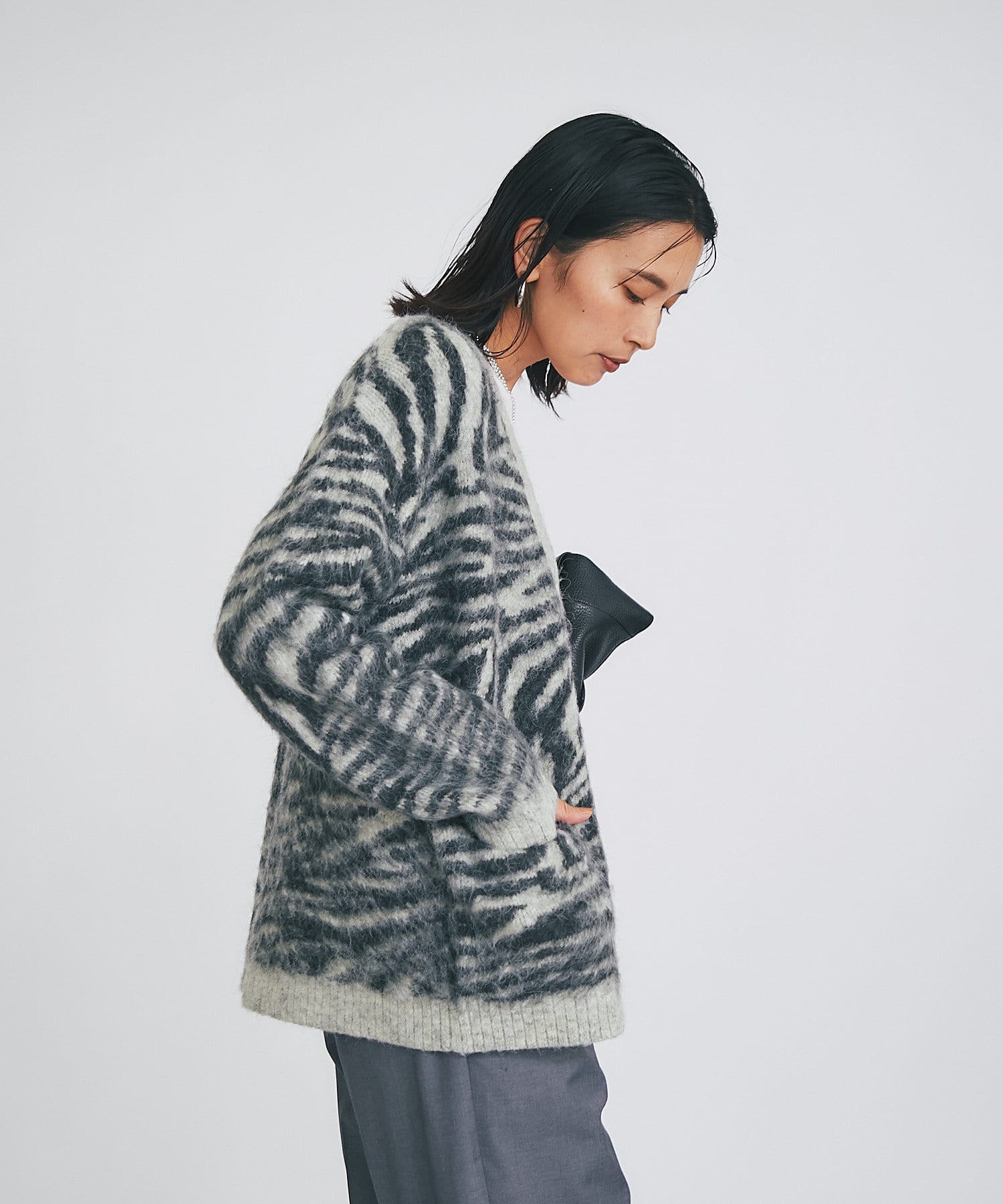 ゼブラ柄が目を惹くデザイン。インパクト強めなゼブラ柄も、ウールなどのふわっとした素材を盛り込むことで