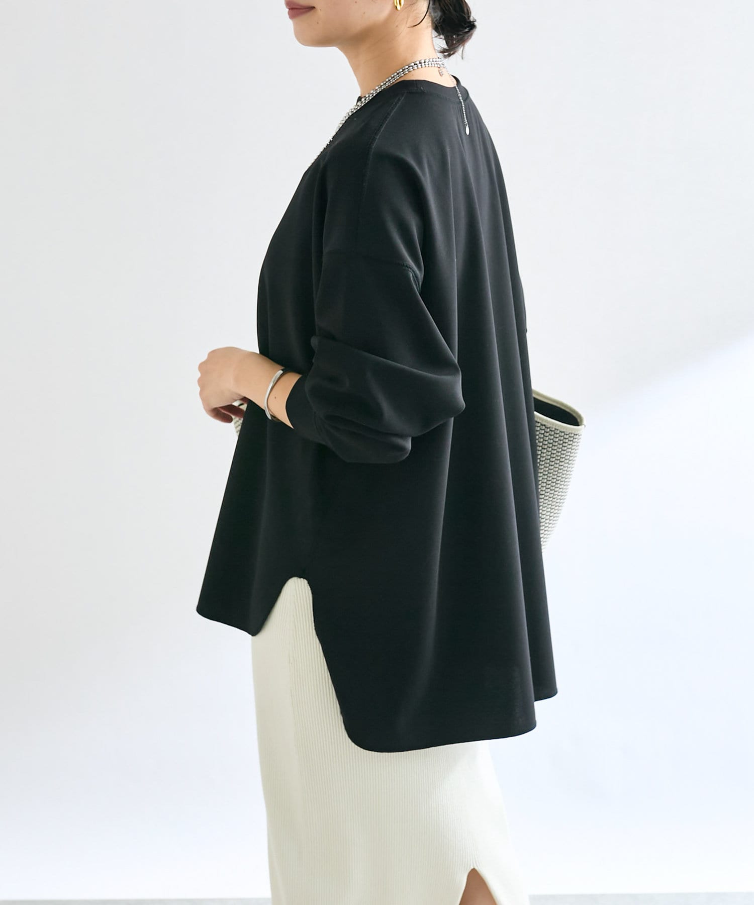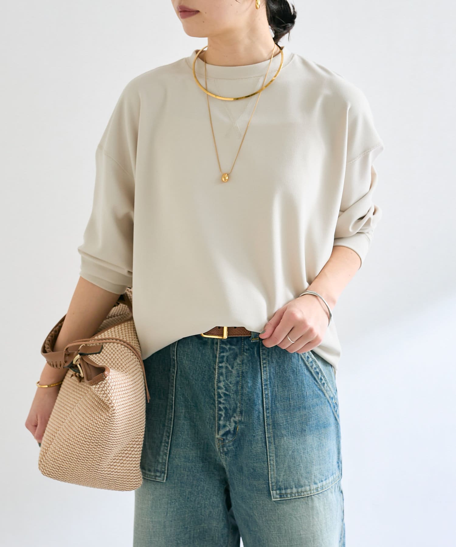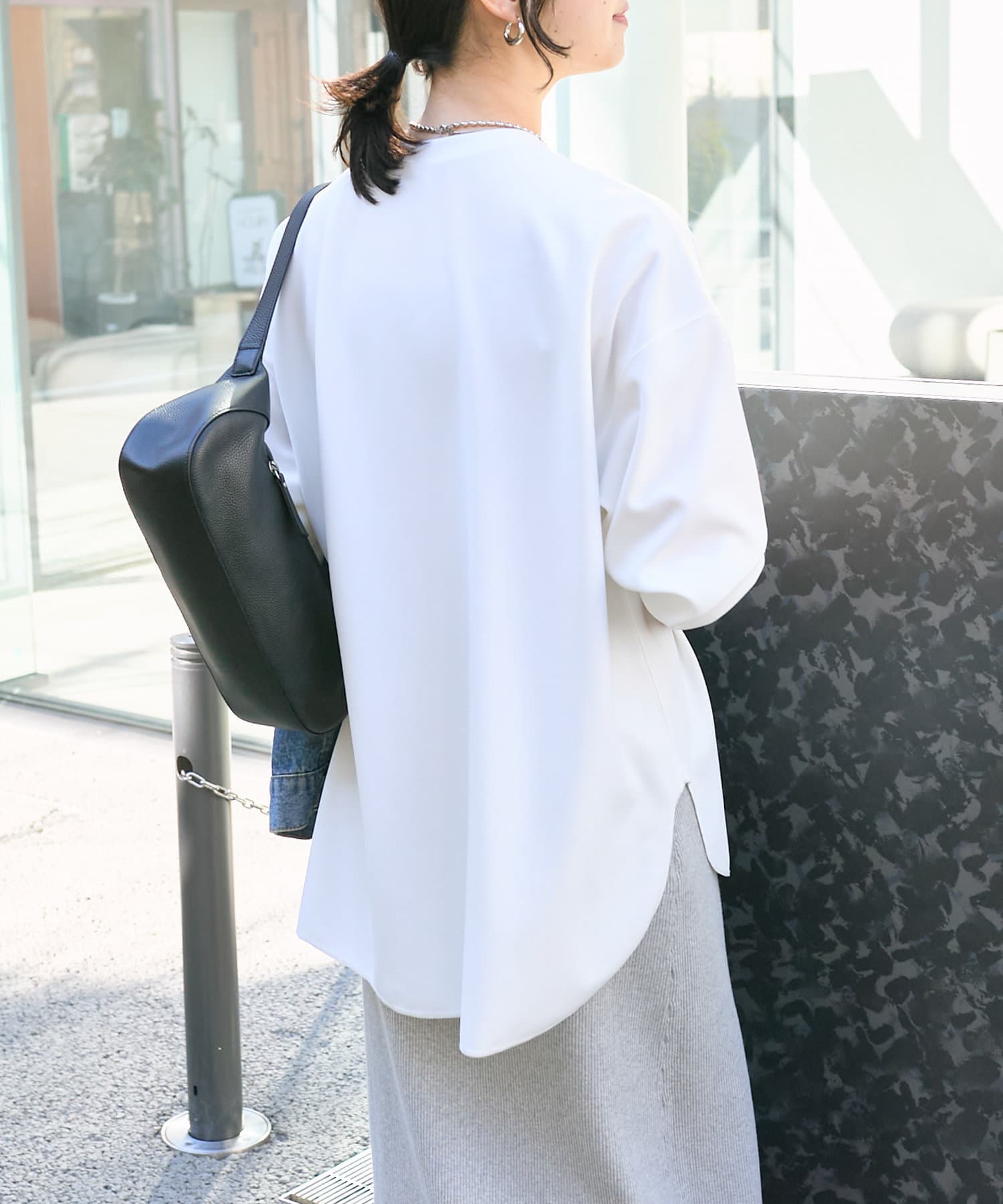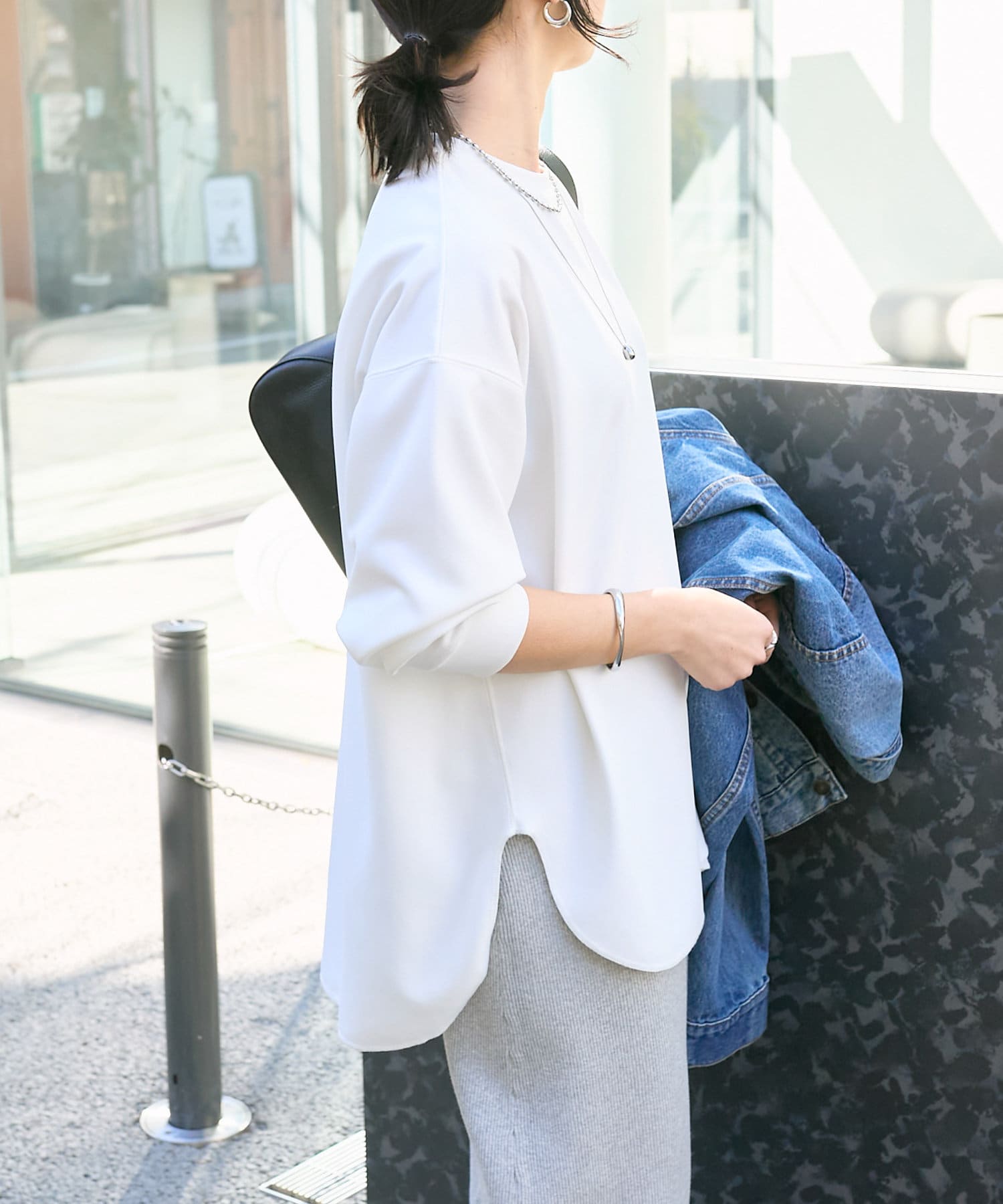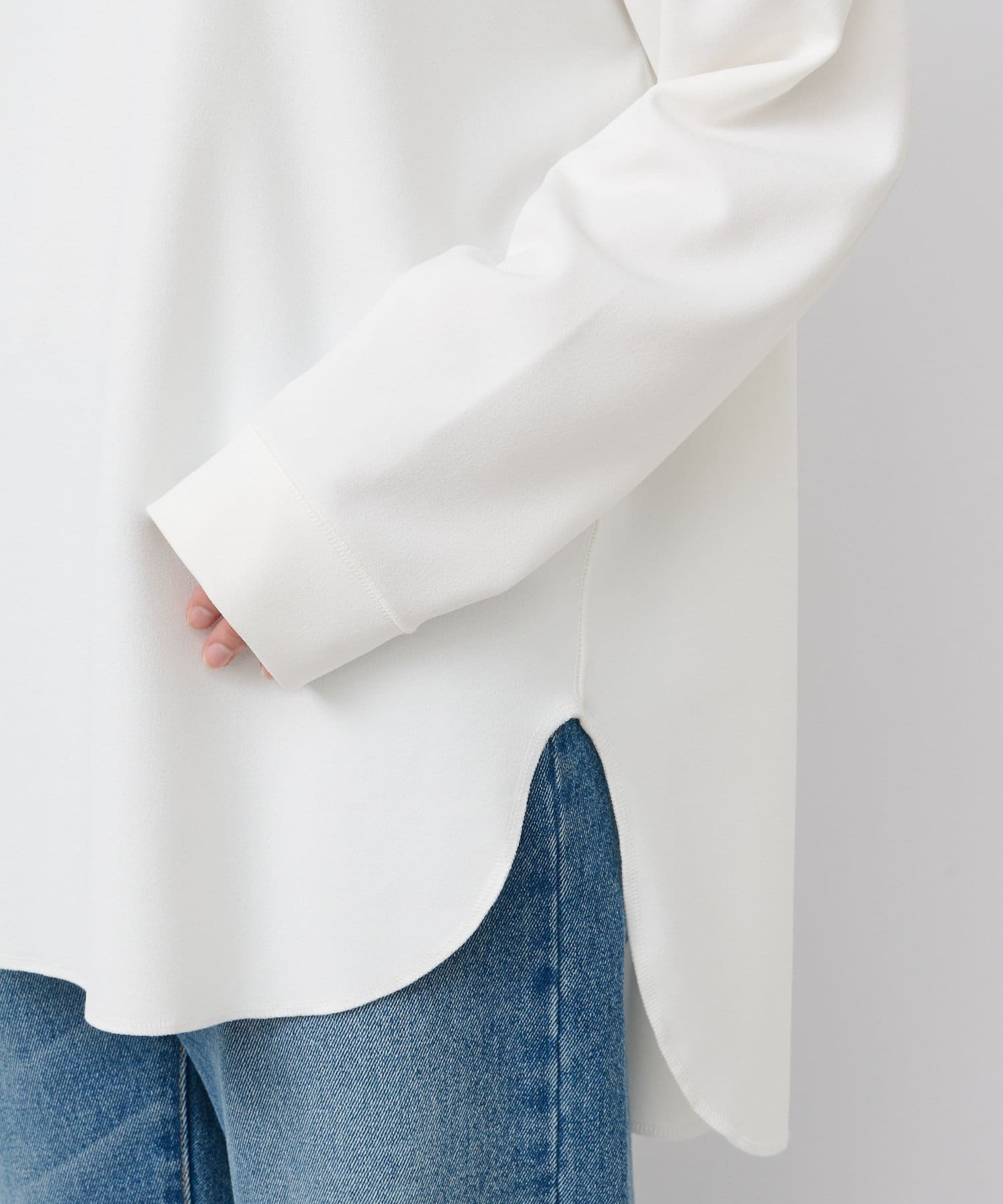 カットソーのようにイージーな着心地でありながらキレイ見えするサラッとした素材感で、着用するシーンを問わずお使いいただけます。
