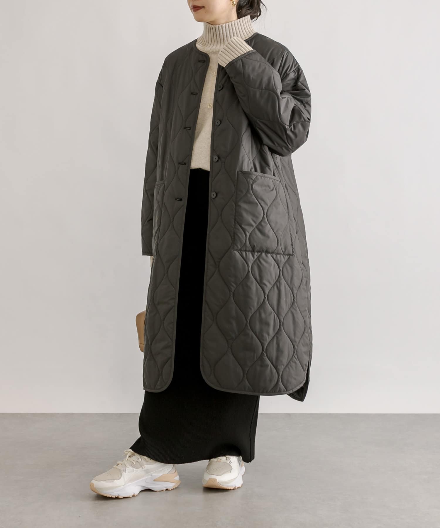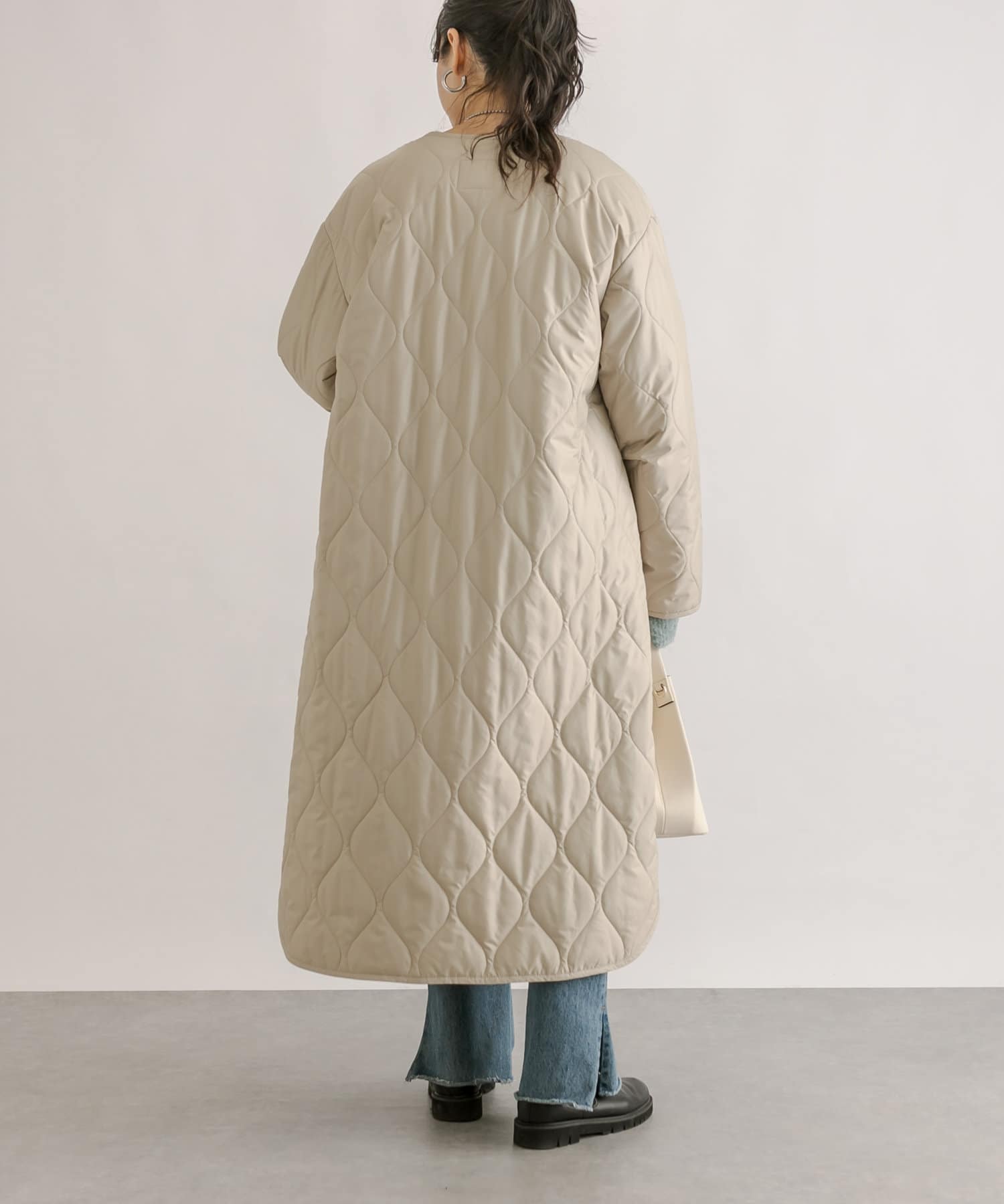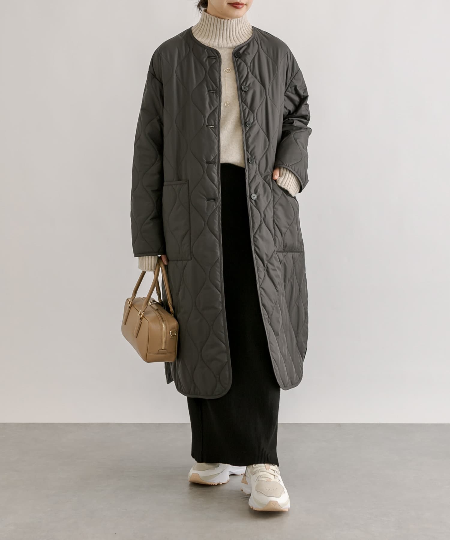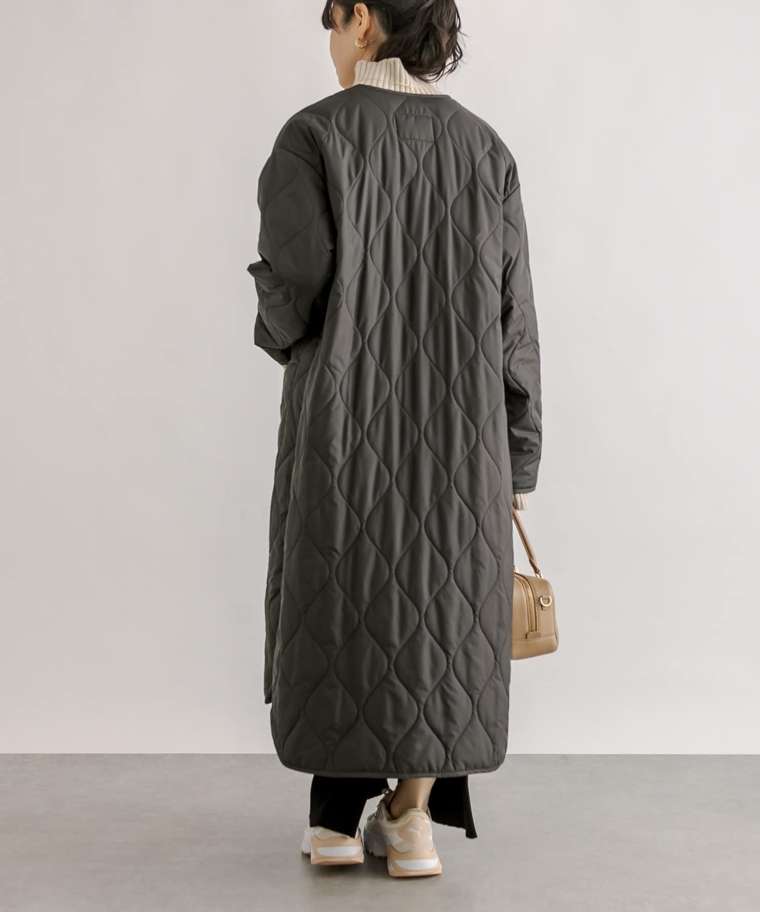 軽くやわらかい風合いの断熱中綿を使用したロングキルティングコート。
