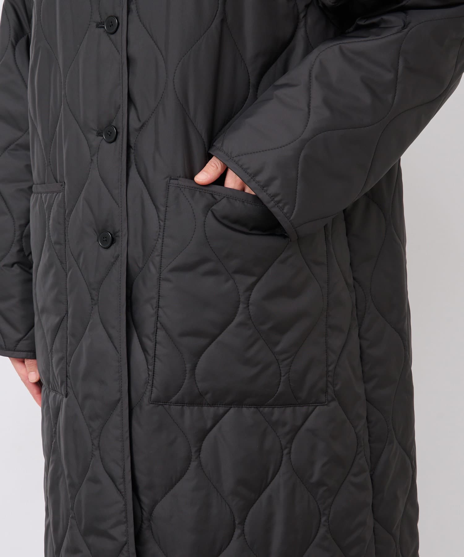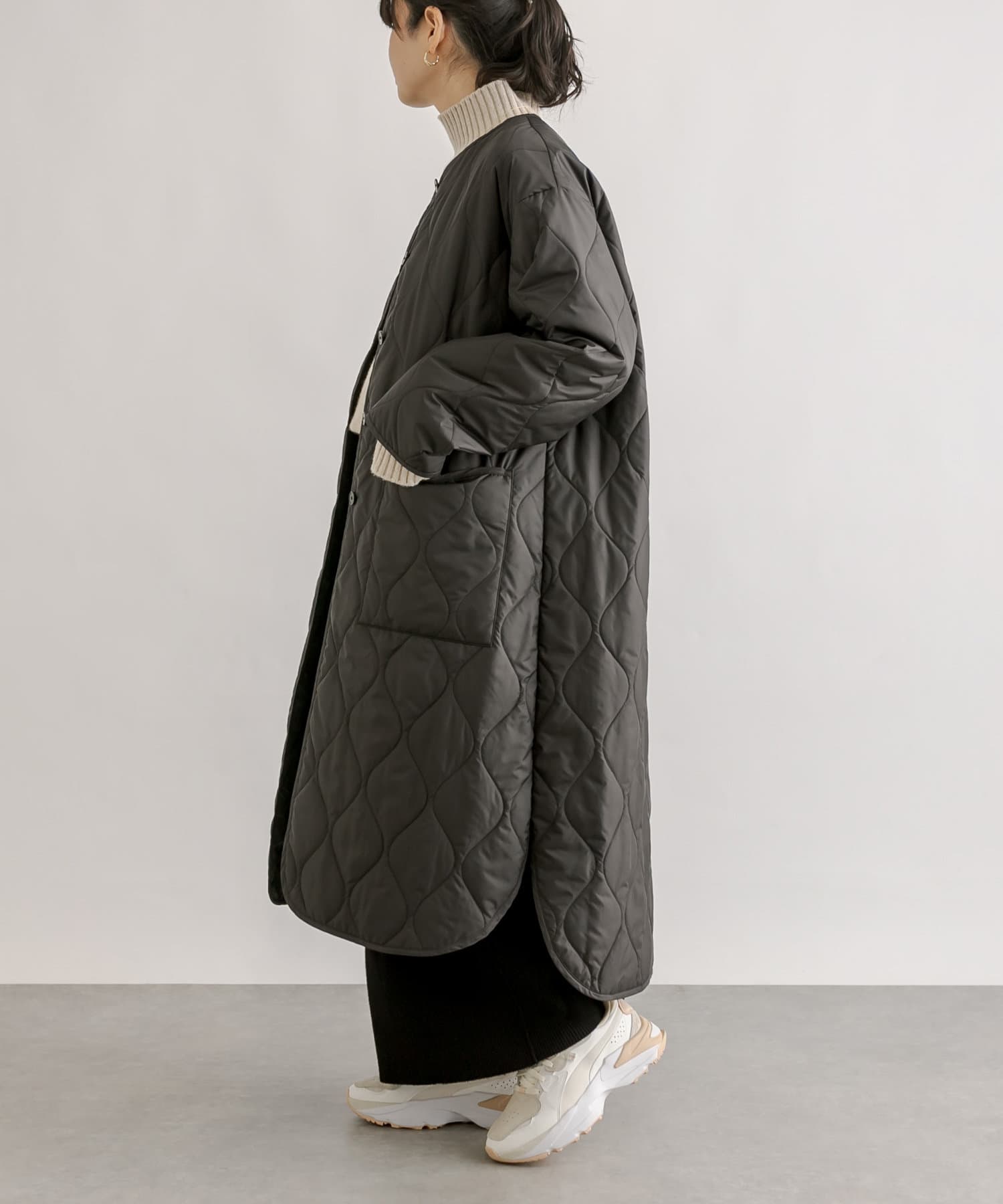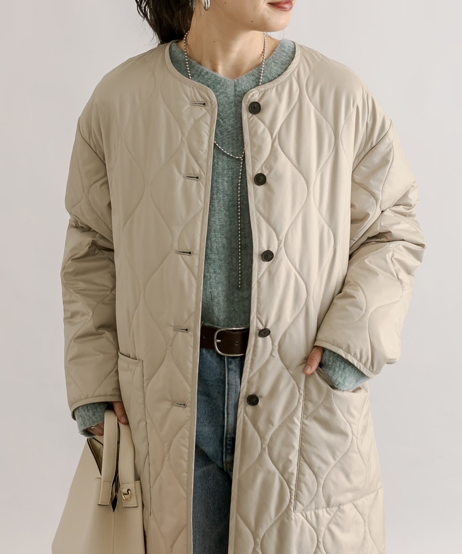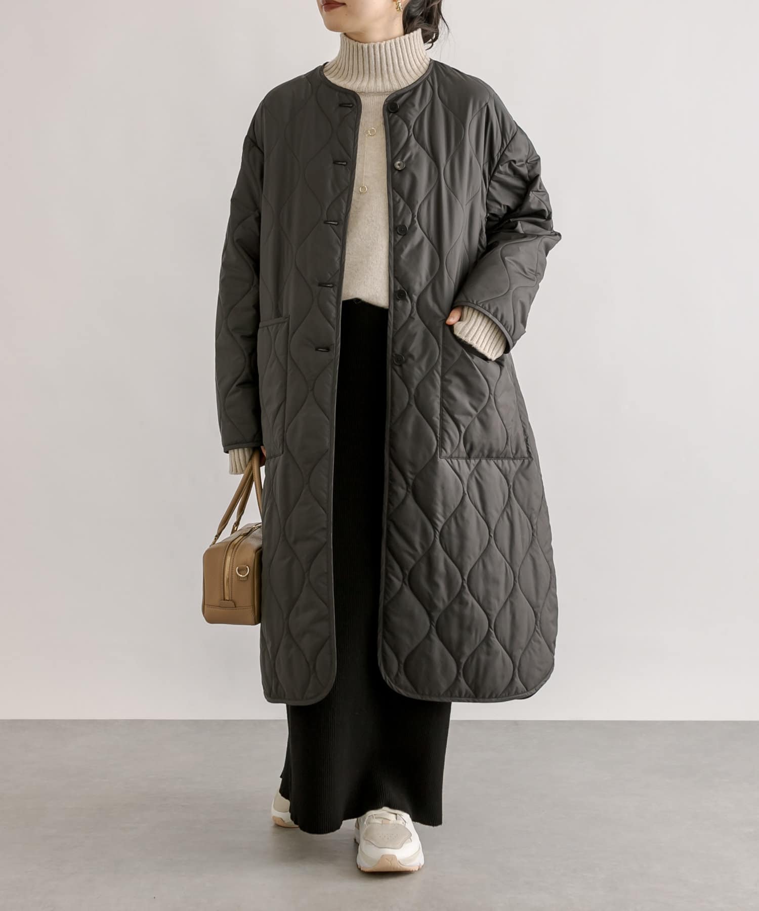 軽くやわらかい風合いの断熱中綿を使用したロングキルティングコート。