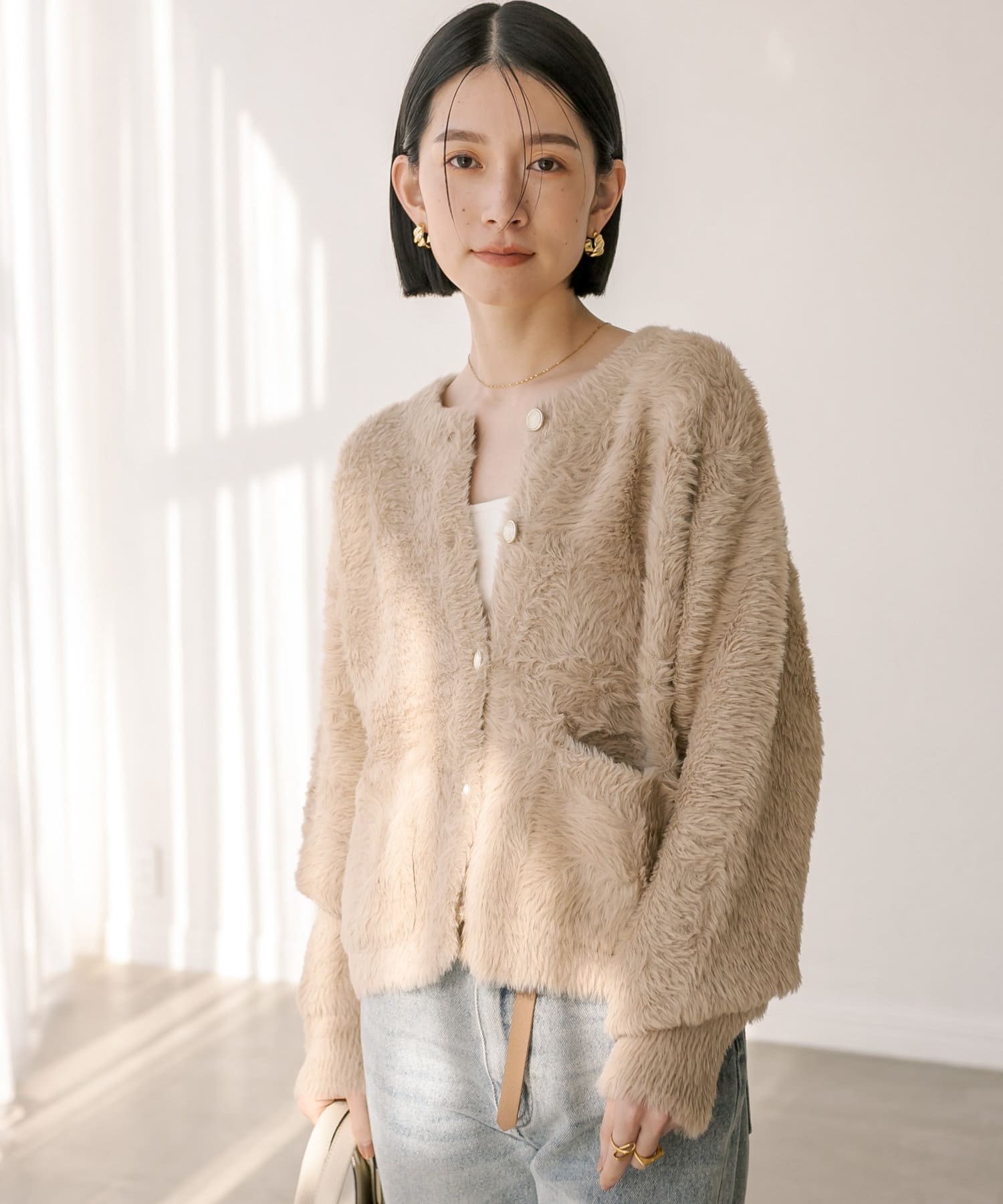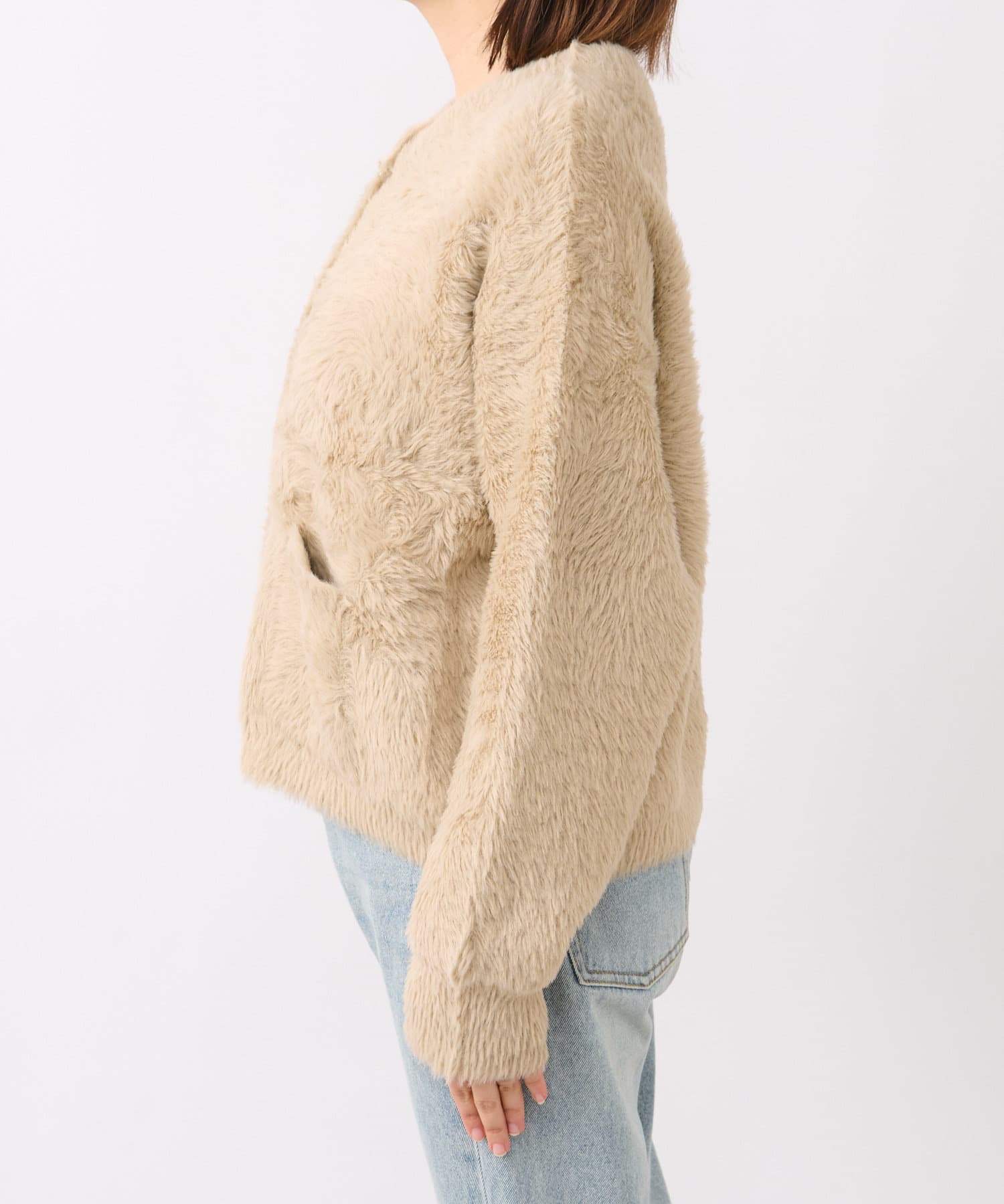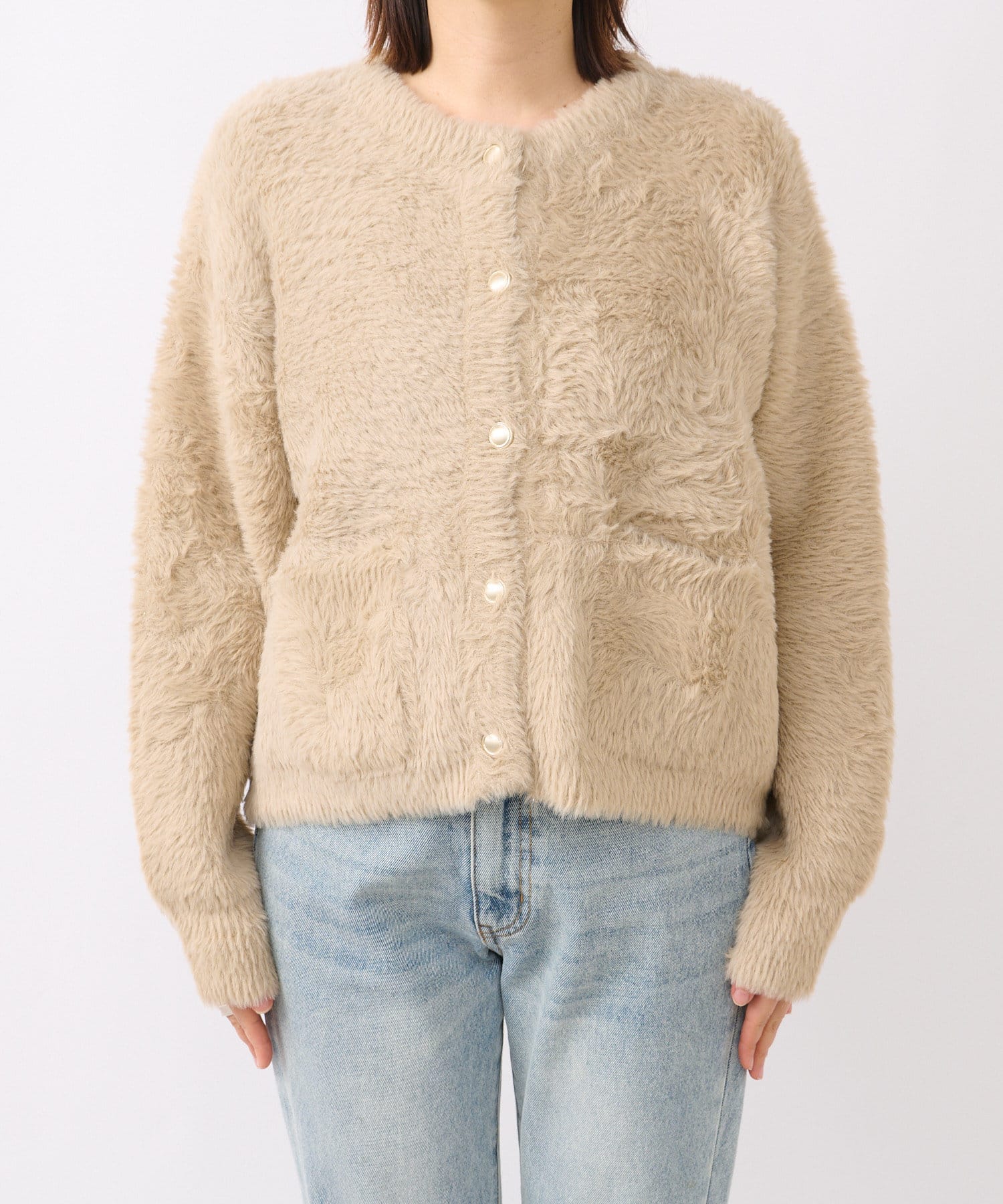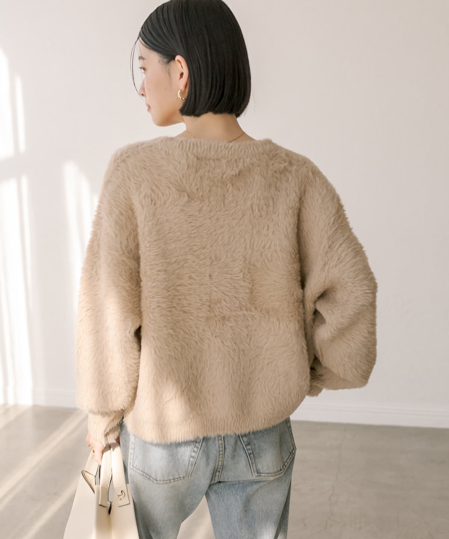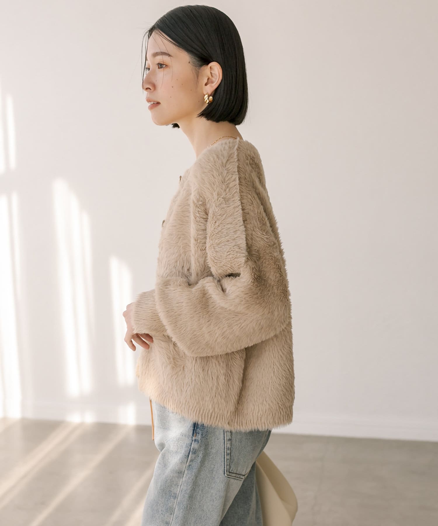 毛足のあるふわふわのフェザーヤーンにラメ糸をMIXした、トレンド感満載のカーディガン。